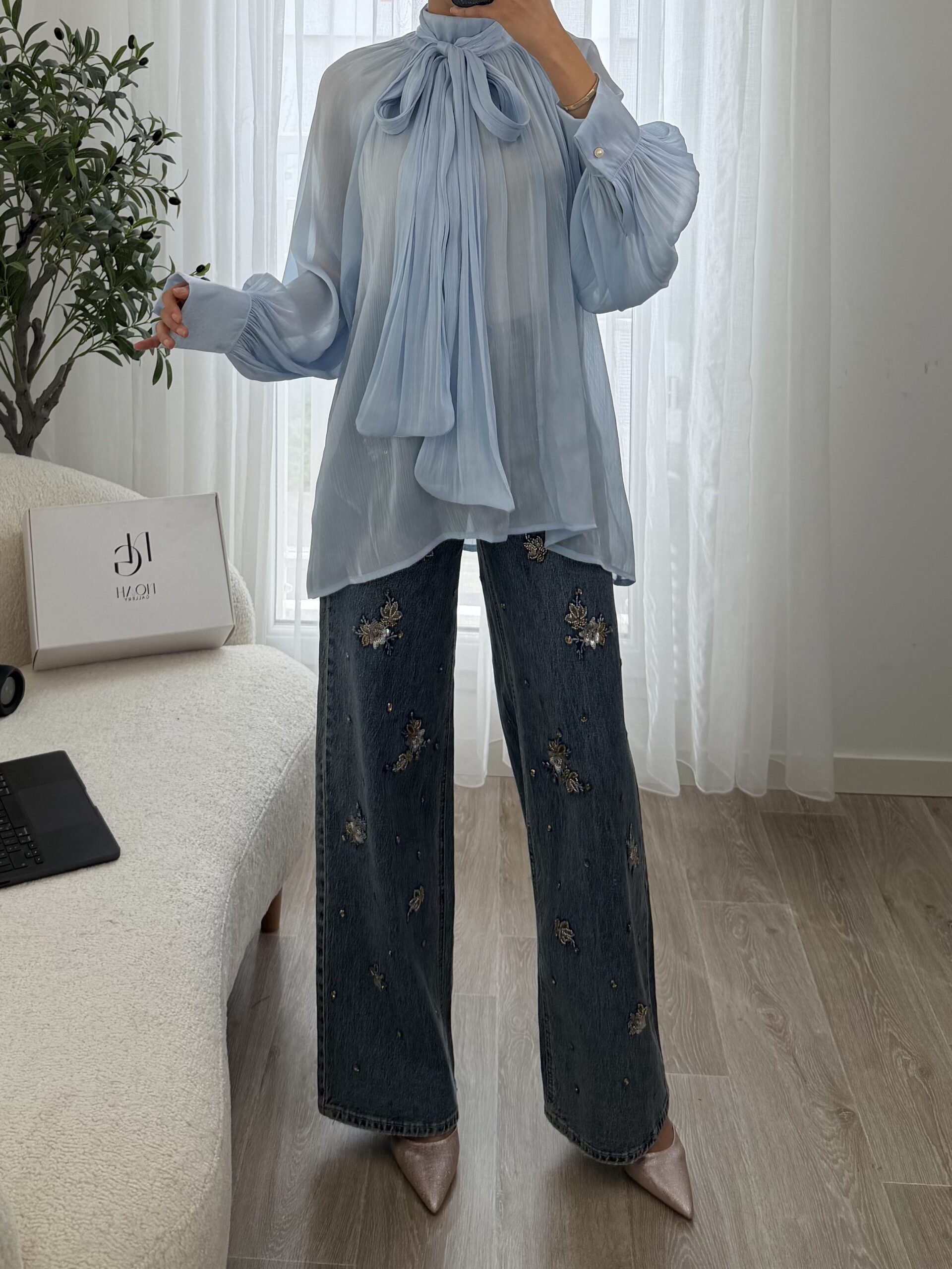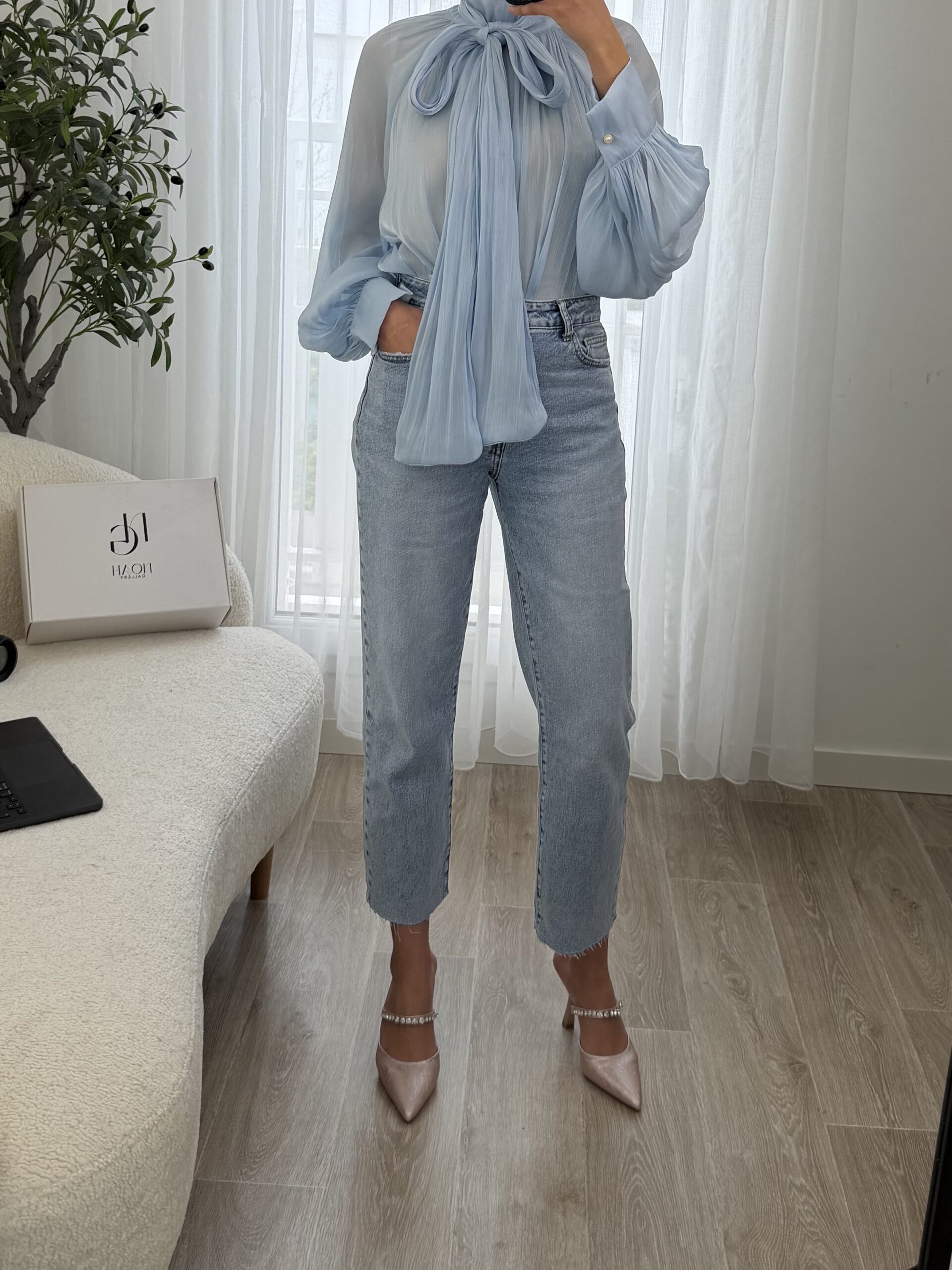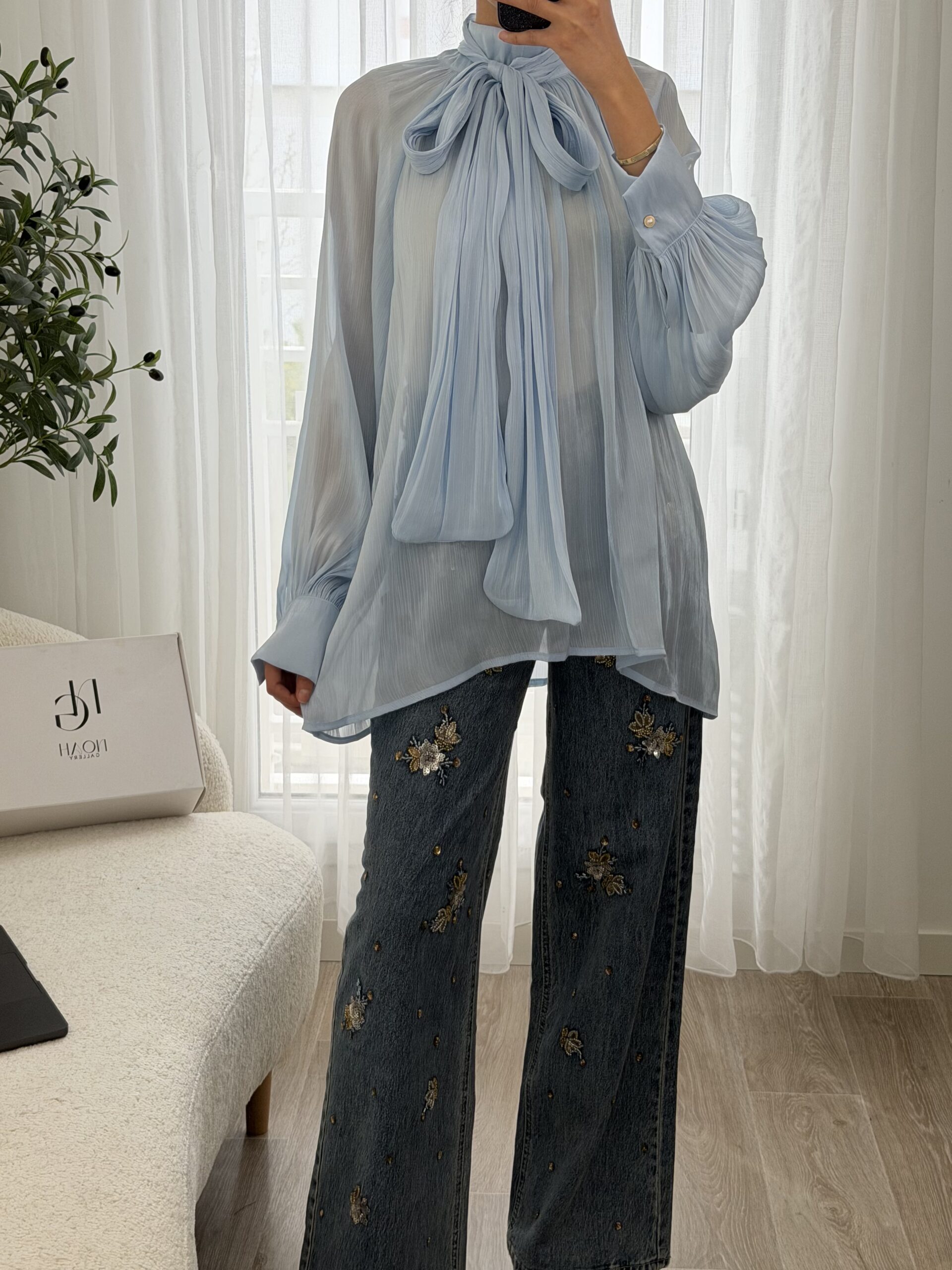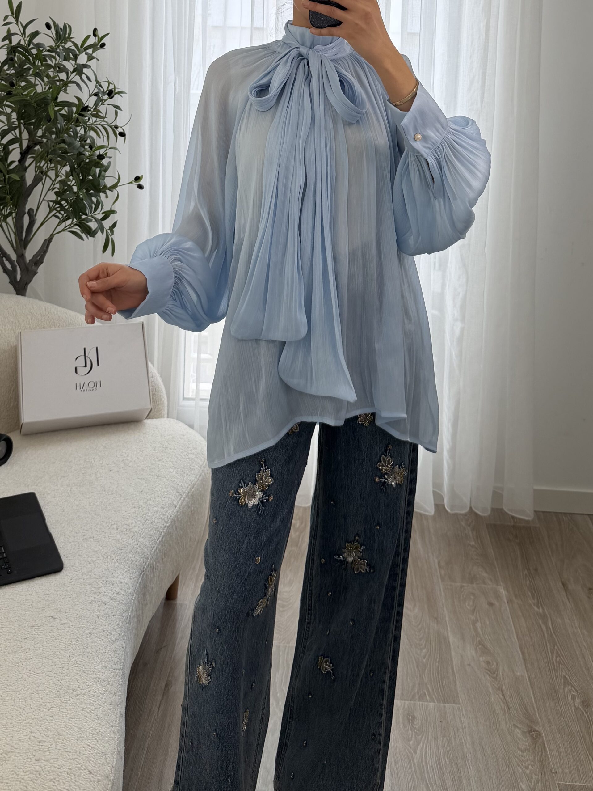Blouse raffinée en voile léger dans un délicat bleu ciel, sublimée par un élégant col lavallière à nouer qui apporte une touche chic et féminine. Sa coupe fluide et ses manches longues légèrement bouffantes avec poignets boutonnés offrent un tombé élégant et confortable.