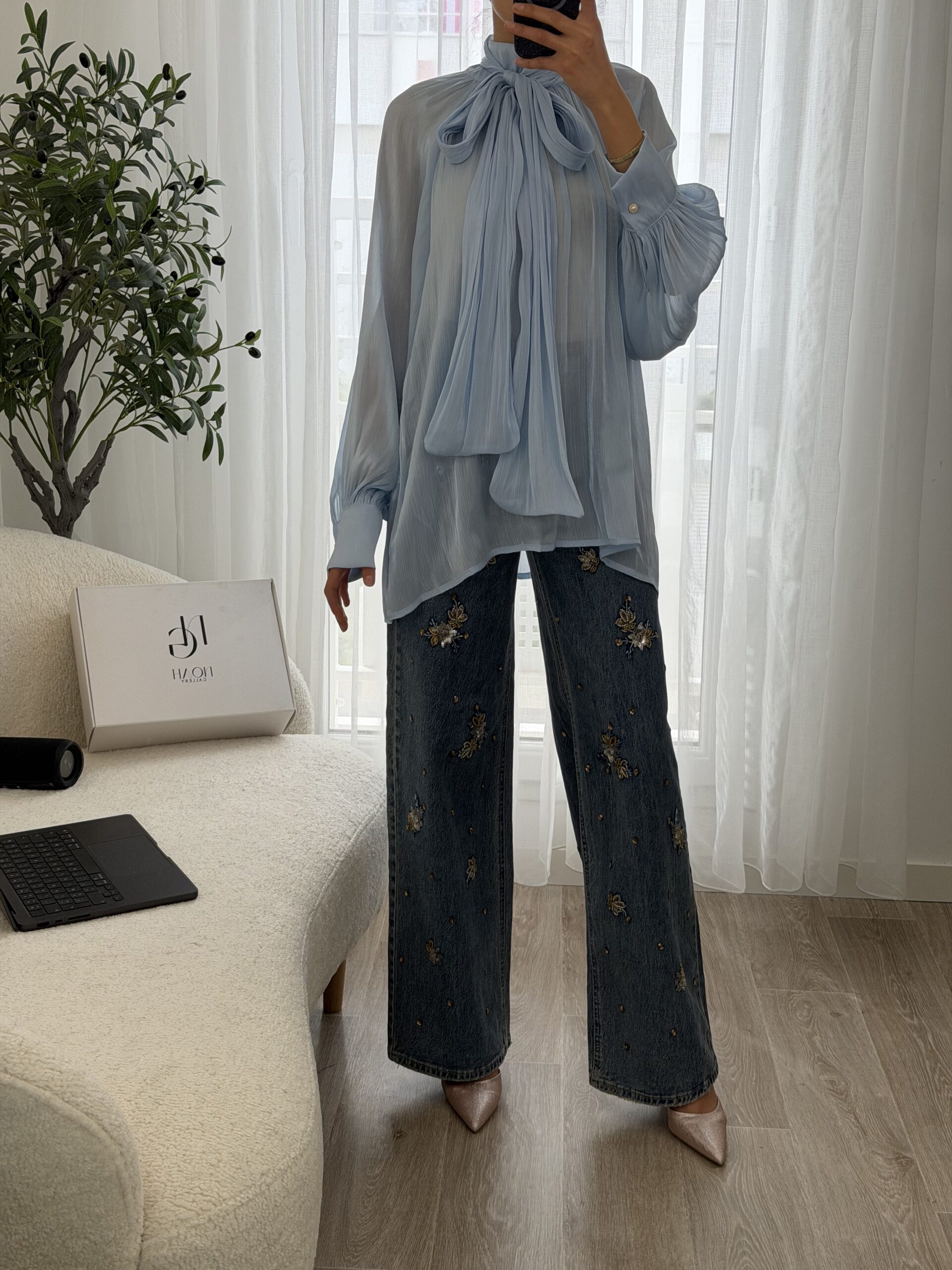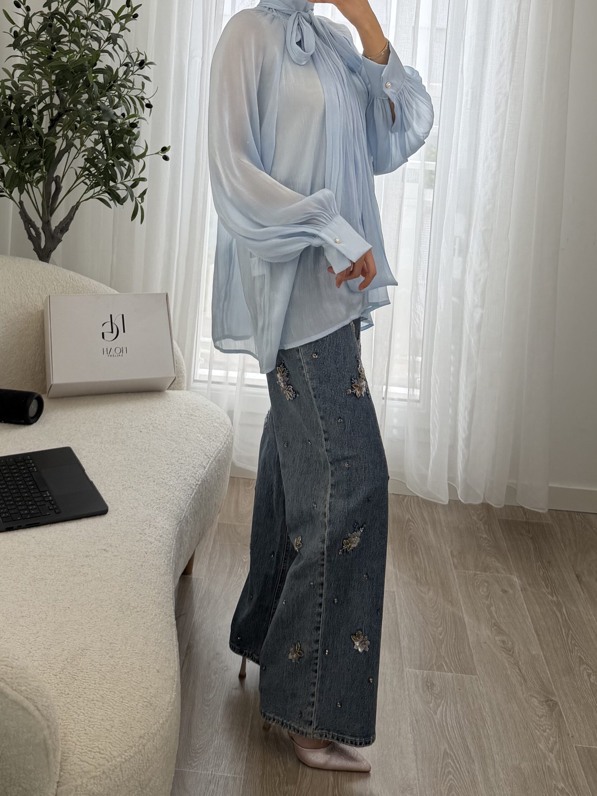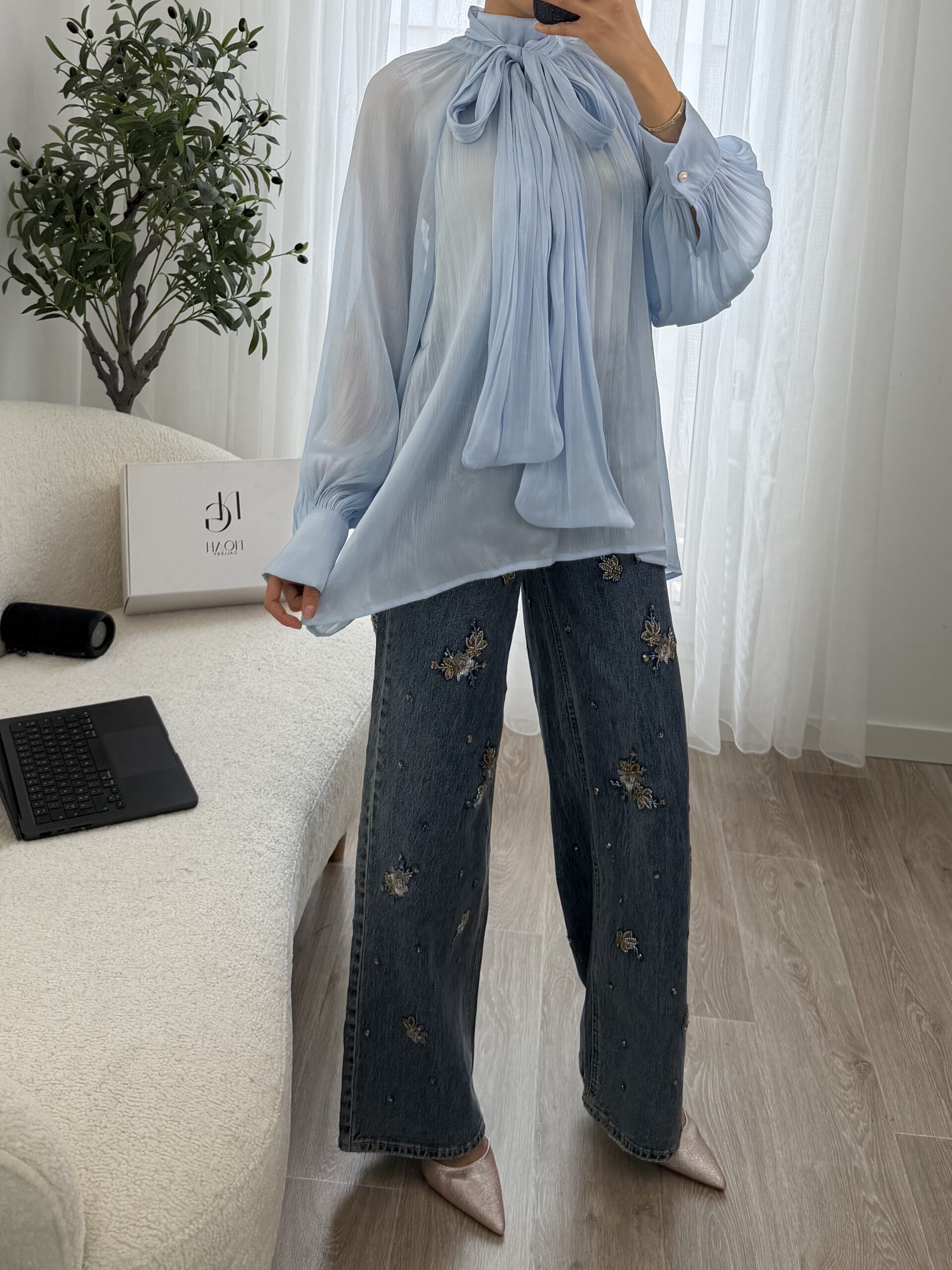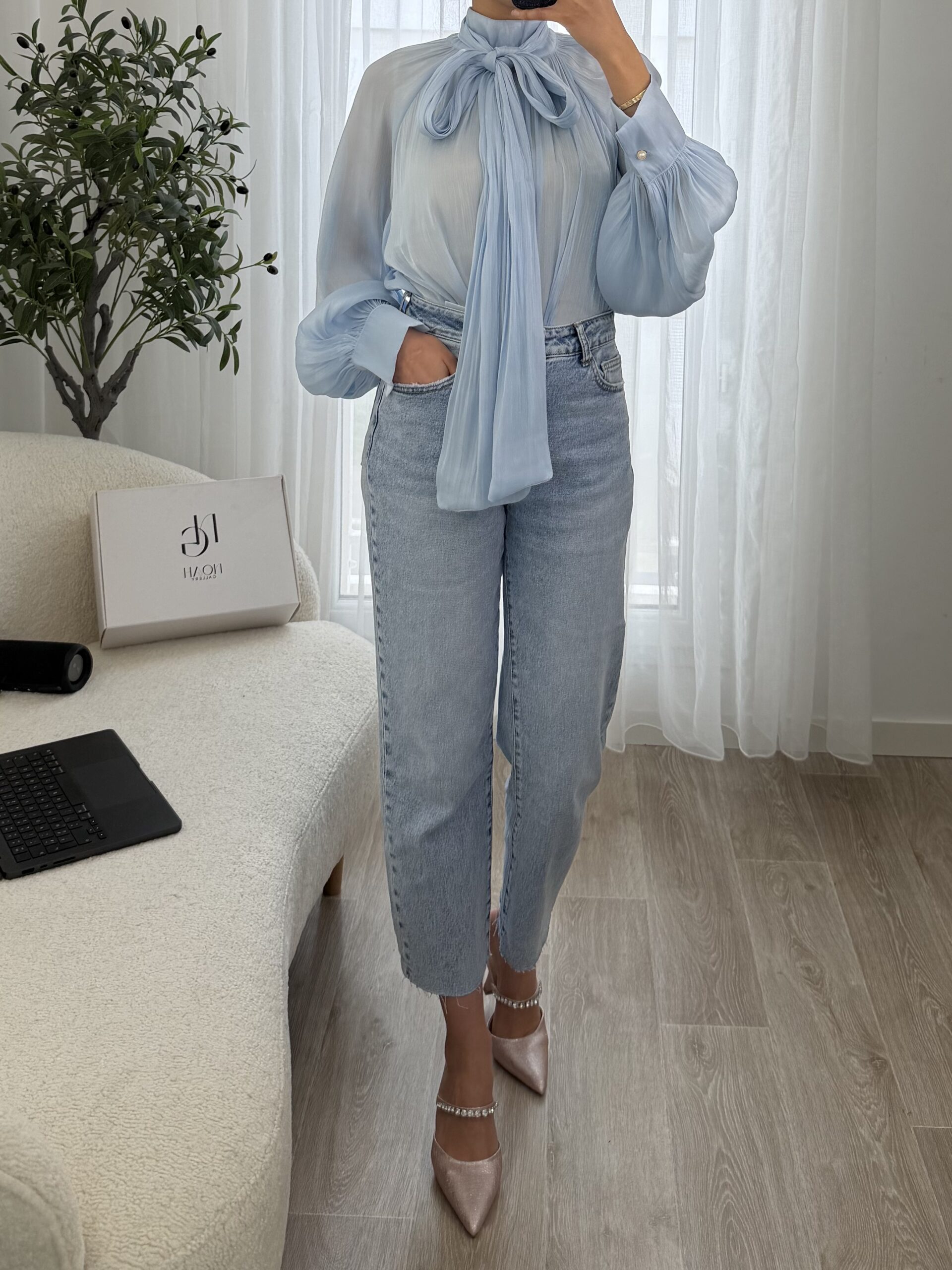 Blouse raffinée en voile léger dans un délicat bleu ciel, sublimée par un élégant col lavallière à nouer qui apporte une touche chic et féminine. Sa coupe fluide et ses manches longues légèrement bouffantes avec poignets boutonnés offrent un tombé élégant et confortable.