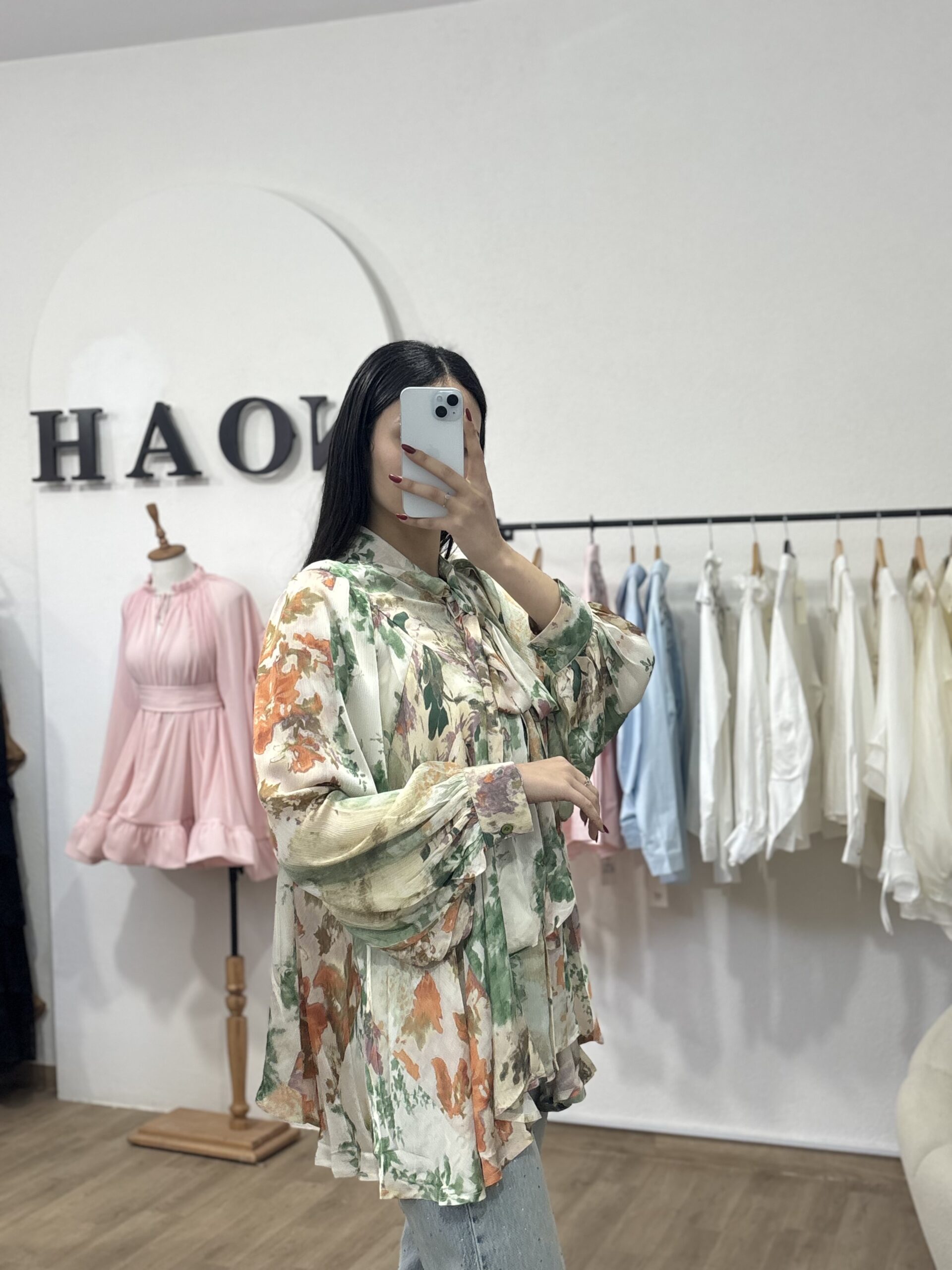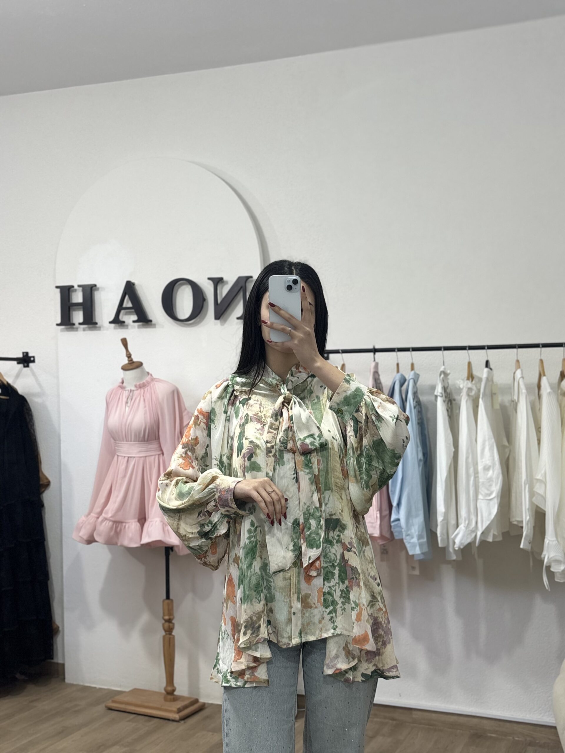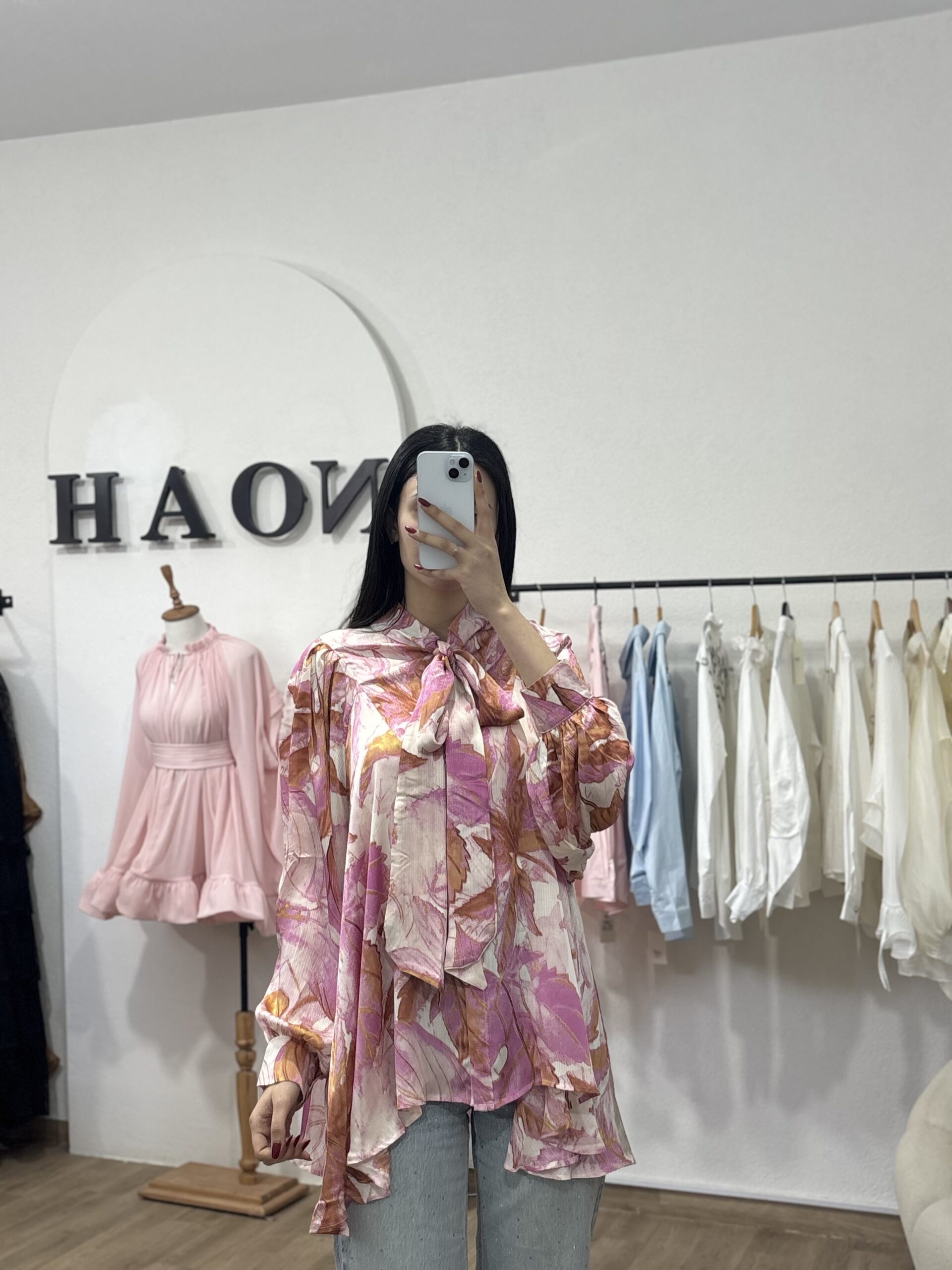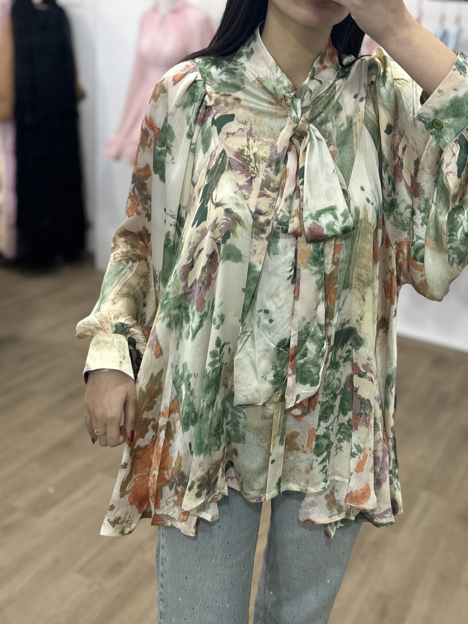 Blouse fluide aux motifs floraux délicats, dotée d’un col lavallière pour une touche raffinée et féminine.