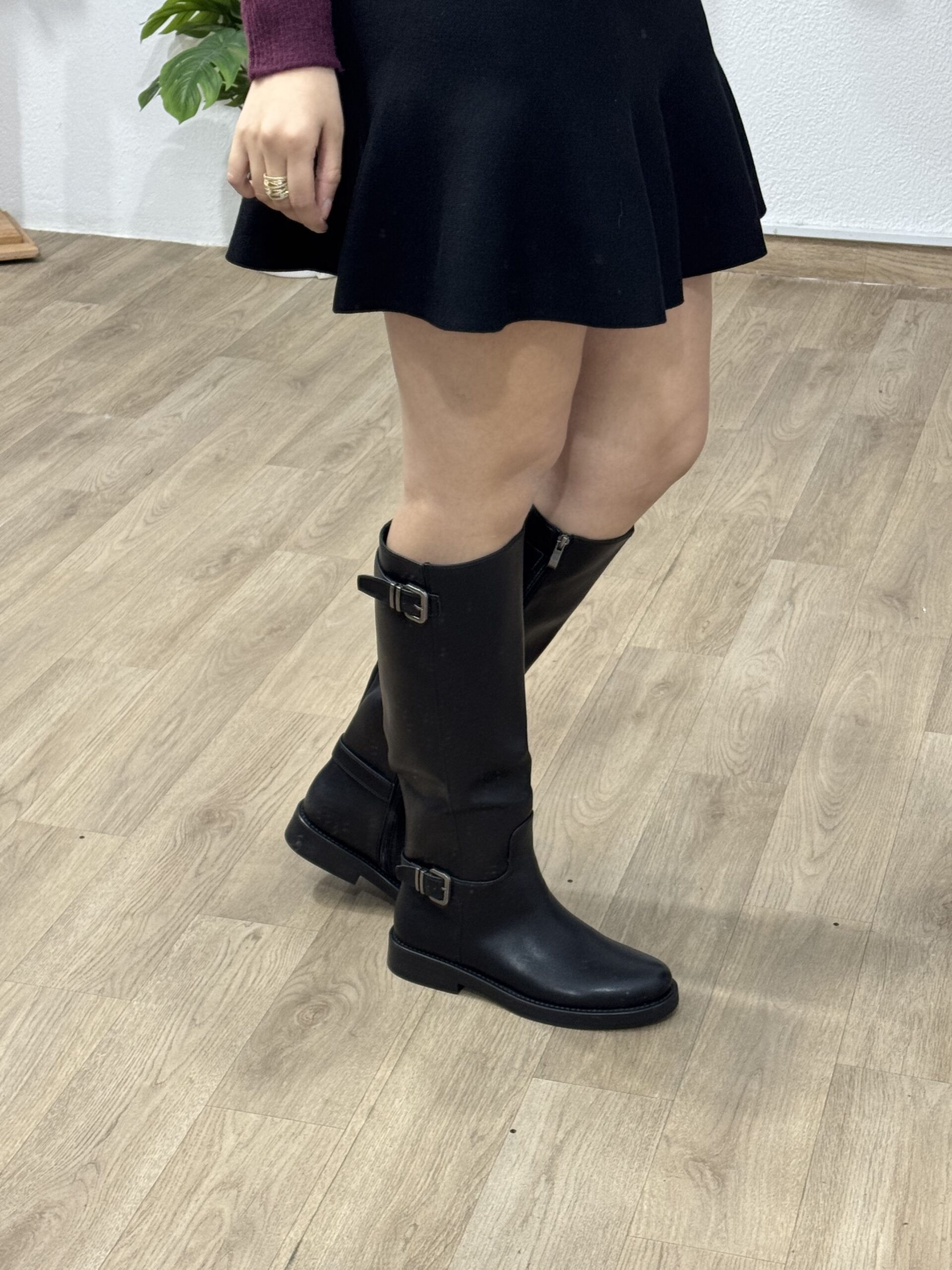 Adoptez un look chic et moderne avec ces bottes hautes noires au design épuré. Conçues pour allier style et confort, elles présentent une tige montante arrivant sous le genou et deux élégantes boucles métalliques réglables, l’une à la cheville et l’autre sur le haut de la botte. Leur semelle plate et robuste assure une démarche stable, idéale pour un usage quotidien.