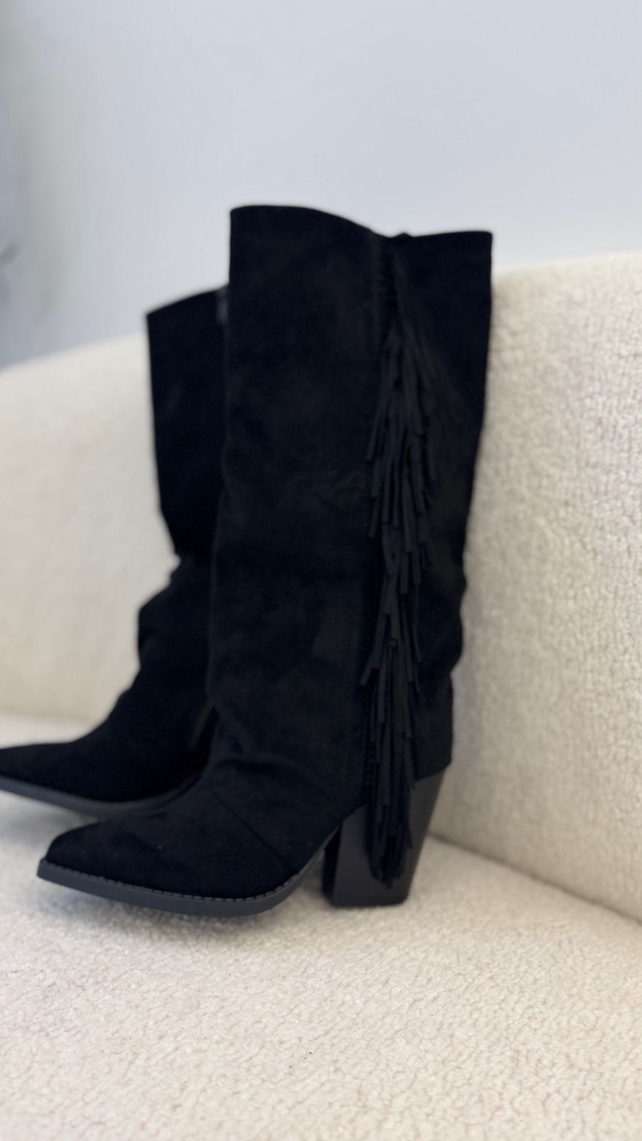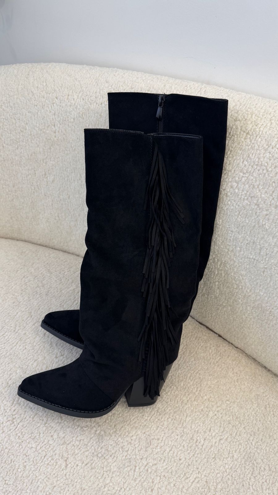Ces bottes western suédées à franges apportent une touche tendance et audacieuse à n’importe quelle tenue. Leur matière douce façon daim et leurs franges latérales créent un effet chic et dynamique, parfait pour moderniser un look classique. Confortables, élégantes et faciles à assortir, elles sont idéales pour donner du caractère à vos tenues d’automne et d’hiver.