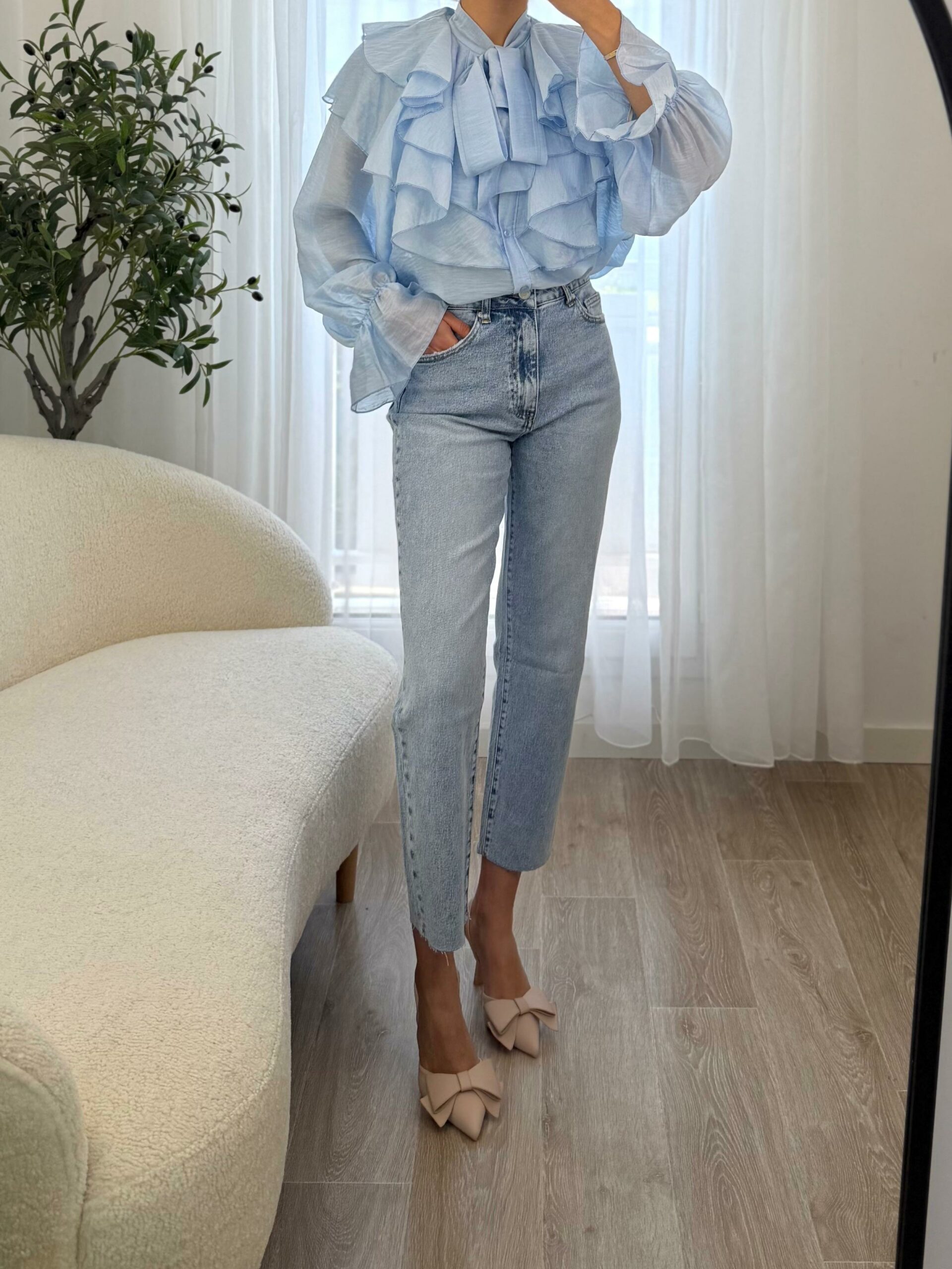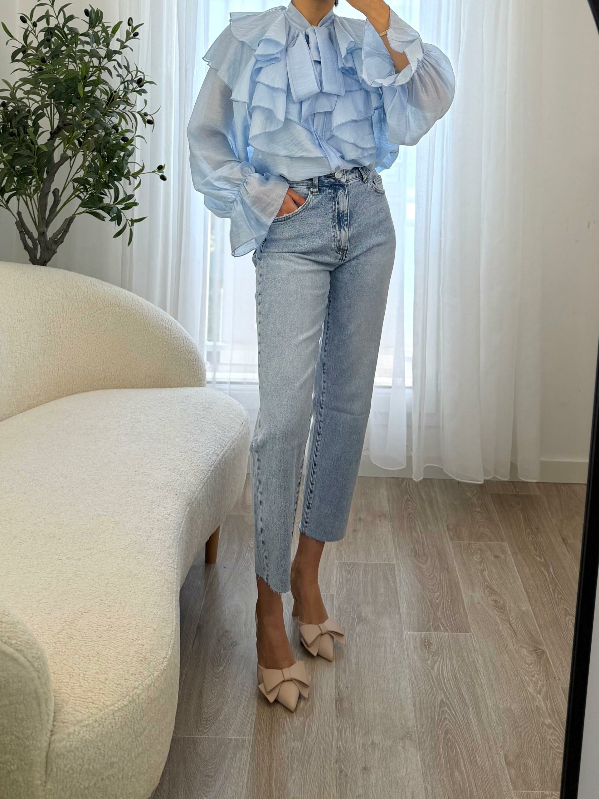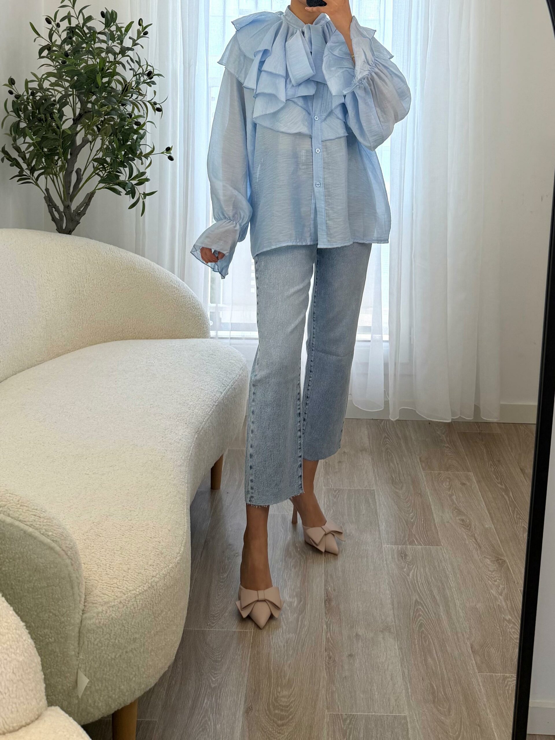 Chemise bleu ciel à l’allure délicate et raffinée, conçue pour apporter une touche de douceur et de féminité à chaque tenue. Ses volants élégants au col et sur le devant créent un effet fluide et aérien, tandis que le tissu léger assure un confort absolu tout au long de la journée. Les manches longues légèrement bouffantes ajoutent du caractère et de la modernité à la coupe. Facile à associer avec un jean ou un pantalon clair, c’est une pièce chic et intemporelle, idéale pour un look élégant sans effort. 💙✨