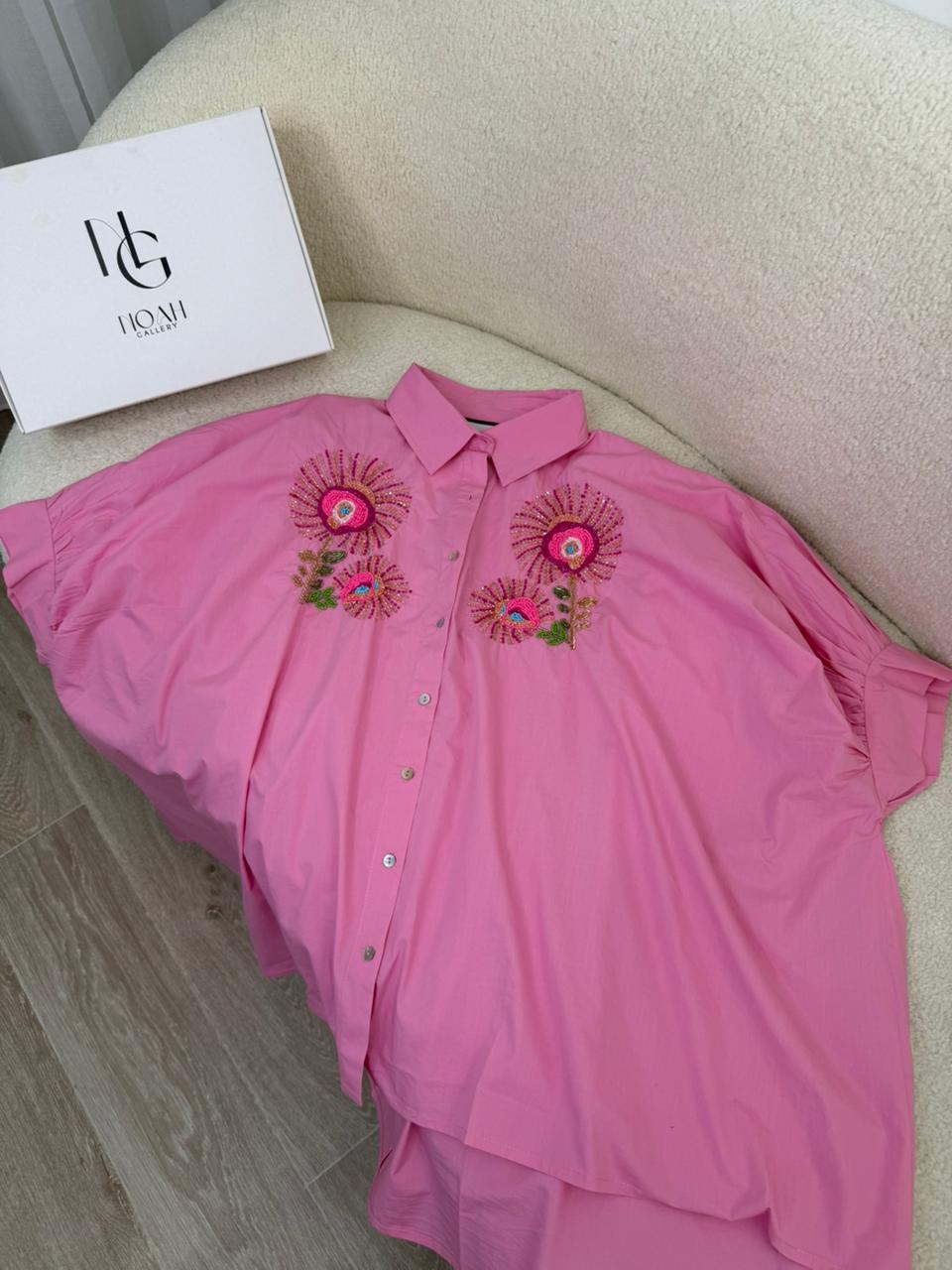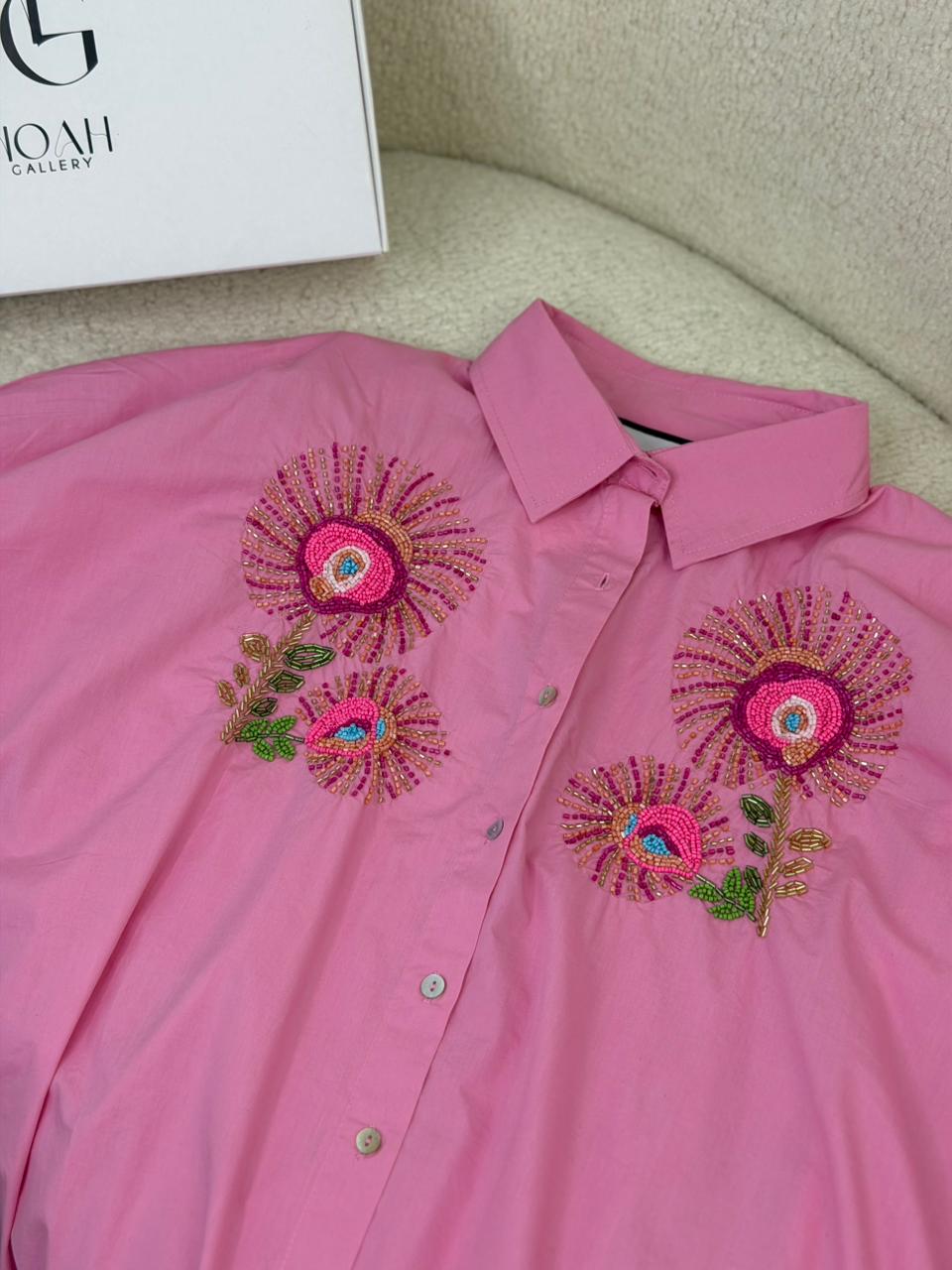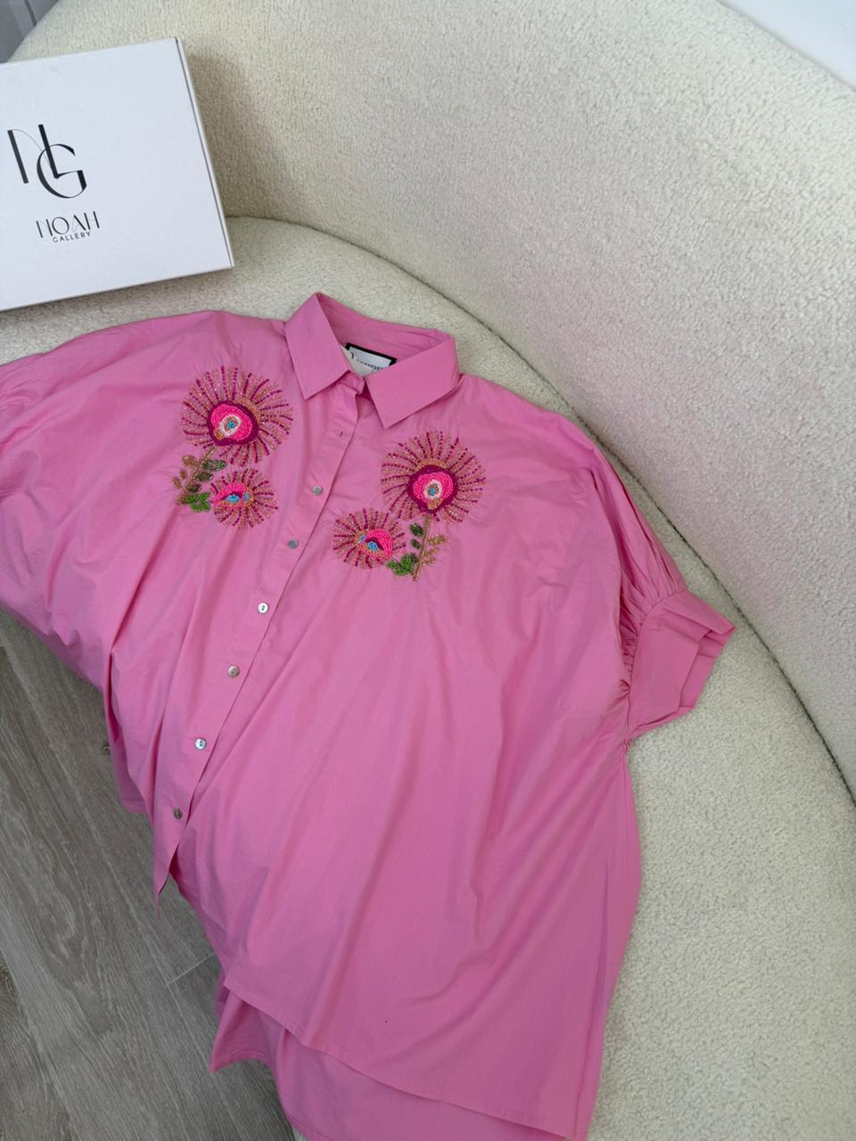 Cette chemise se distingue par sa magnifique couleur rose et ses superbes motifs brodés à la main, qui lui apportent une touche unique et artisanale. Sa coupe oversize offre un style moderne et tendance tout en garantissant un confort optimal. Confectionnée dans un tissu léger avec un tombé élégant, elle se porte facilement avec un jean ou un pantalon chic pour un look féminin et raffiné. Une pièce originale qui combine élégance, confort et style pour une tenue qui ne passe pas inaperçue. ✨🌸