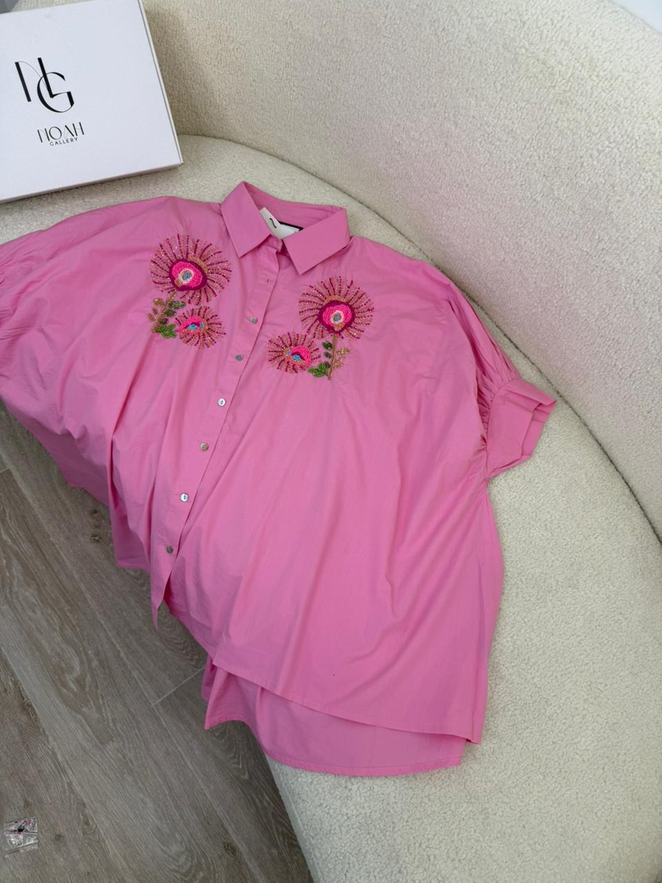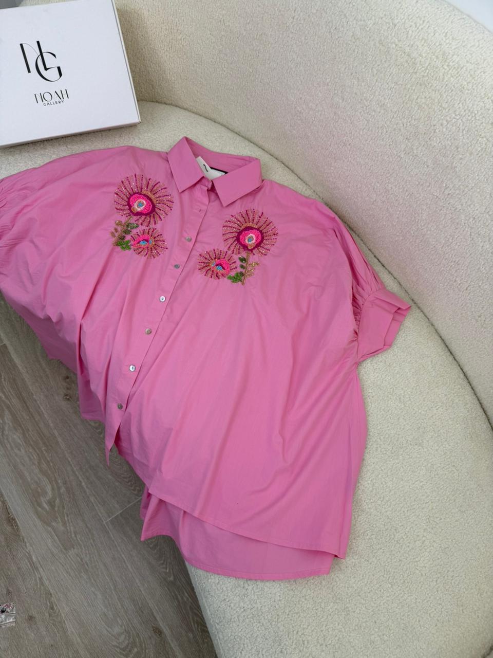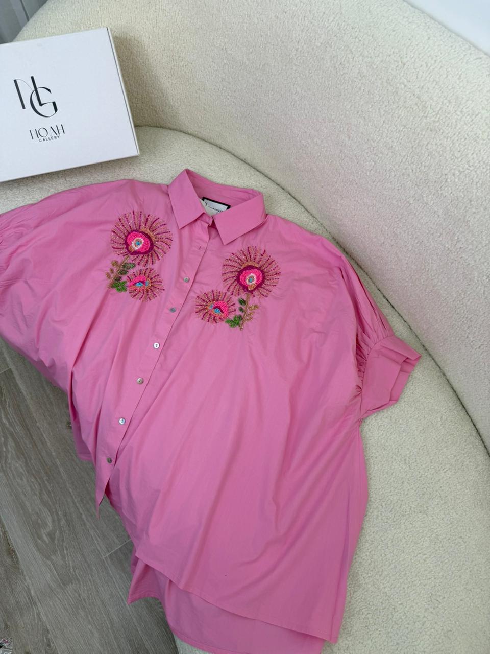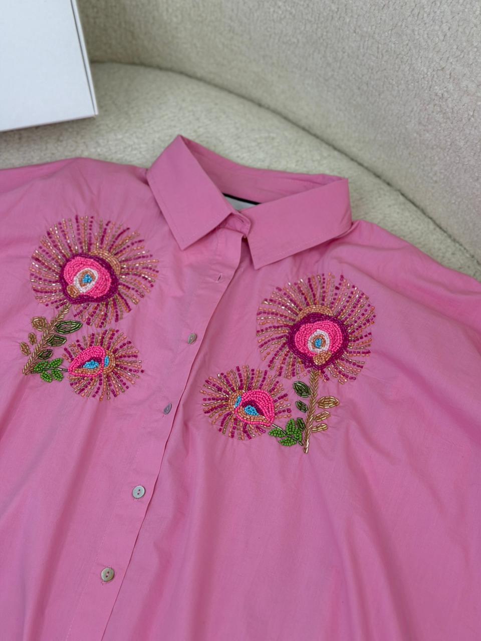 Cette chemise se distingue par sa magnifique couleur rose et ses superbes motifs brodés à la main, qui lui apportent une touche unique et artisanale. Sa coupe oversize offre un style moderne et tendance tout en garantissant un confort optimal. Confectionnée dans un tissu léger avec un tombé élégant, elle se porte facilement avec un jean ou un pantalon chic pour un look féminin et raffiné. Une pièce originale qui combine élégance, confort et style pour une tenue qui ne passe pas inaperçue. ✨🌸