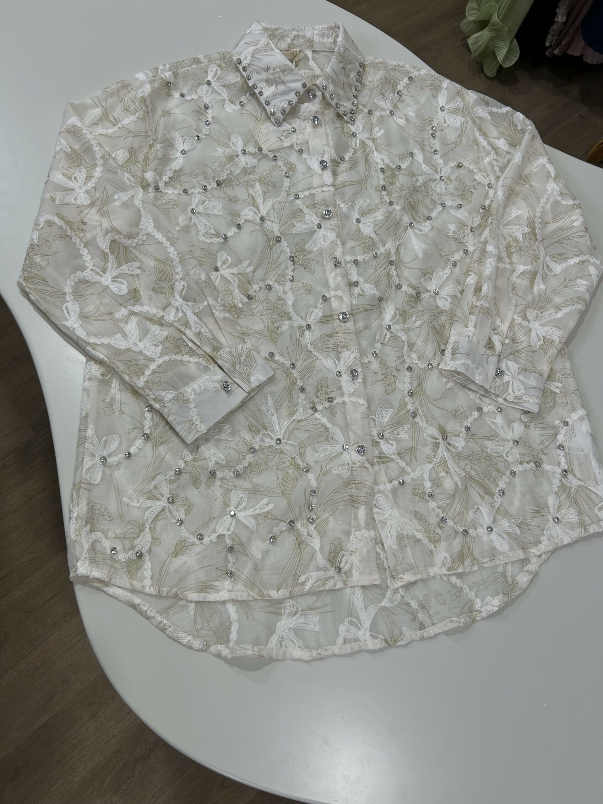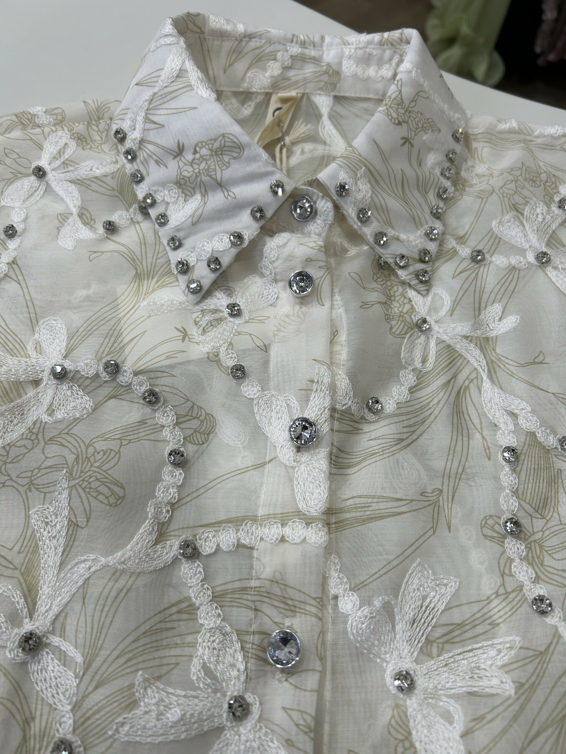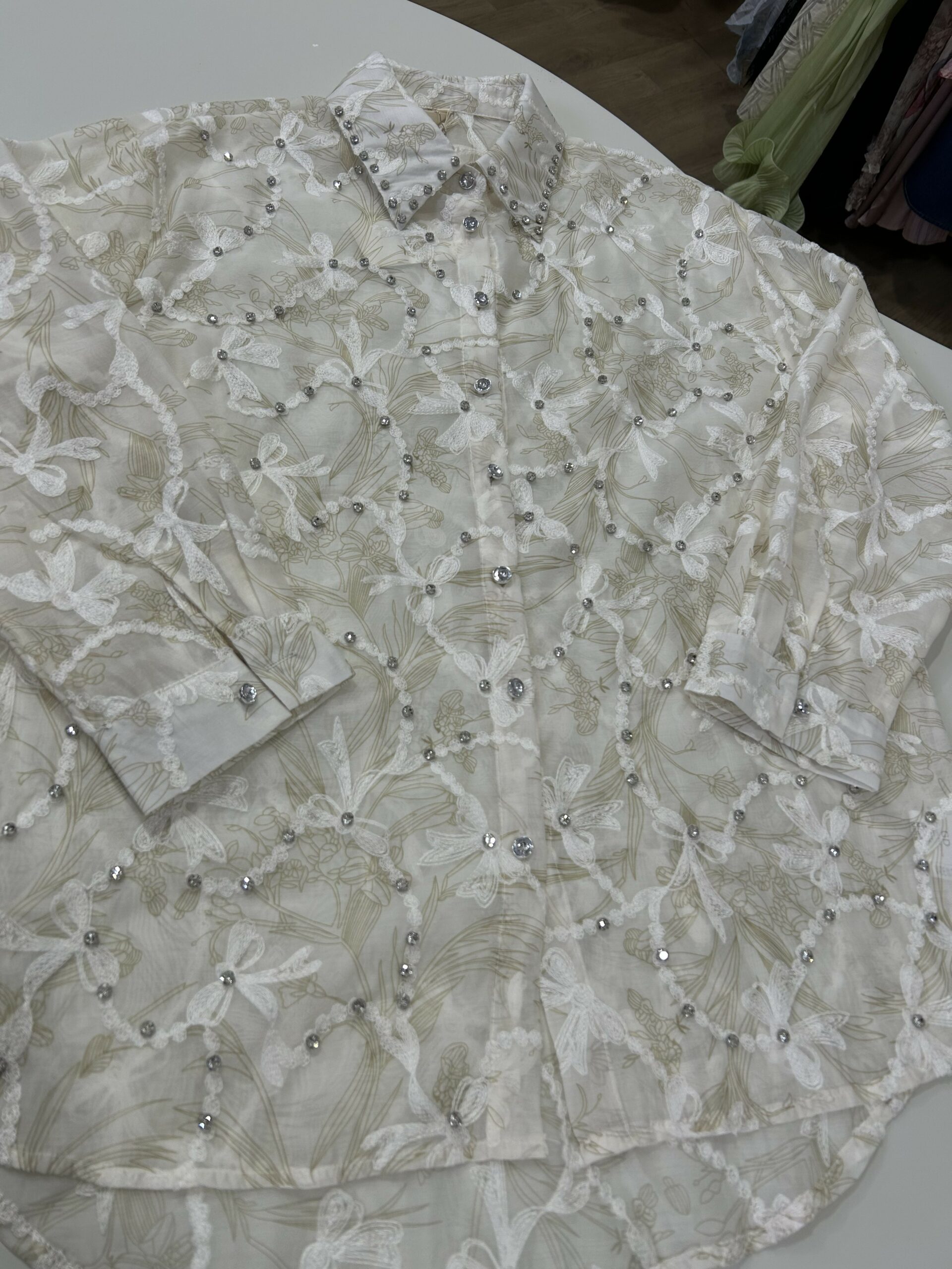 Cette chemise raffinée se distingue par sa magnifique broderie florale et ses détails délicats ornés de petites perles brillantes qui apportent une touche luxueuse. Son tissu léger et élégant assure un confort optimal tout en offrant un look sophistiqué et féminin. Parfaite pour les occasions spéciales ou pour un style chic au quotidien, elle incarne le mélange parfait entre finesse, modernité et élégance intemporelle. ✨🤍