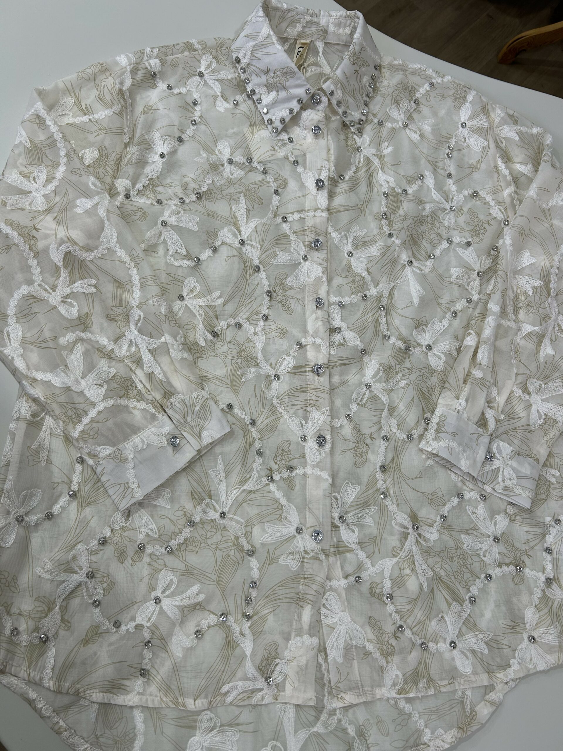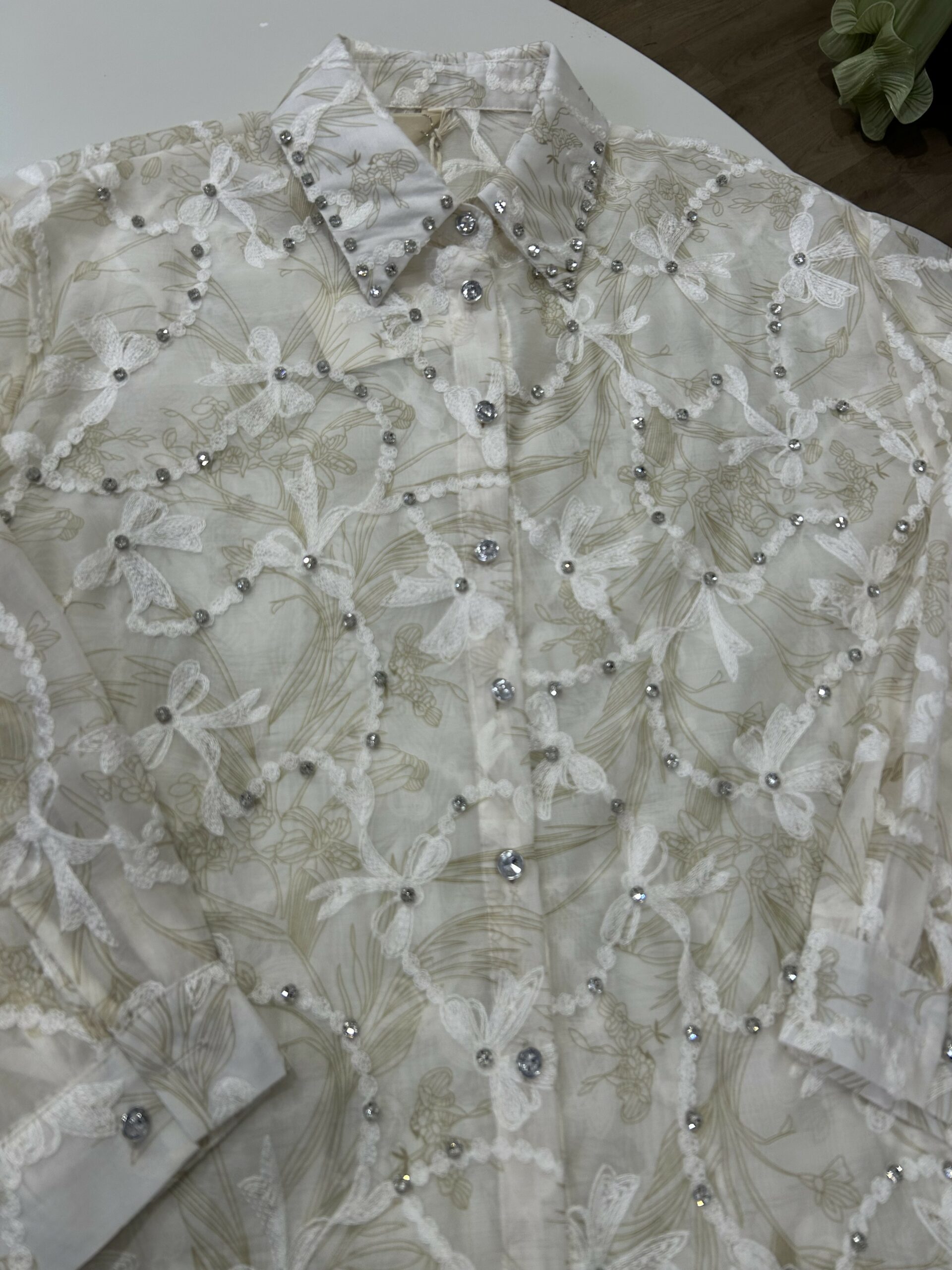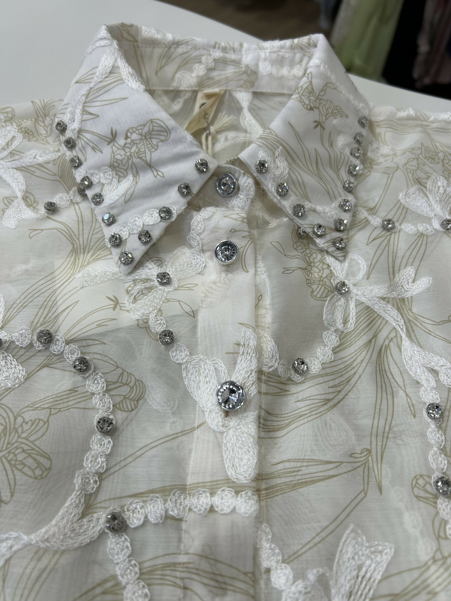Cette chemise raffinée se distingue par sa magnifique broderie florale et ses détails délicats ornés de petites perles brillantes qui apportent une touche luxueuse. Son tissu léger et élégant assure un confort optimal tout en offrant un look sophistiqué et féminin. Parfaite pour les occasions spéciales ou pour un style chic au quotidien, elle incarne le mélange parfait entre finesse, modernité et élégance intemporelle. ✨🤍