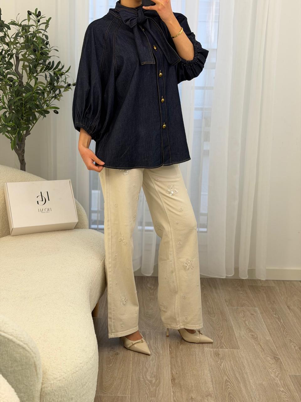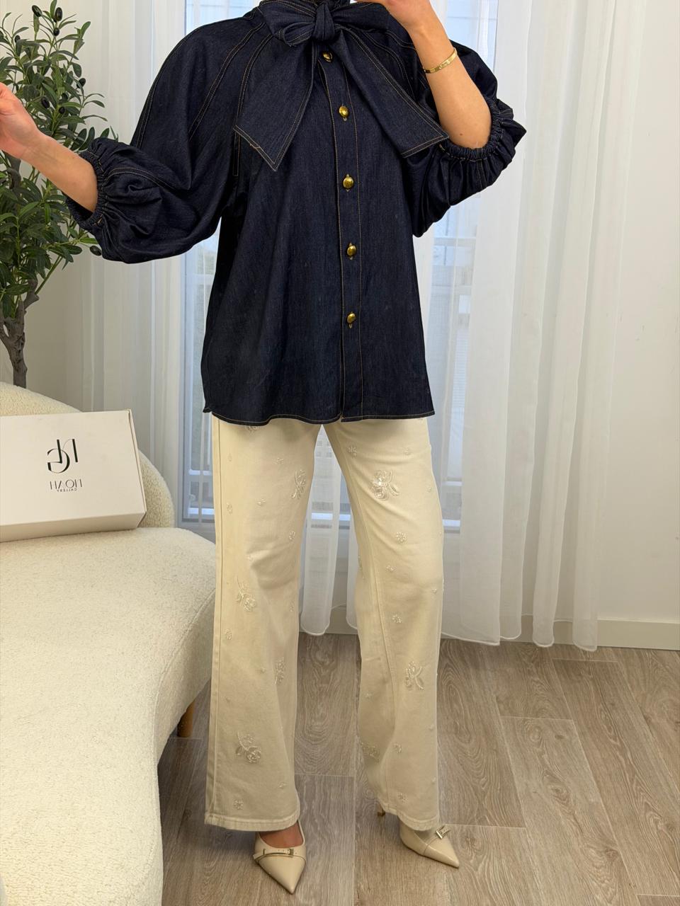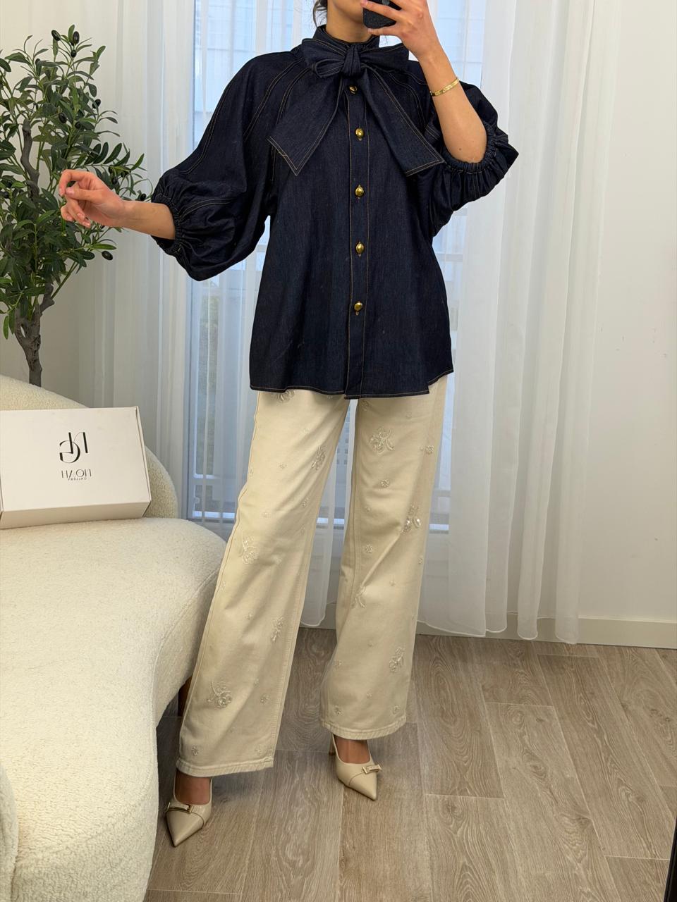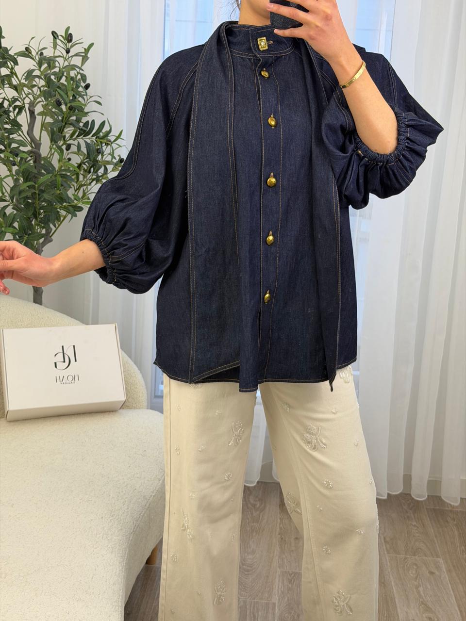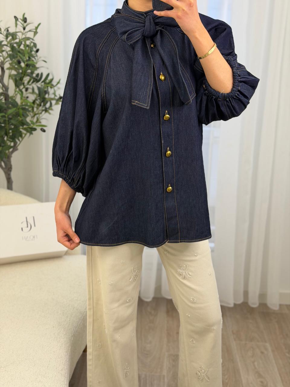 Chemise en denim bleu foncé, à la fois chic et confortable, pensée pour sublimer le quotidien avec élégance. Son nœud raffiné au col apporte une touche féminine et distinguée, tandis que les boutons dorés ajoutent une note précieuse et tendance. Les manches légèrement bouffantes assurent une coupe fluide et moderne, facile à porter avec un pantalon clair ou un jean. Une pièce intemporelle, idéale pour un look soigné sans effort, du matin au soir. 💙✨