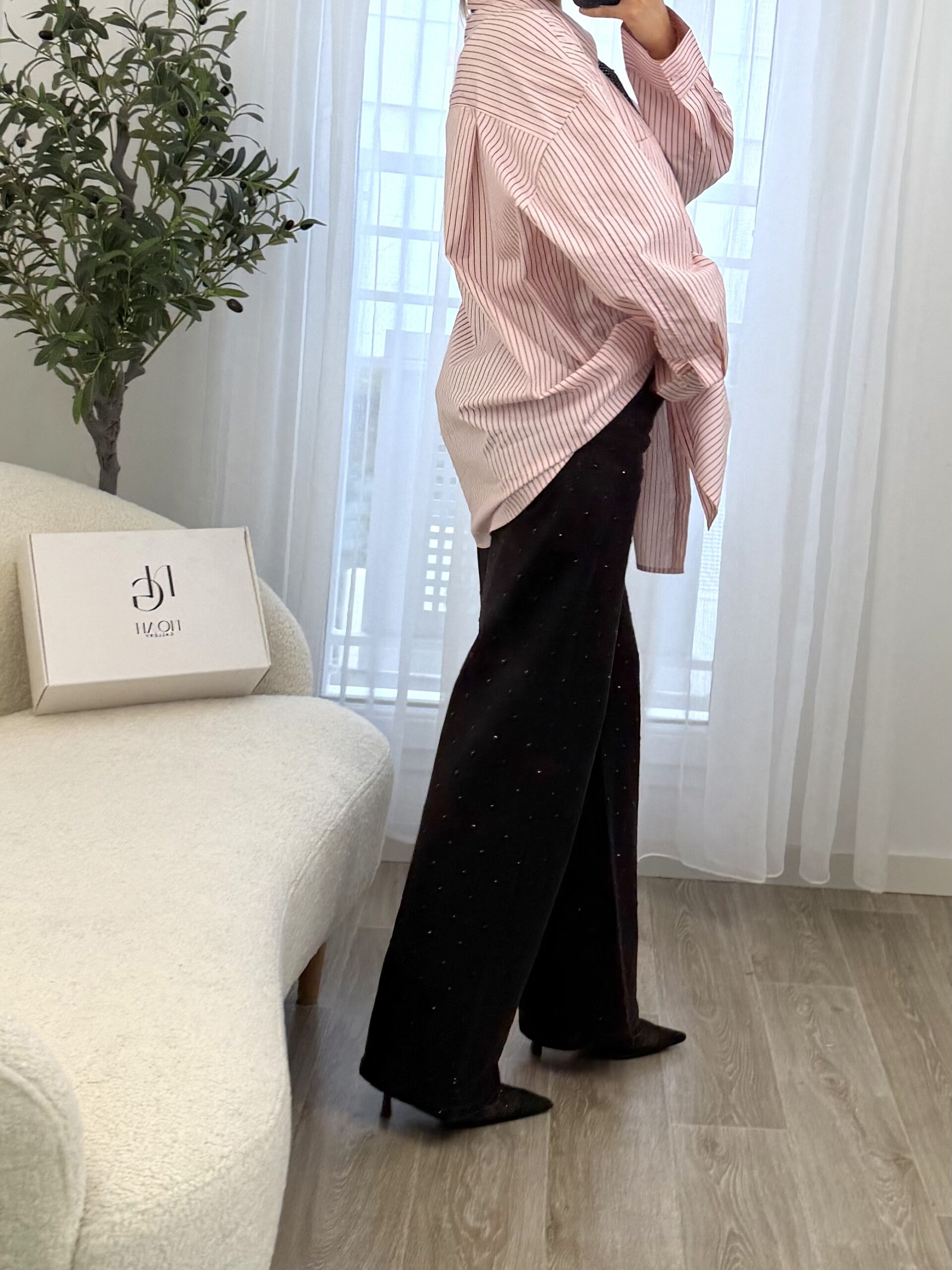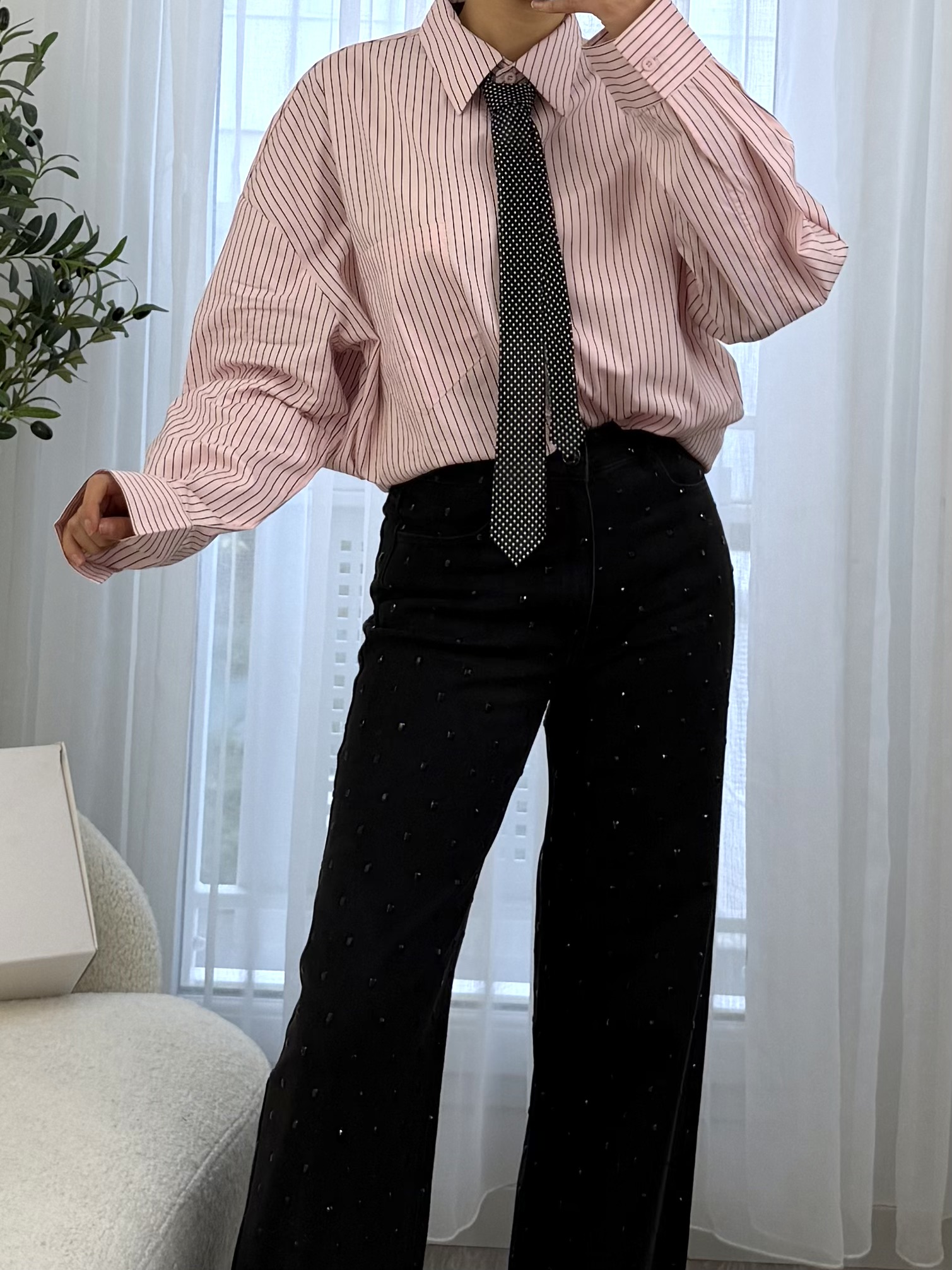 La Chemise Office Chic avec Cravate revisite le style classique avec une touche moderne et tendance. Confectionnée dans une matière légère et confortable, elle se distingue par ses rayures fines élégantes, sa coupe oversize et son col structuré qui apportent une allure sophistiquée.