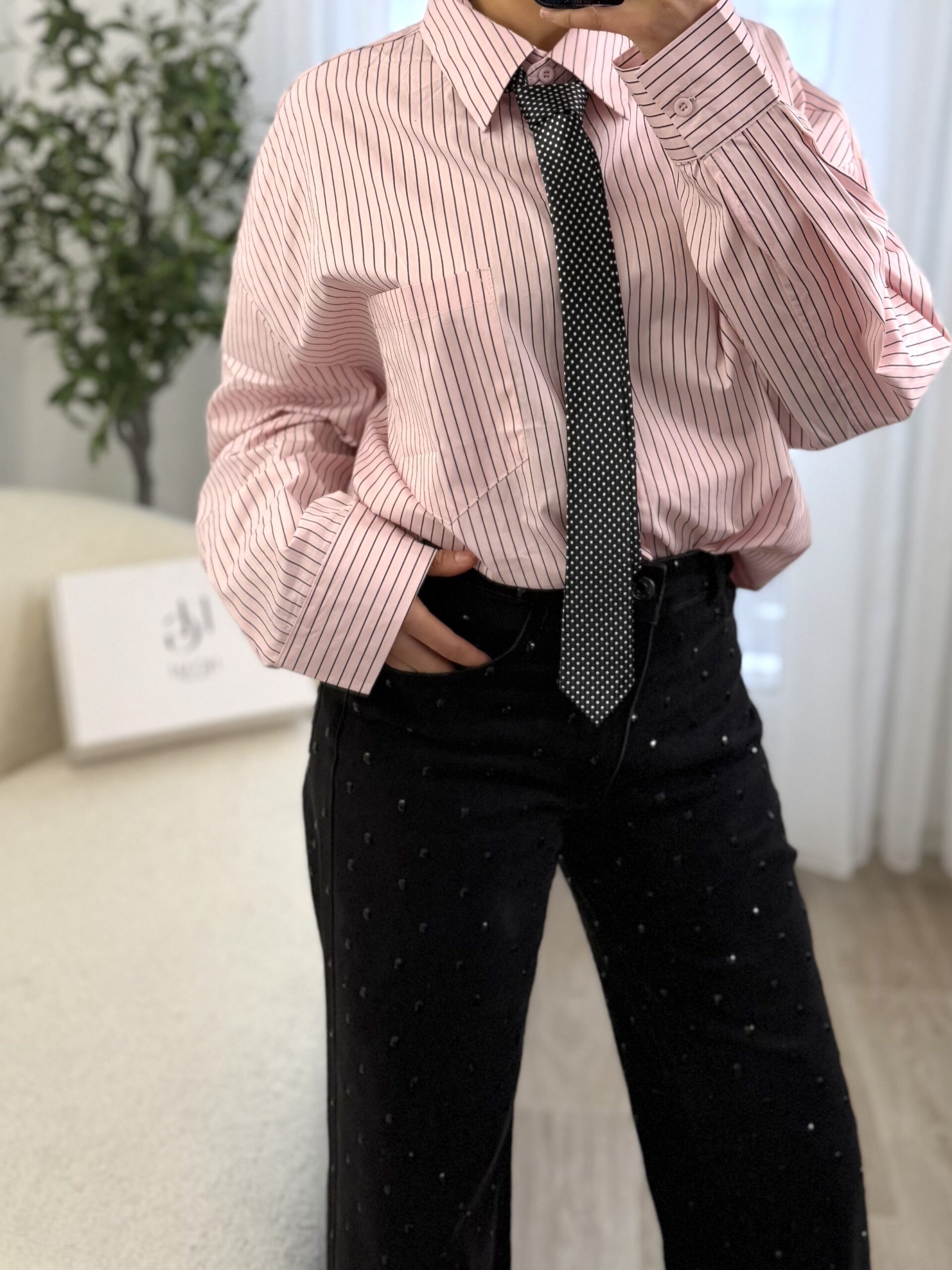 La cravate assortie à pois ajoute une note chic et originale, parfaite pour créer un look inspiré du style tailoring féminin. Facile à porter avec un jean, un pantalon habillé ou une jupe, cette chemise est idéale pour un look à la fois élégant, moderne et affirmé.