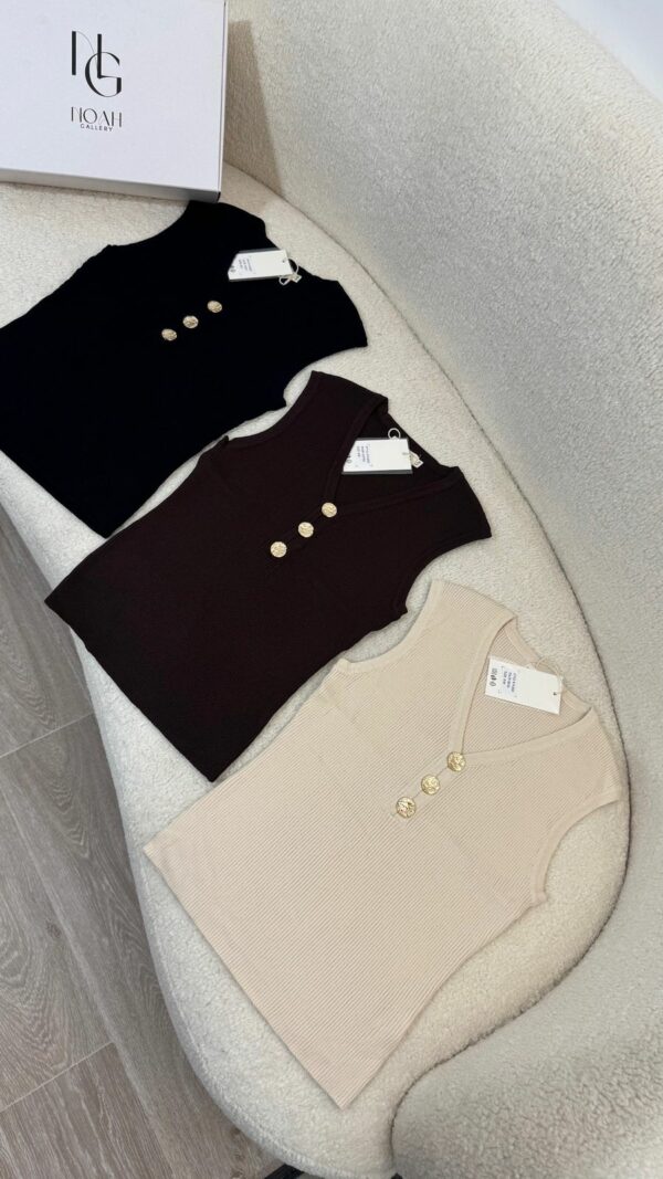 Ce débardeur sans manches allie simplicité et élégance grâce à sa coupe épurée et son tissu finement côtelé. Les trois boutons dorés apportent une touche de raffinement qui rehausse parfaitement chaque couleur, qu’il s’agisse du noir classique, du marron profond ou du beige doux. Facile à porter seul ou en superposition, il s’adapte aussi bien aux looks décontractés qu’aux tenues plus habillées, offrant une allure chic en toute simplicité.