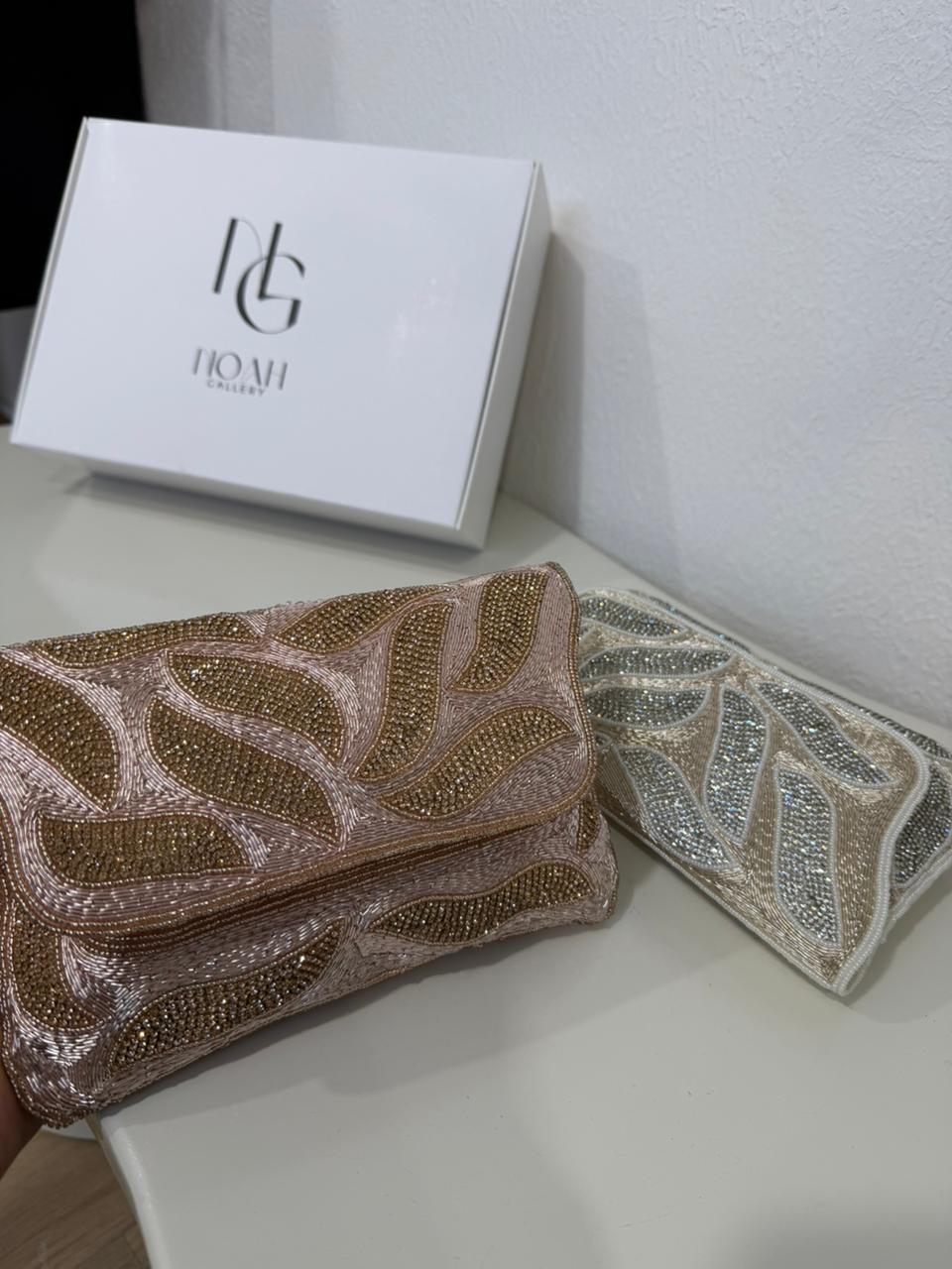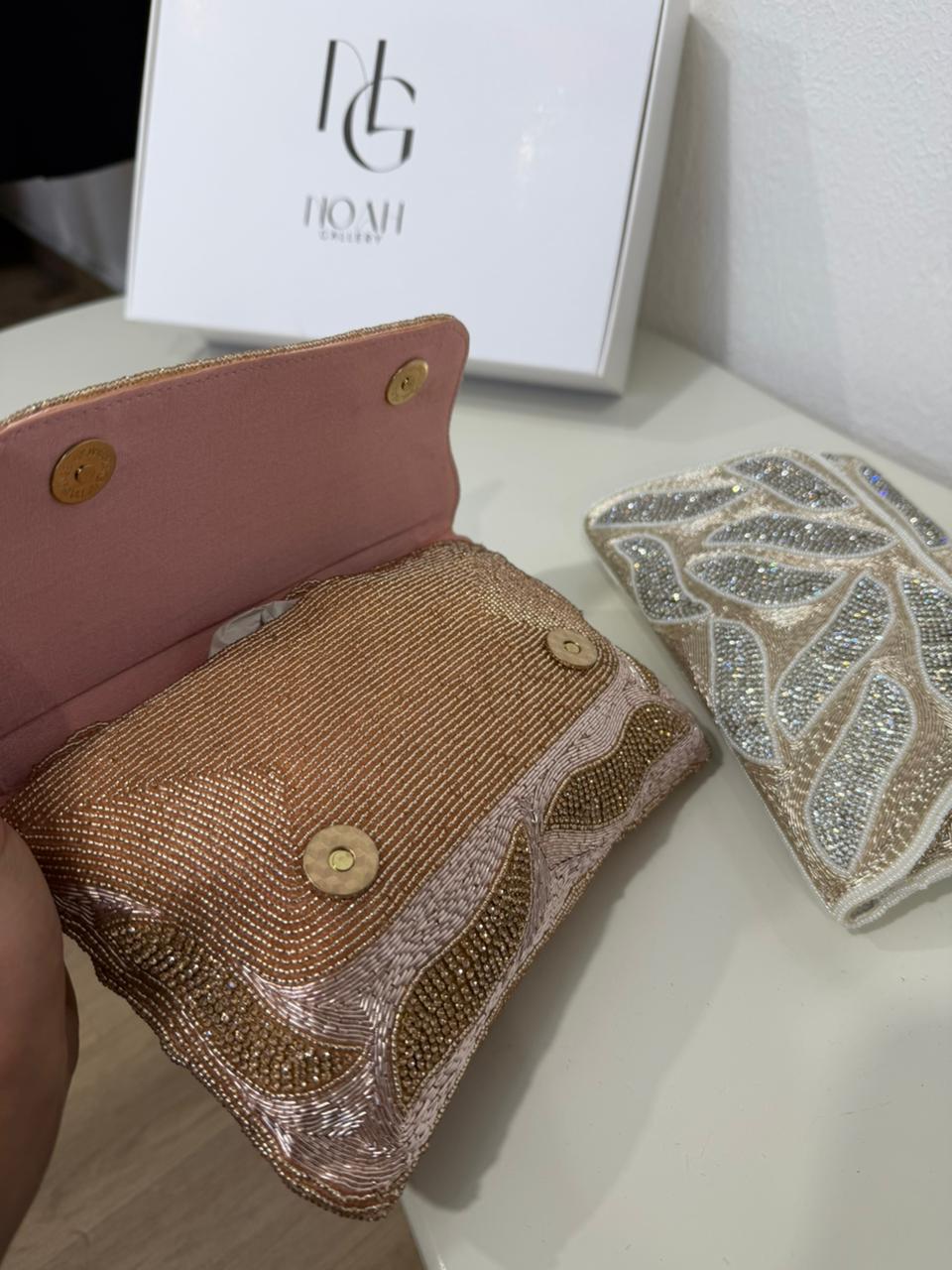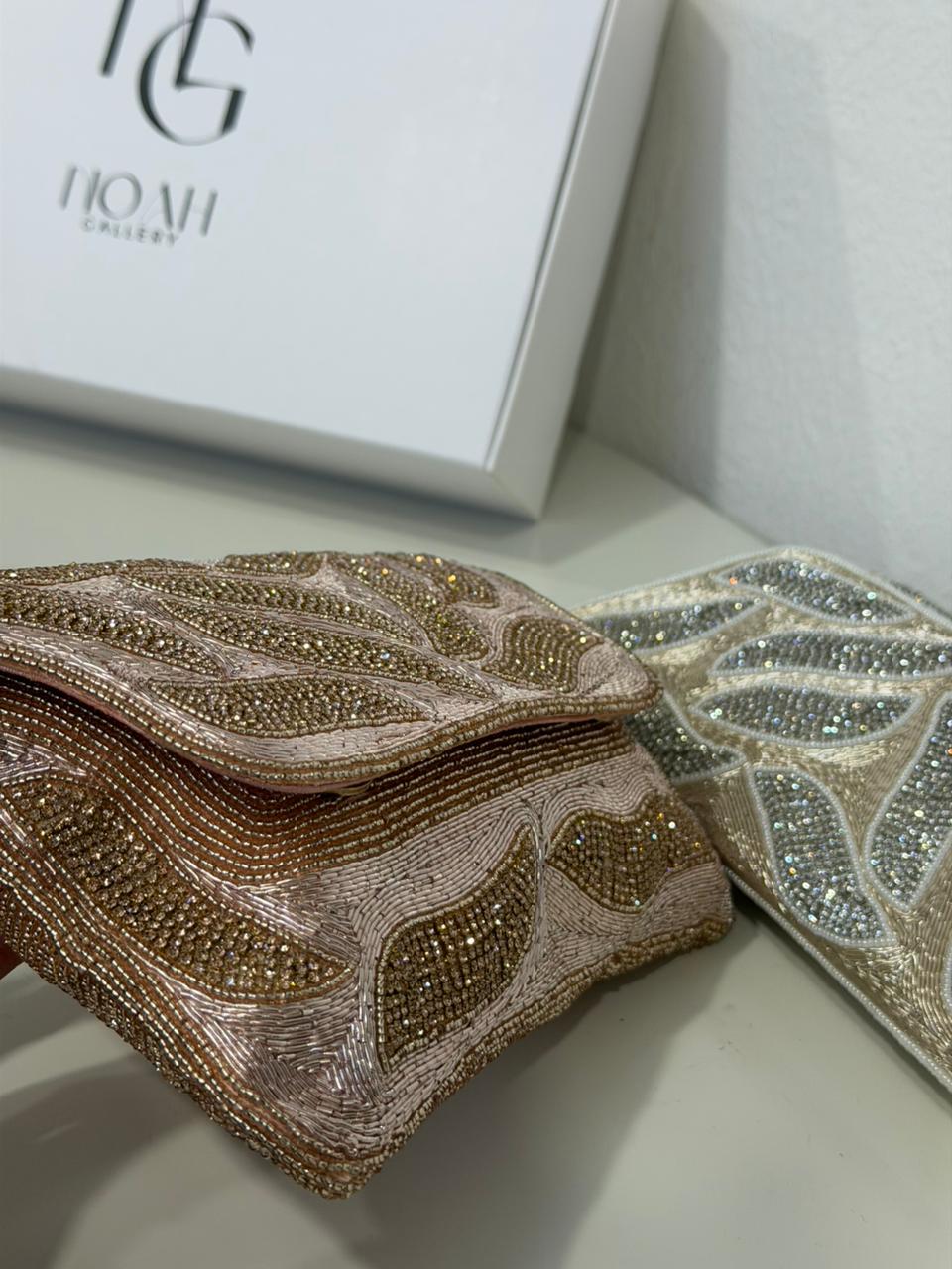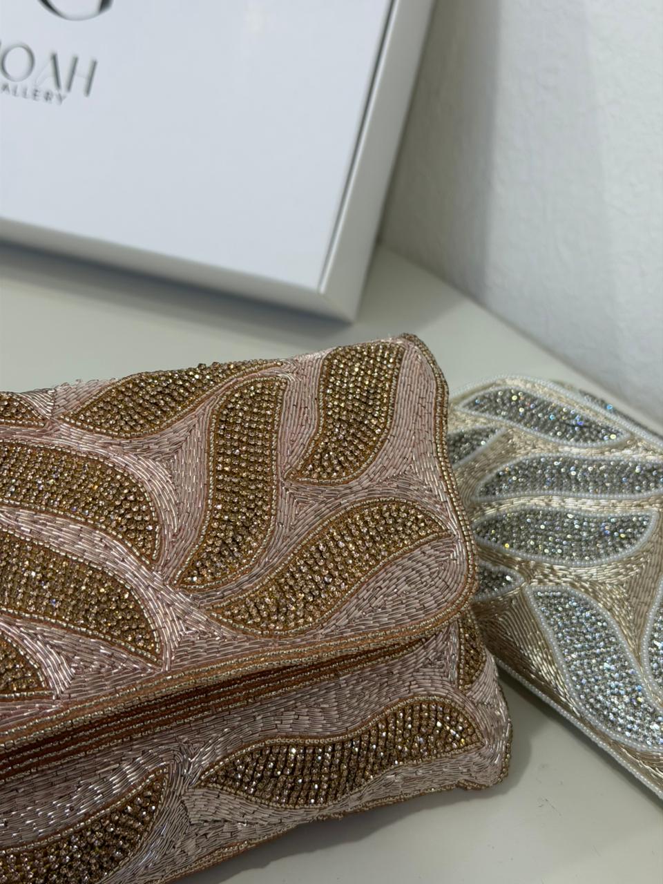 Pochette de soirée faite à la main, ornée de canetille, alliant finesse artisanale et élégance sophistiquée. Chaque détail est minutieusement travaillé pour offrir un rendu précieux et raffiné, reflétant un véritable savoir-faire. Idéale pour sublimer une tenue de soirée ou une occasion spéciale, elle apporte une touche luxueuse et intemporelle. Un accessoire unique, symbole de délicatesse, d’authenticité et de chic.