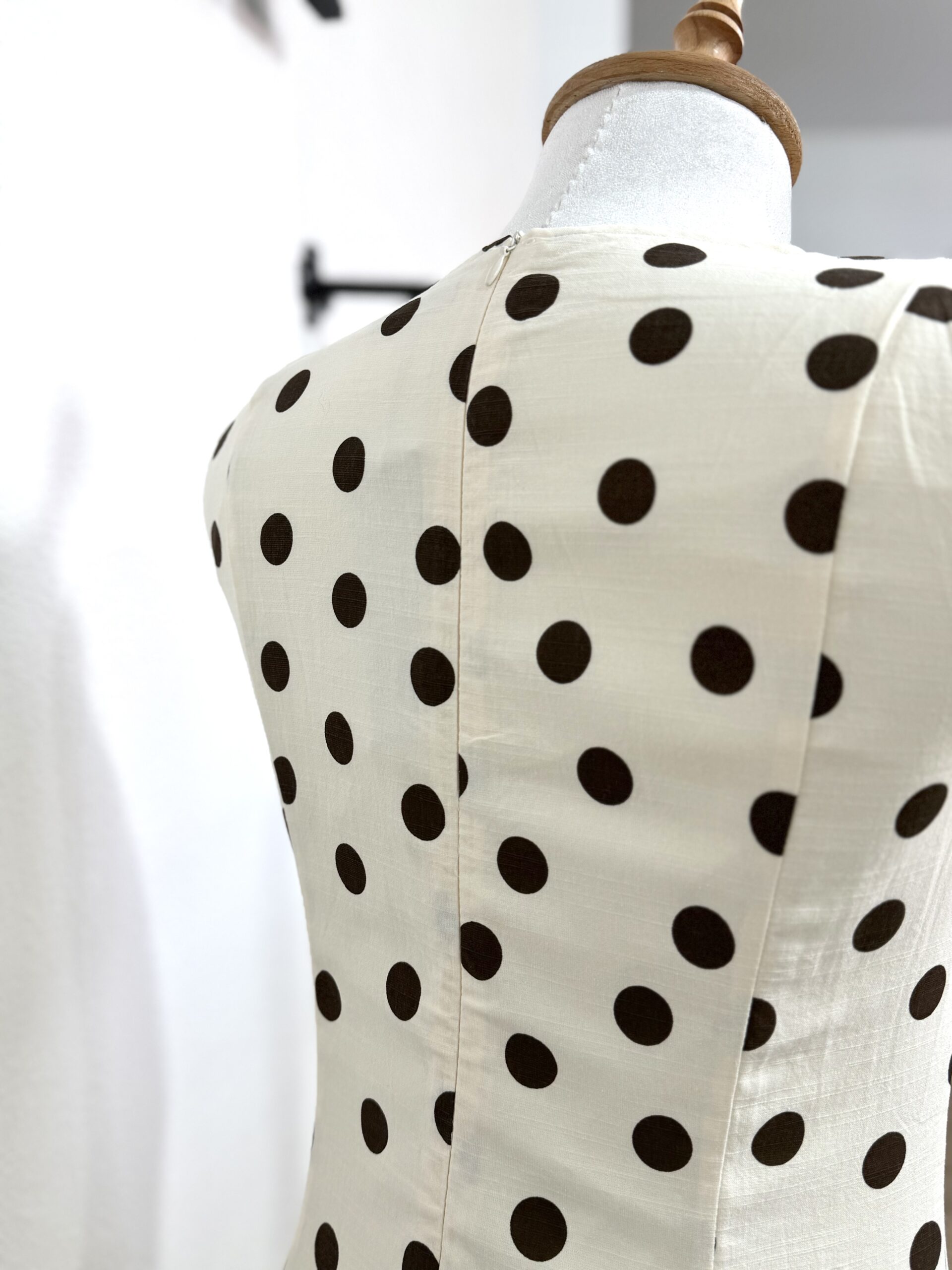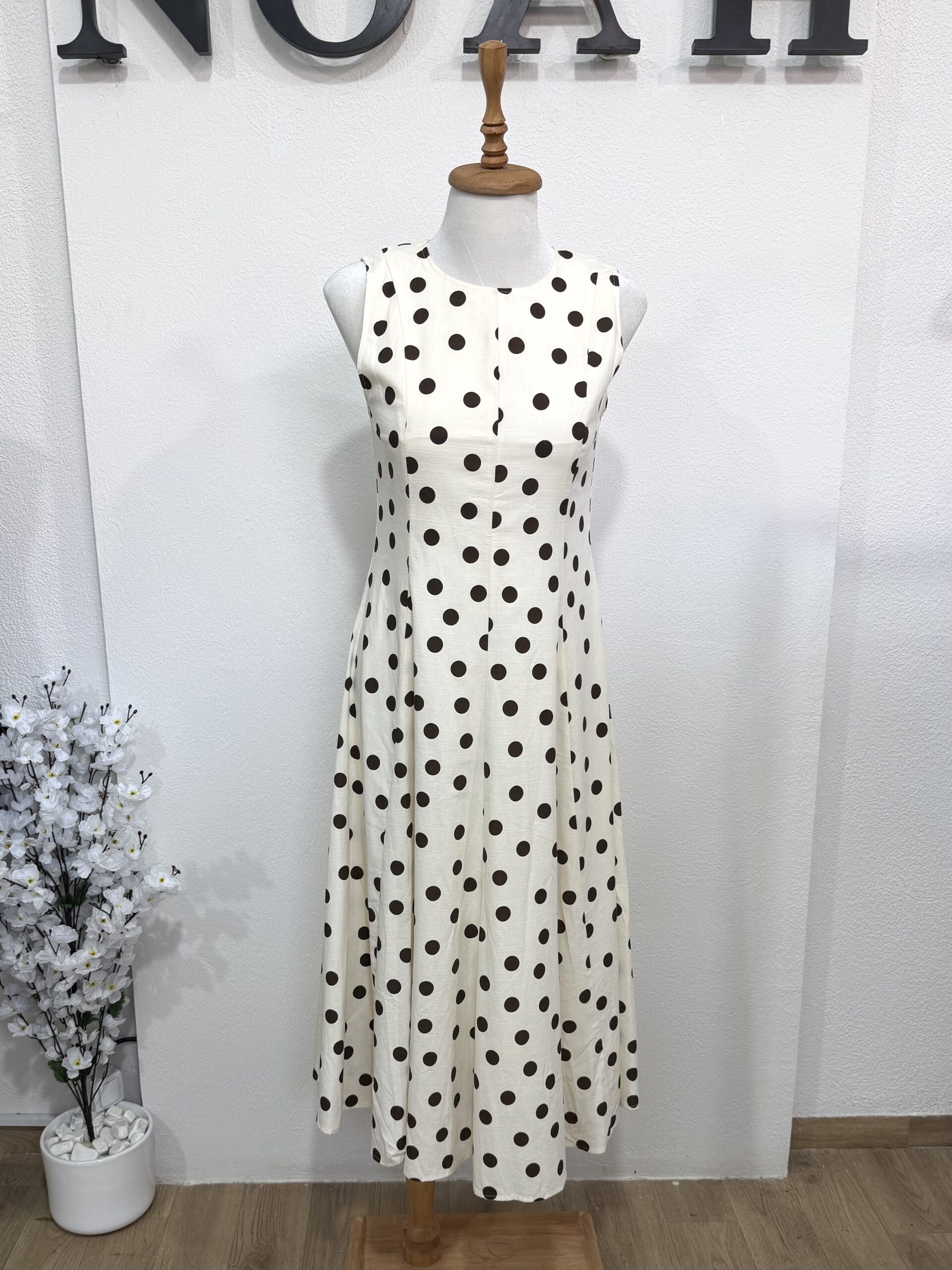 Robe midi élégante à imprimé pois marron sur fond écru, avec une coupe cintrée à la taille et une jupe évasée fluide qui sublime la silhouette. Son design sans manches et son style intemporel en font une pièce idéale pour un look chic et féminin au quotidien comme pour les occasions spéciales. ✨