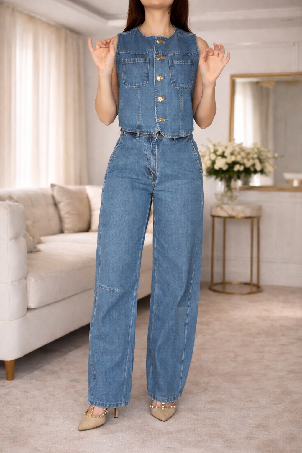 Ensemble en jean composé d’un haut sans manches boutonné et d’un pantalon taille haute à coupe large. Moderne et structuré, il offre un look tendance et élégant, facile à porter au quotidien ou pour une tenue chic décontractée.