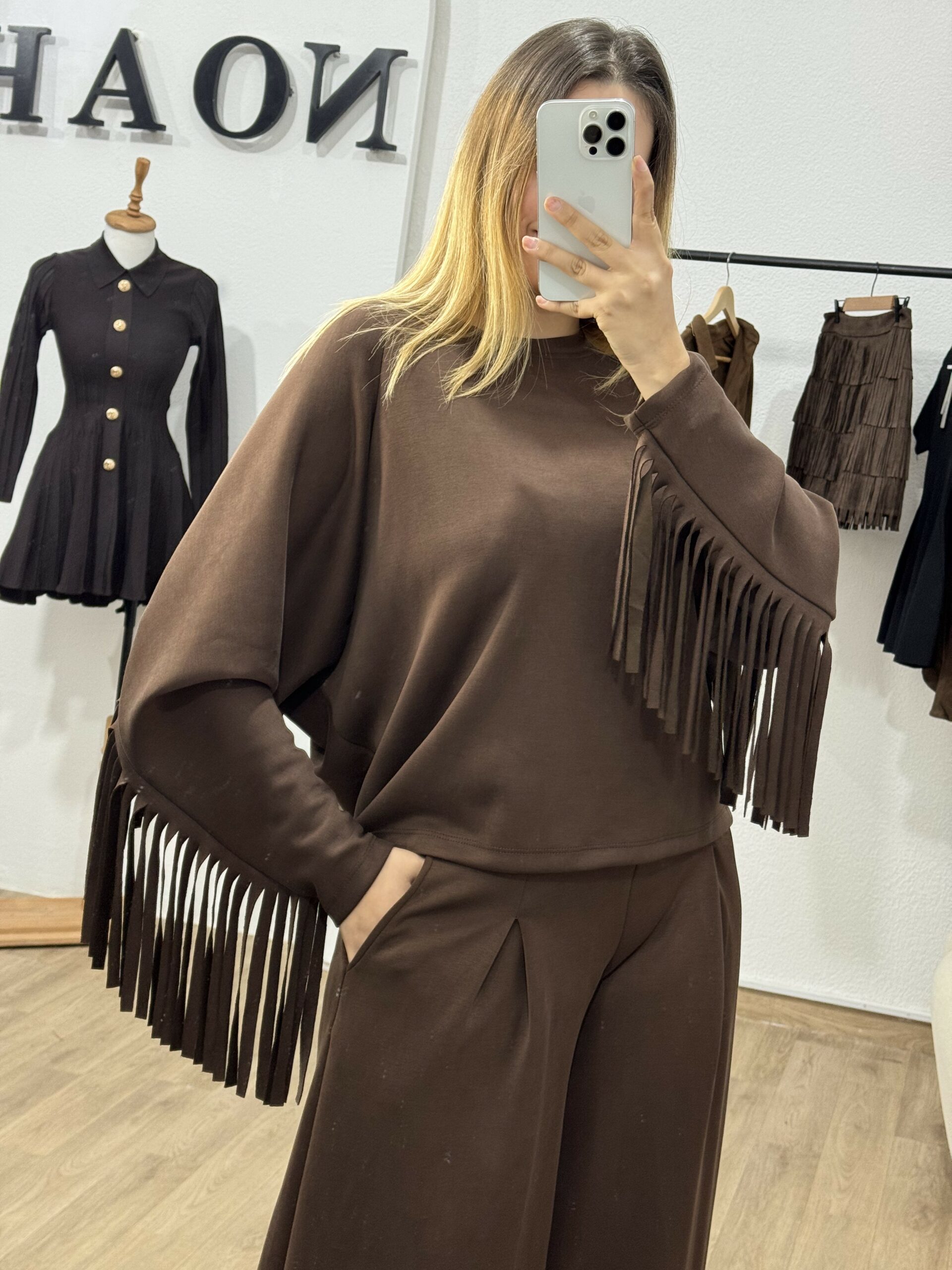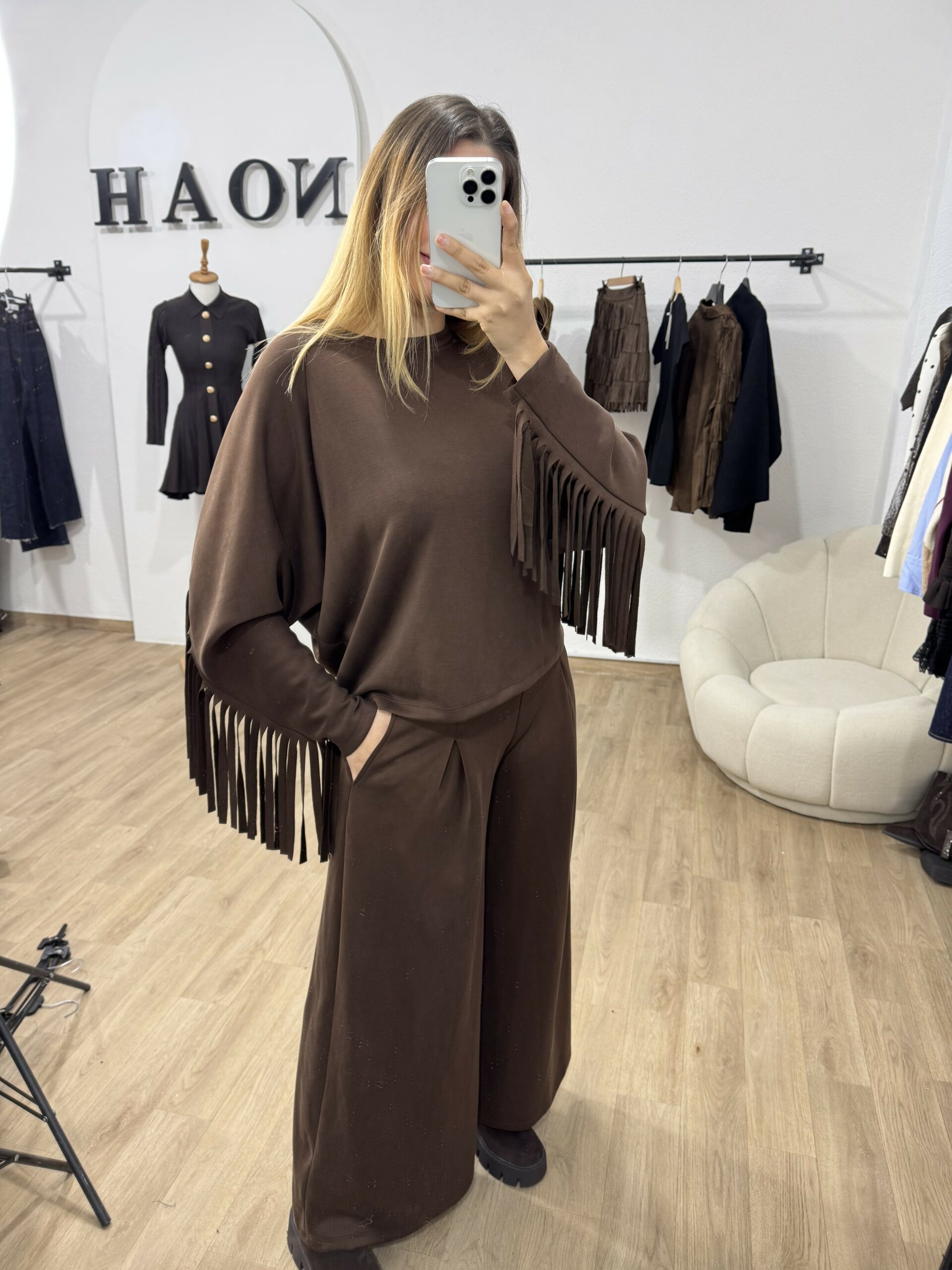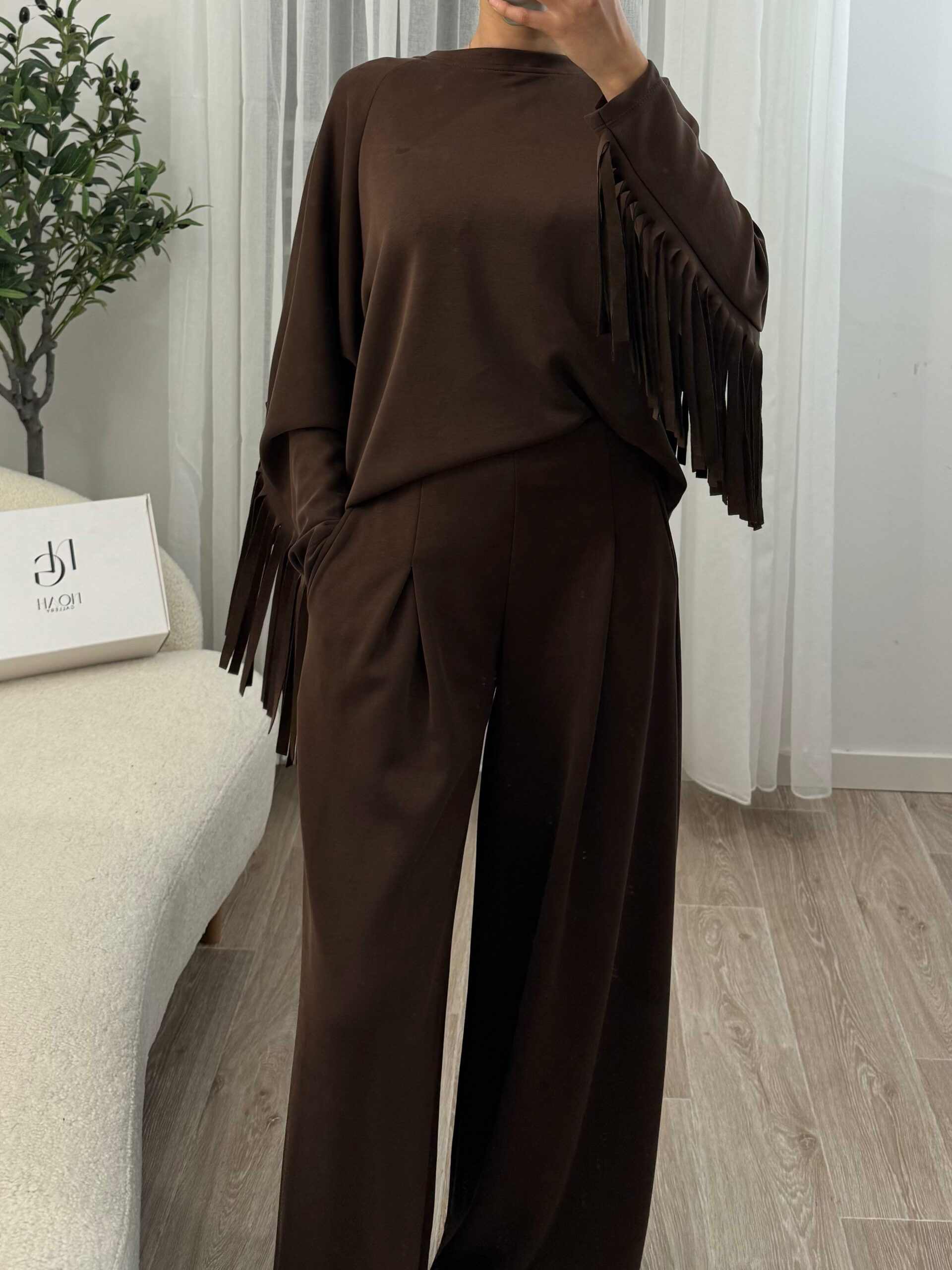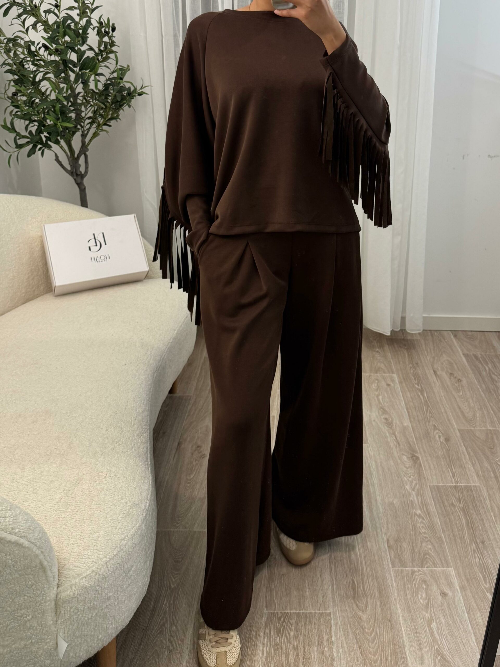Cet ensemble Fringe Luxe se distingue par son style moderne et plein de caractère. Confortable et fluide, il met en valeur la silhouette tout en apportant une touche d’originalité grâce aux franges délicatement travaillées sur les manches. Une pièce tendance, idéale pour celles qui aiment allier élégance, aisance et un soupçon de mouvement dans leur look. Parfait pour des sorties chic ou des journées où tu veux simplement briller avec classe.