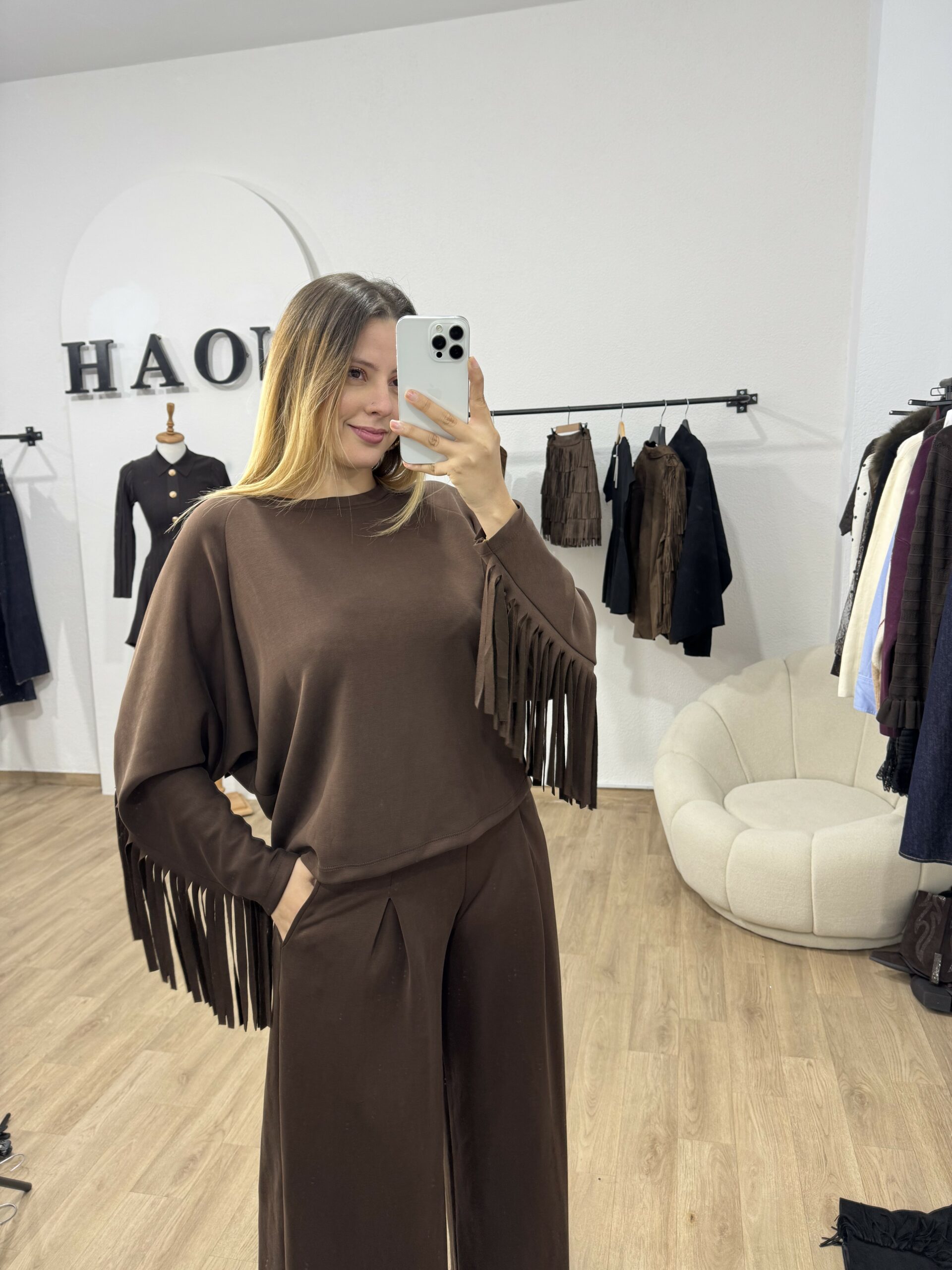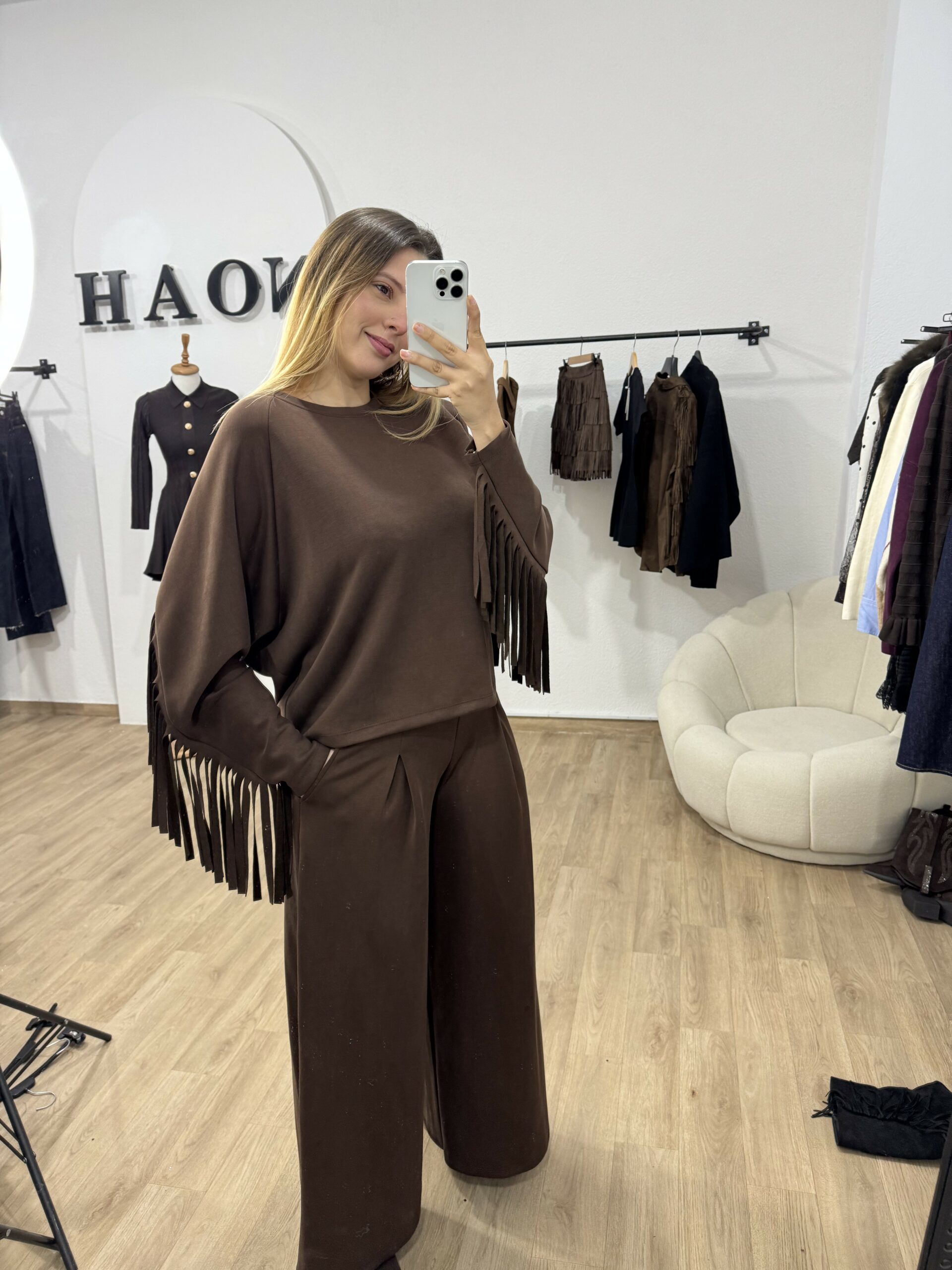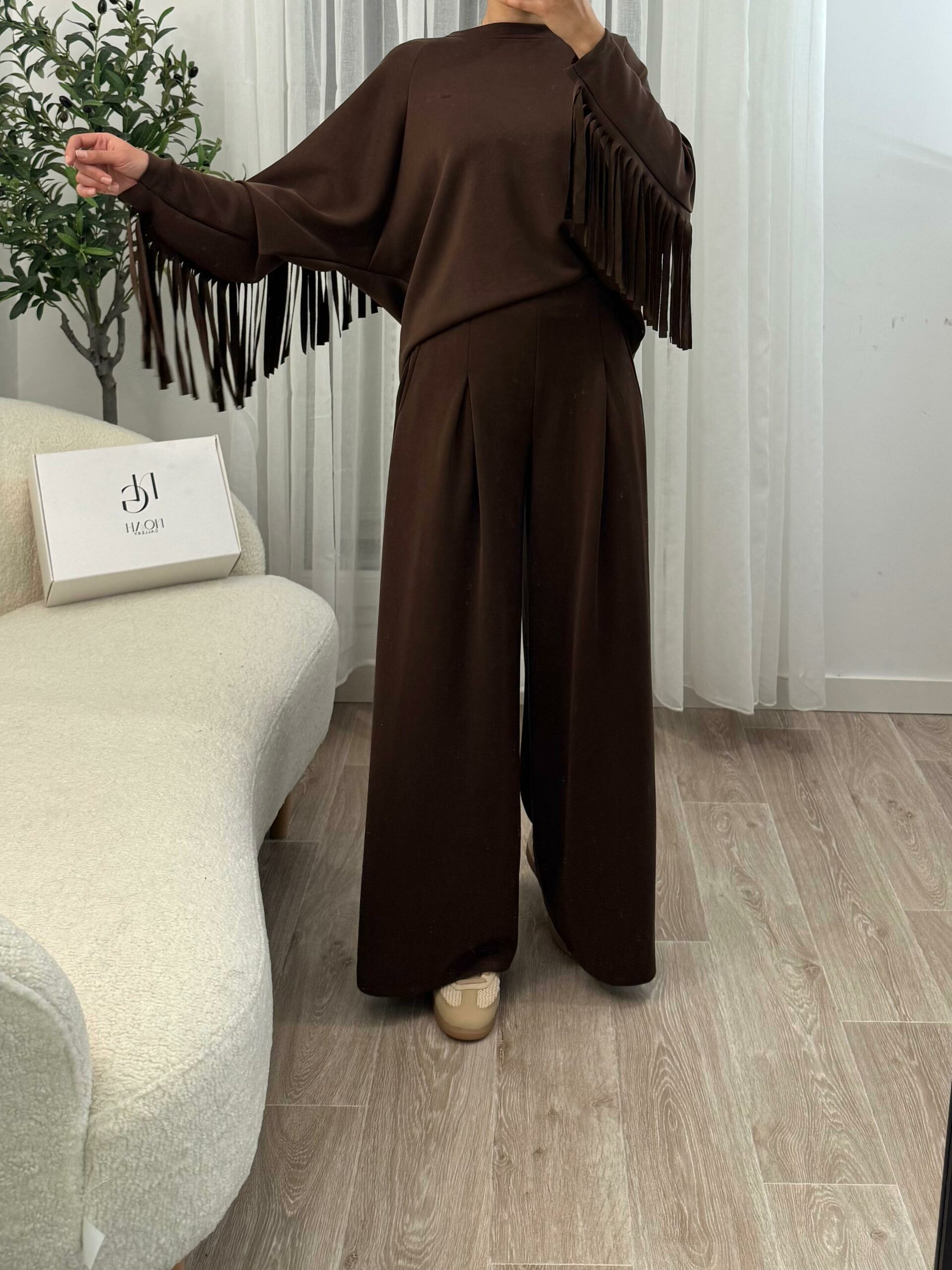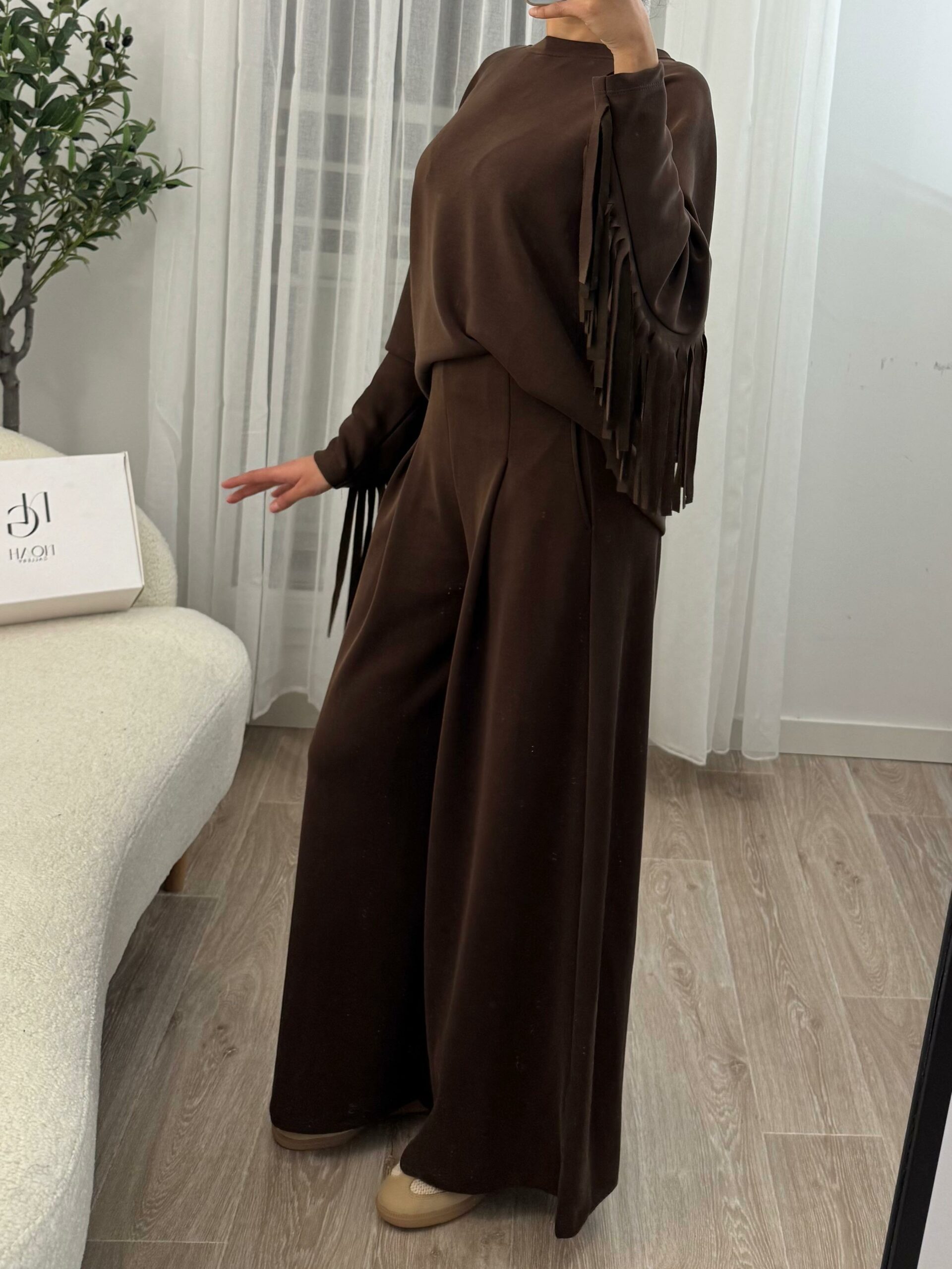 Cet ensemble Fringe Luxe se distingue par son style moderne et plein de caractère. Confortable et fluide, il met en valeur la silhouette tout en apportant une touche d’originalité grâce aux franges délicatement travaillées sur les manches. Une pièce tendance, idéale pour celles qui aiment allier élégance, aisance et un soupçon de mouvement dans leur look. Parfait pour des sorties chic ou des journées où tu veux simplement briller avec classe.