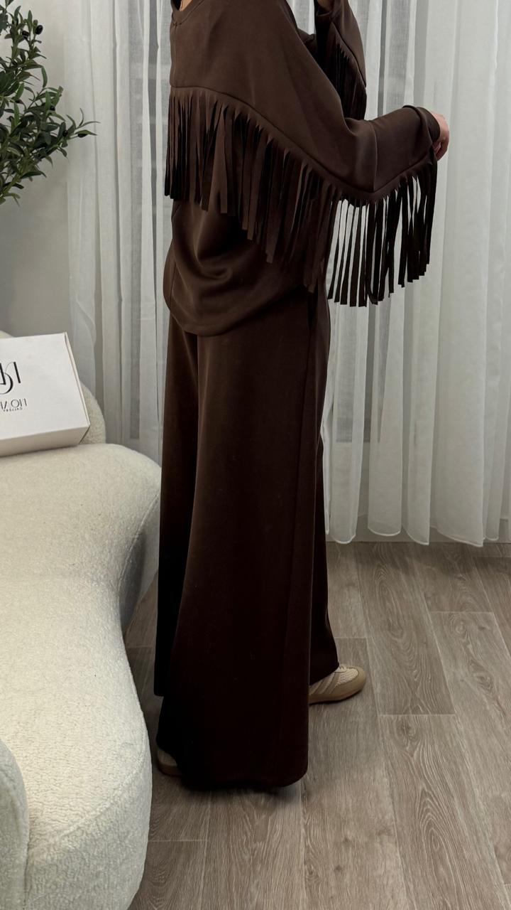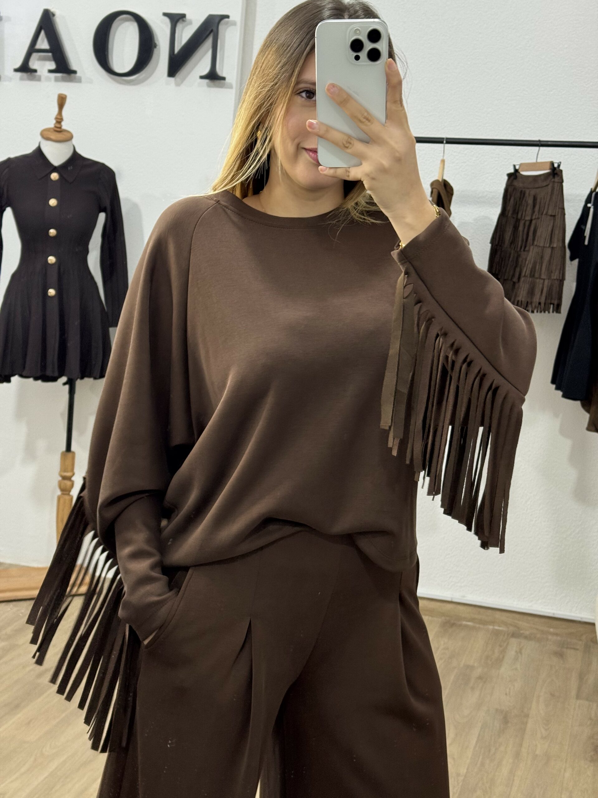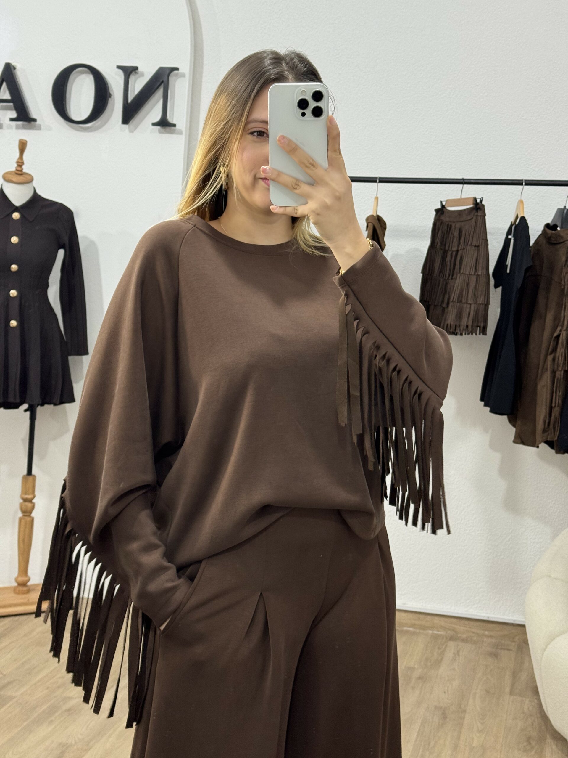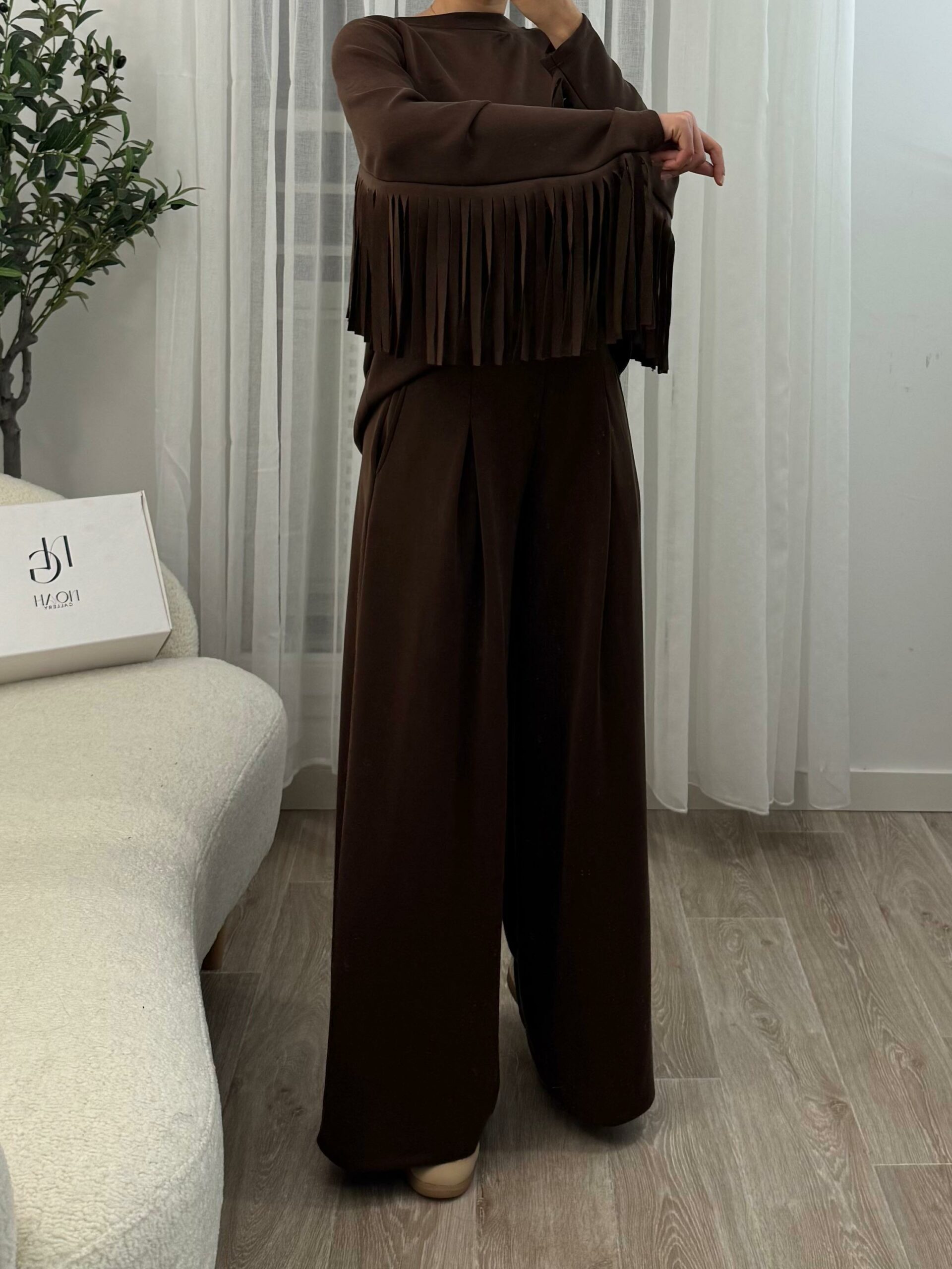 Cet ensemble Fringe Luxe se distingue par son style moderne et plein de caractère. Confortable et fluide, il met en valeur la silhouette tout en apportant une touche d’originalité grâce aux franges délicatement travaillées sur les manches. Une pièce tendance, idéale pour celles qui aiment allier élégance, aisance et un soupçon de mouvement dans leur look. Parfait pour des sorties chic ou des journées où tu veux simplement briller avec classe.