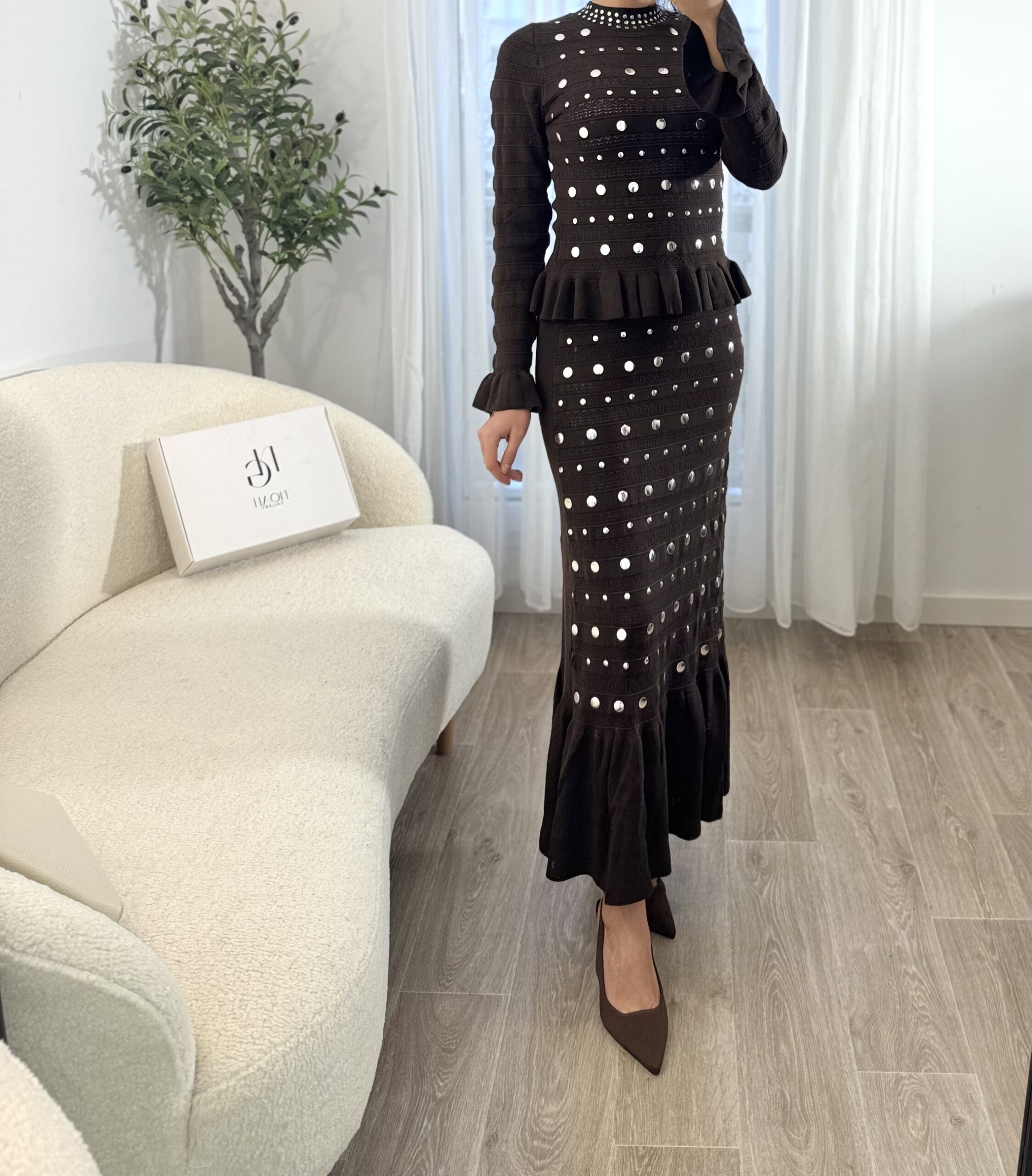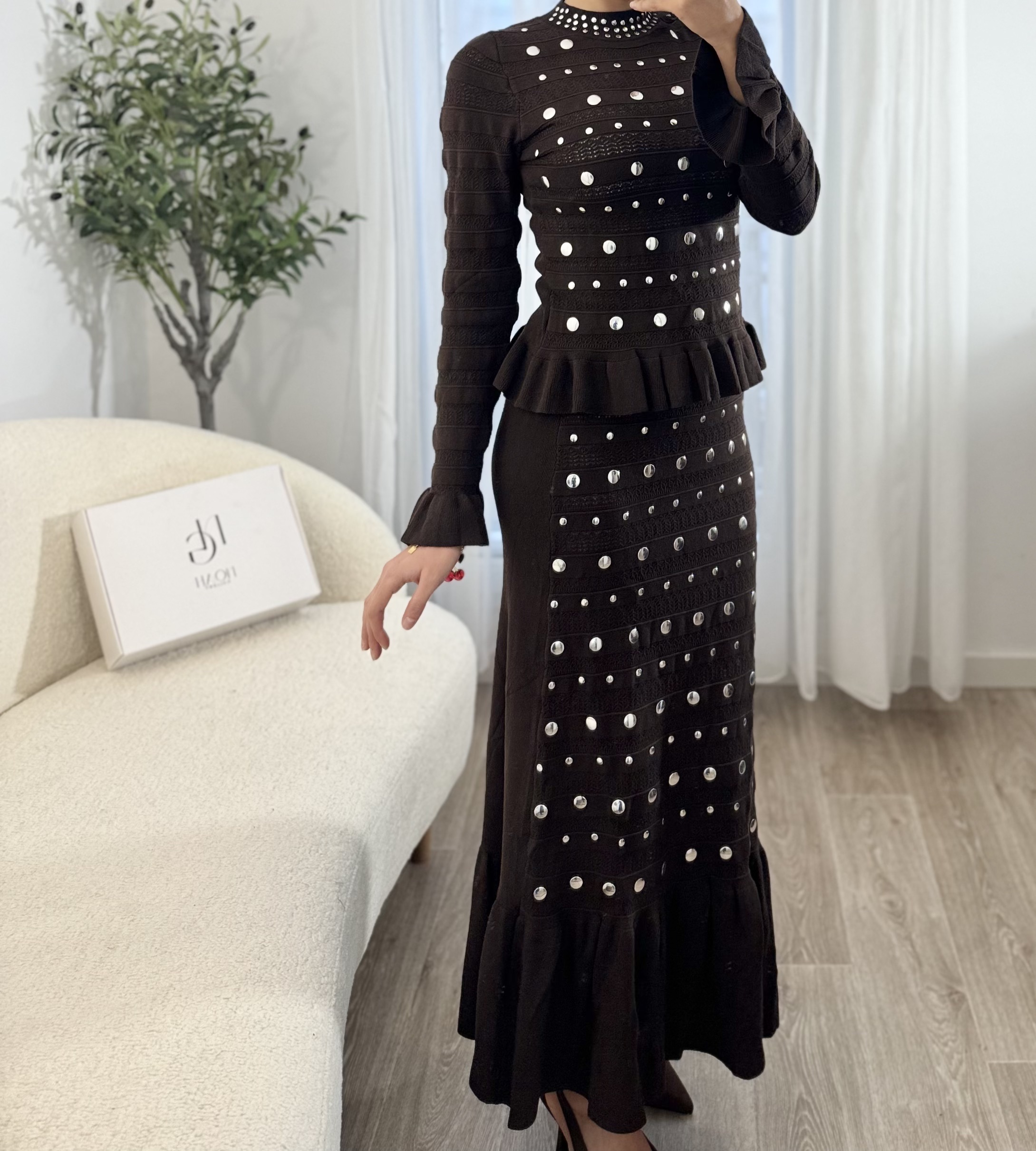 Ensemble deux pièces chocolat foncé au style élégant et structuré, composé d’un haut ajusté et d’une jupe longue sirène assortie.