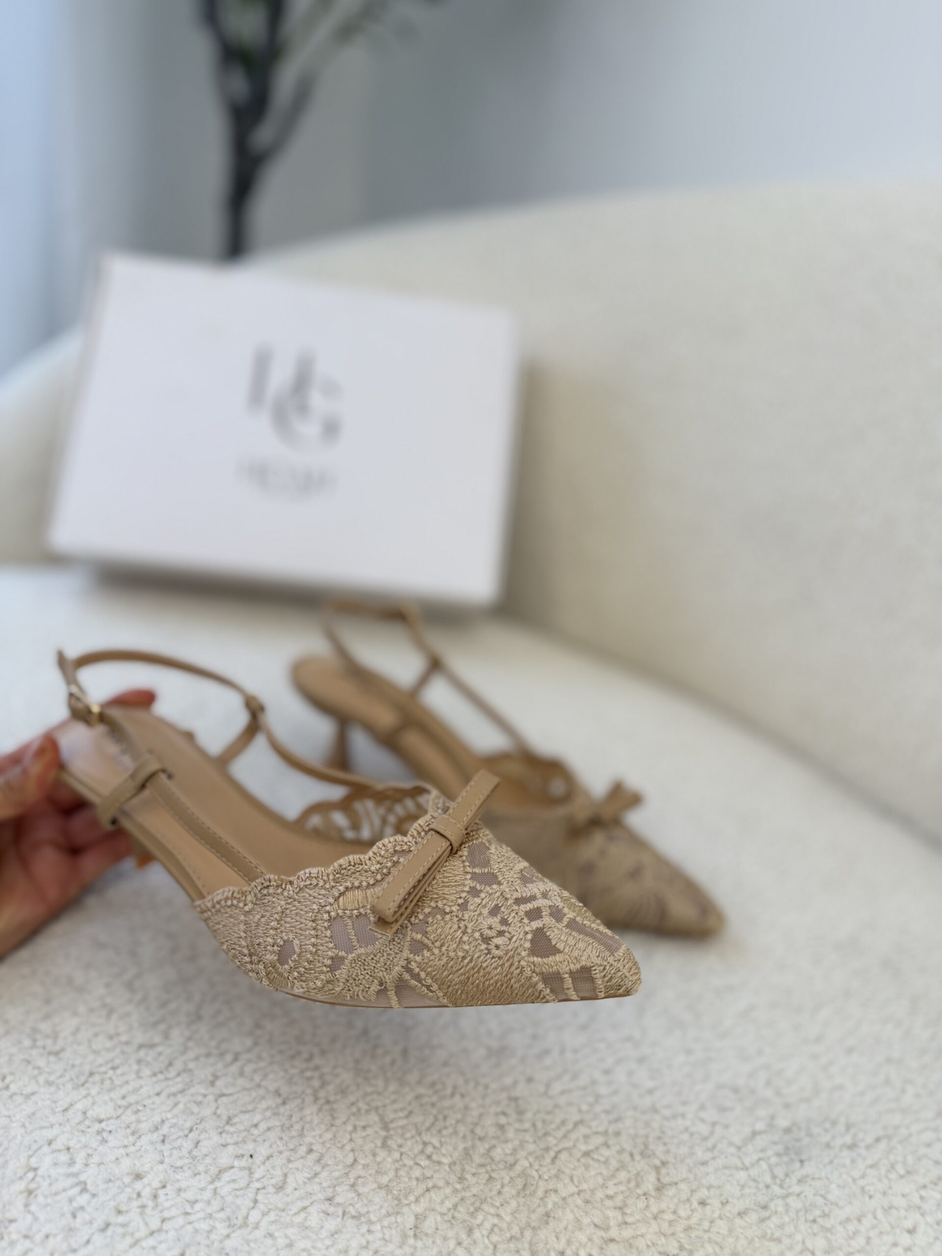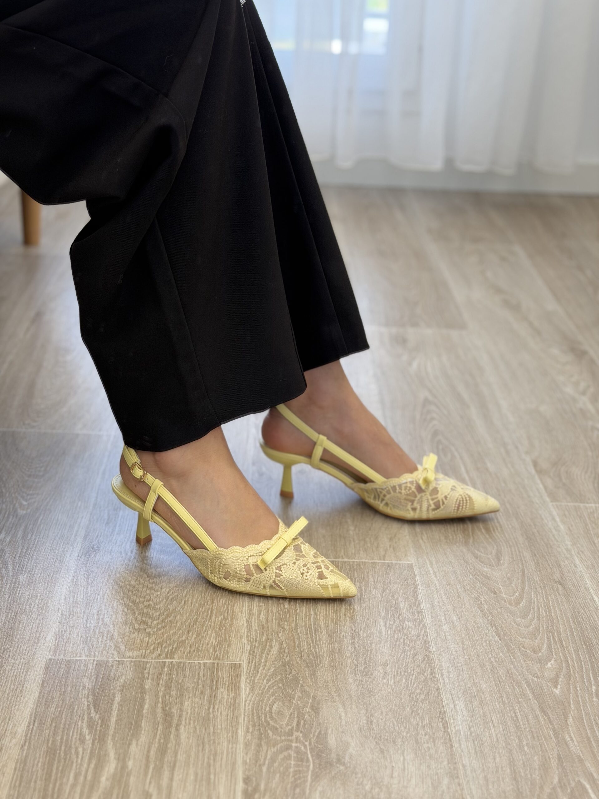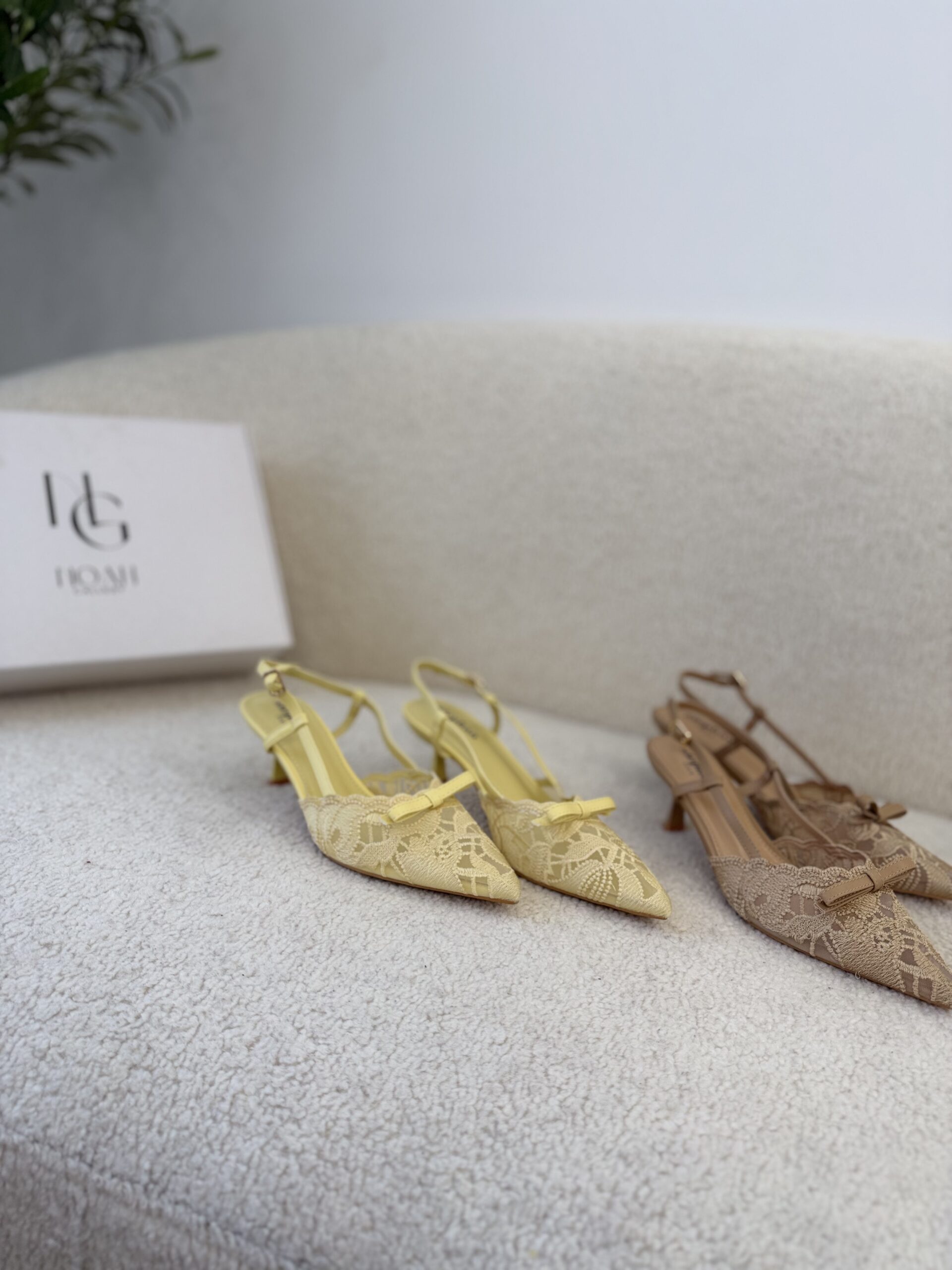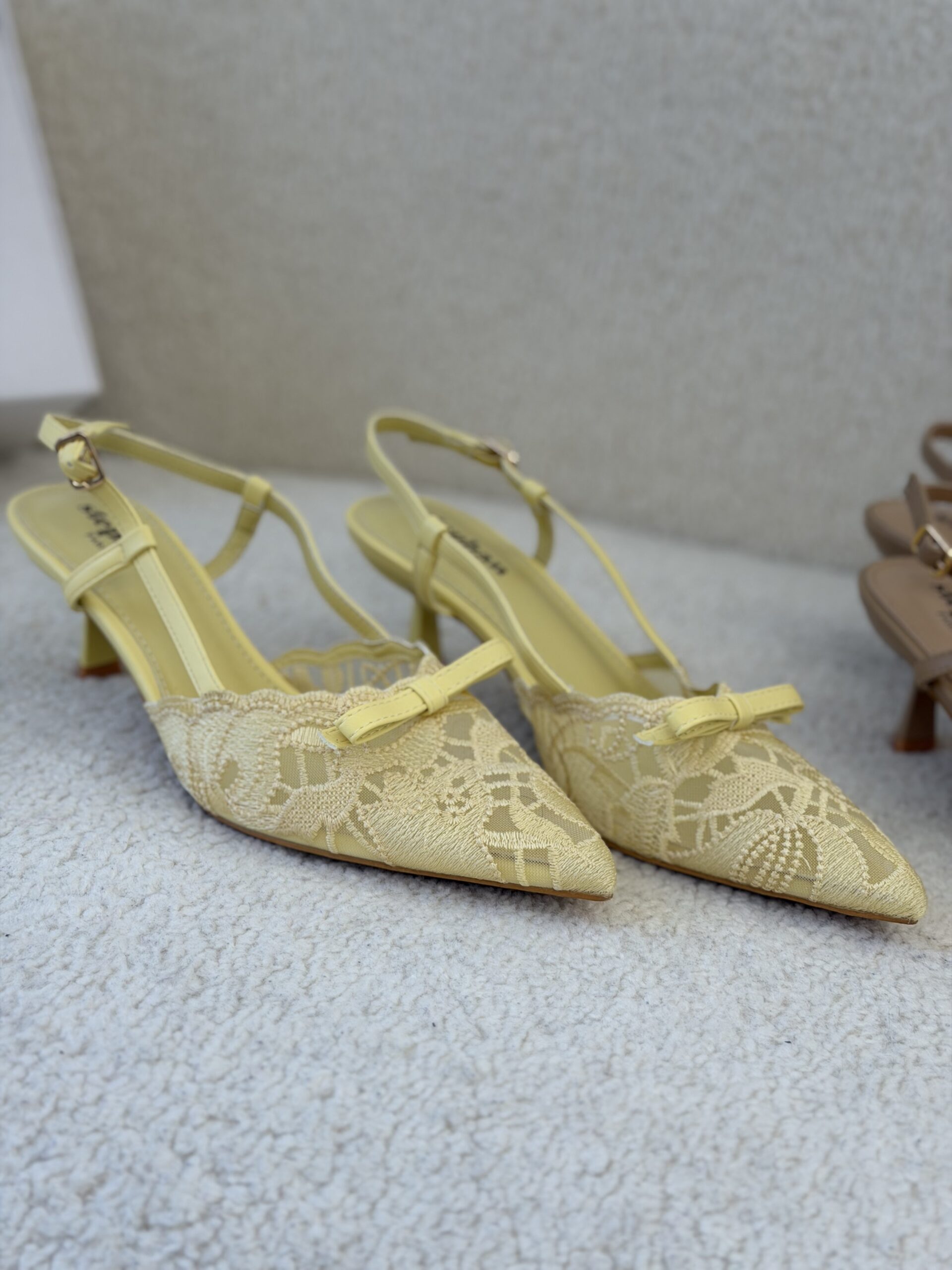 Escarpins raffinés au design féminin, sublimés par une délicate dentelle et un petit nœud sur le devant pour une touche romantique. Leur bout pointu et leur bride fine apportent une silhouette élégante, parfaite pour compléter une tenue chic ou habillée.