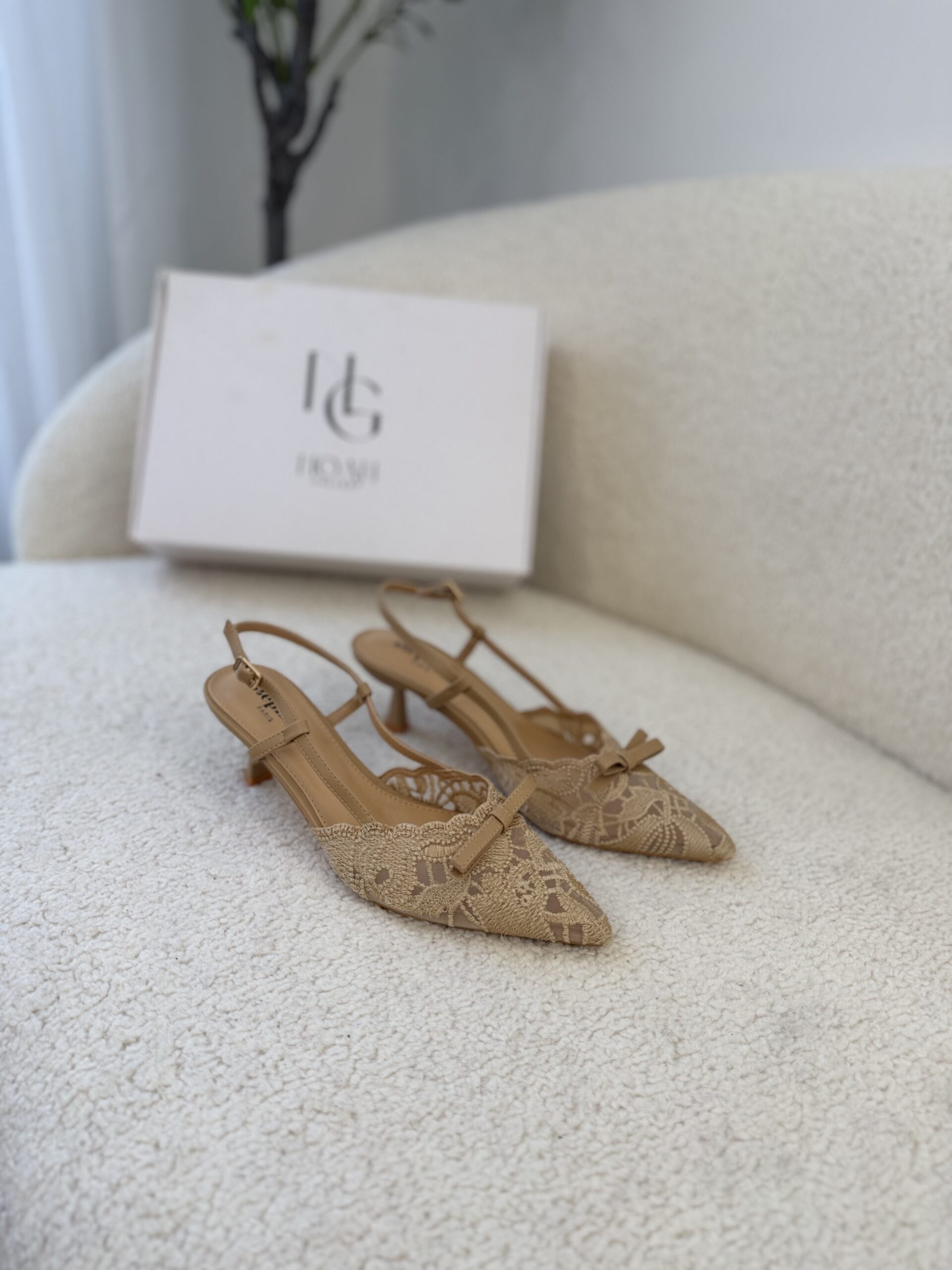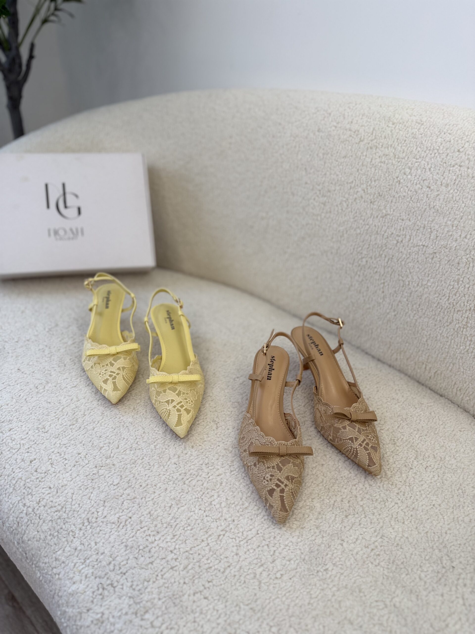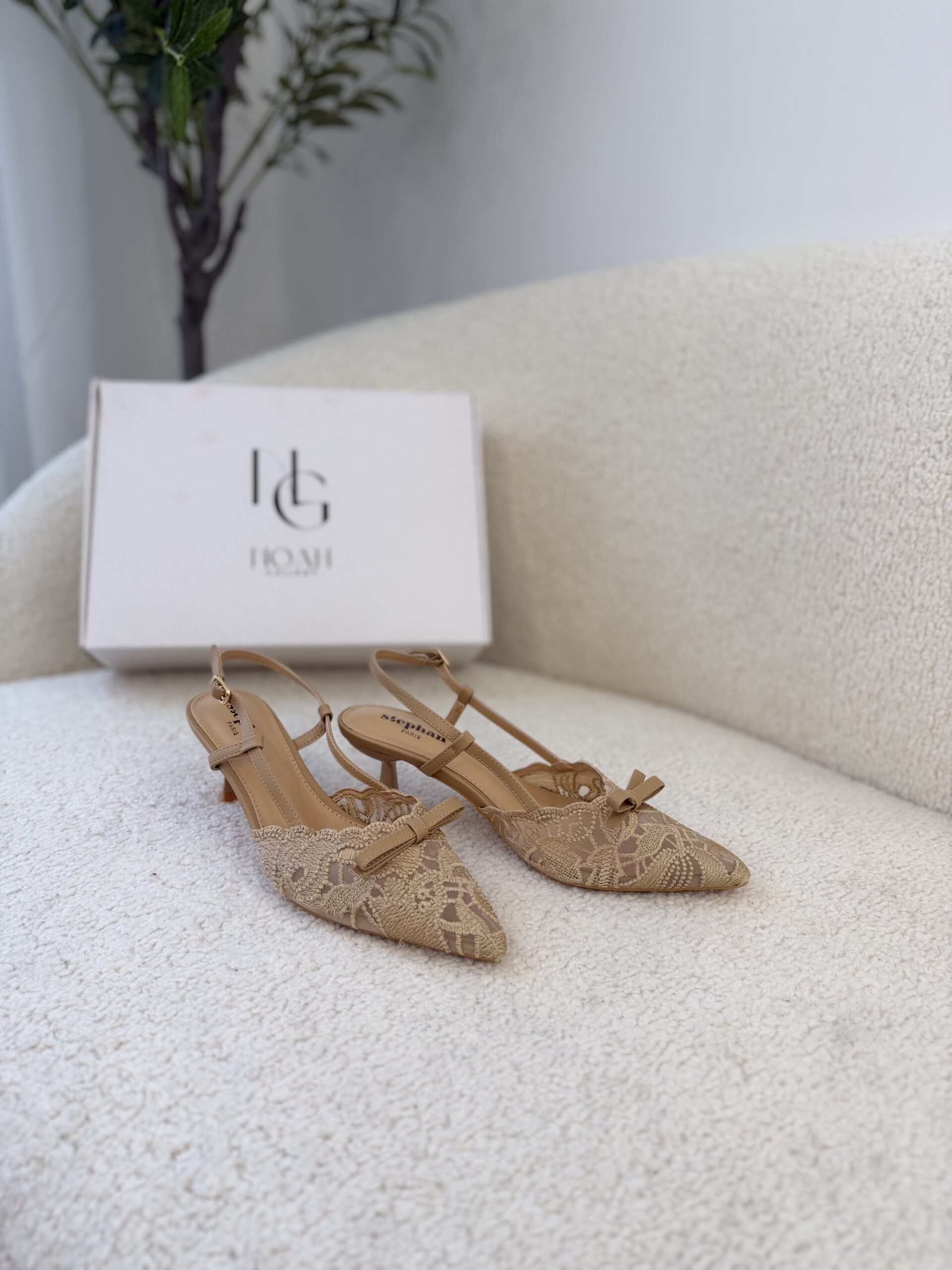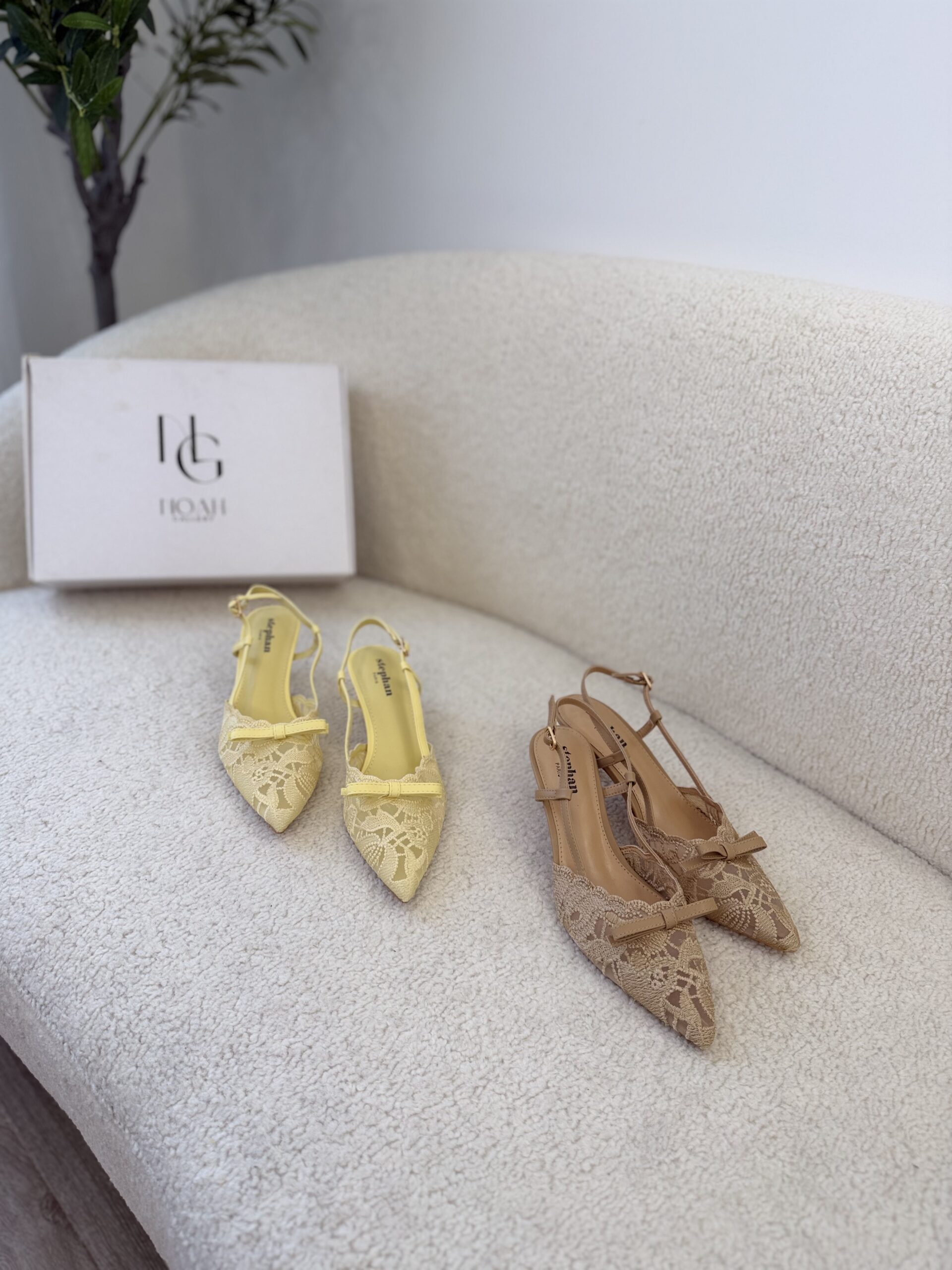 Escarpins raffinés au design féminin, sublimés par une délicate dentelle et un petit nœud sur le devant pour une touche romantique. Leur bout pointu et leur bride fine apportent une silhouette élégante, parfaite pour compléter une tenue chic ou habillée.