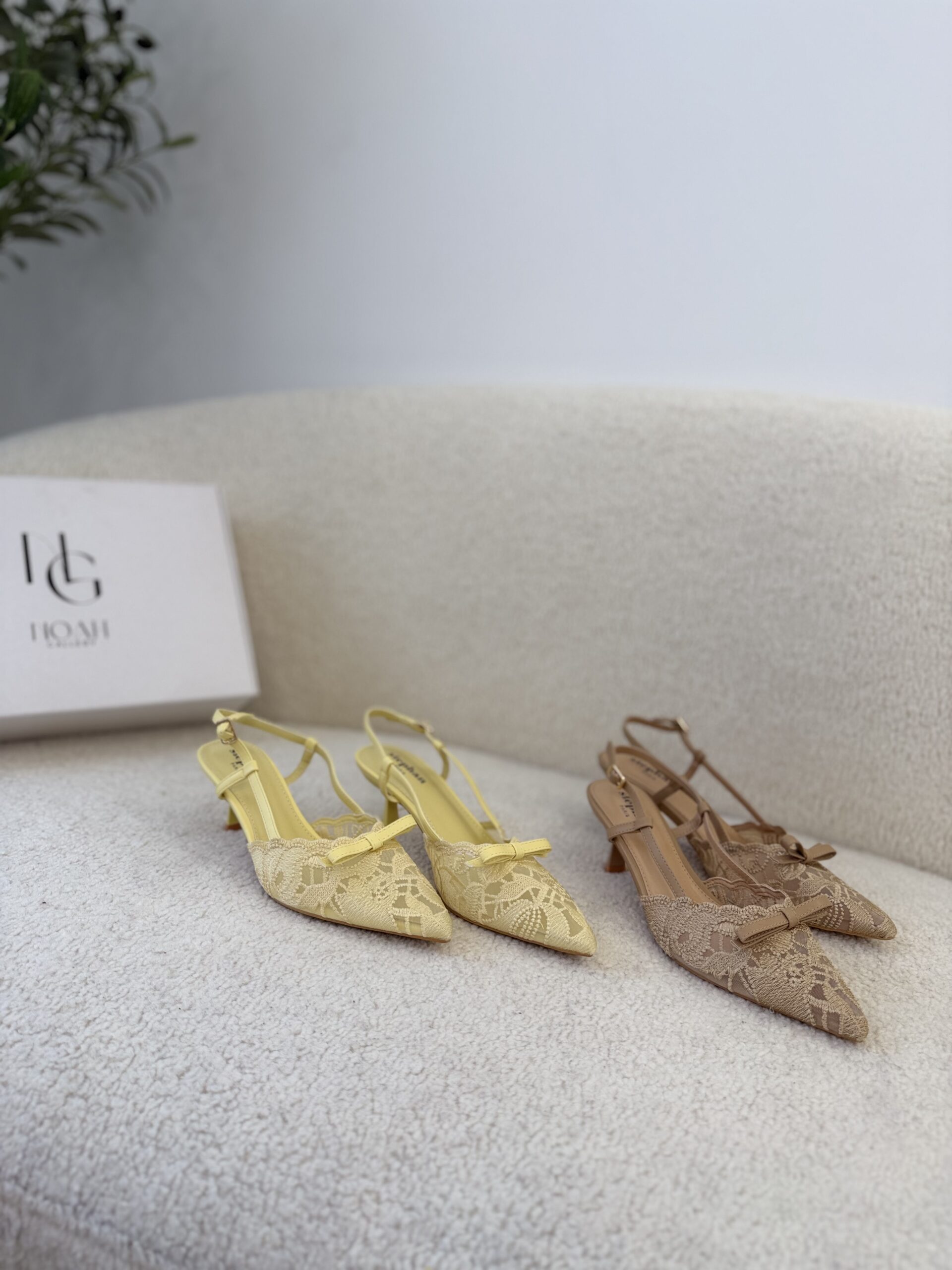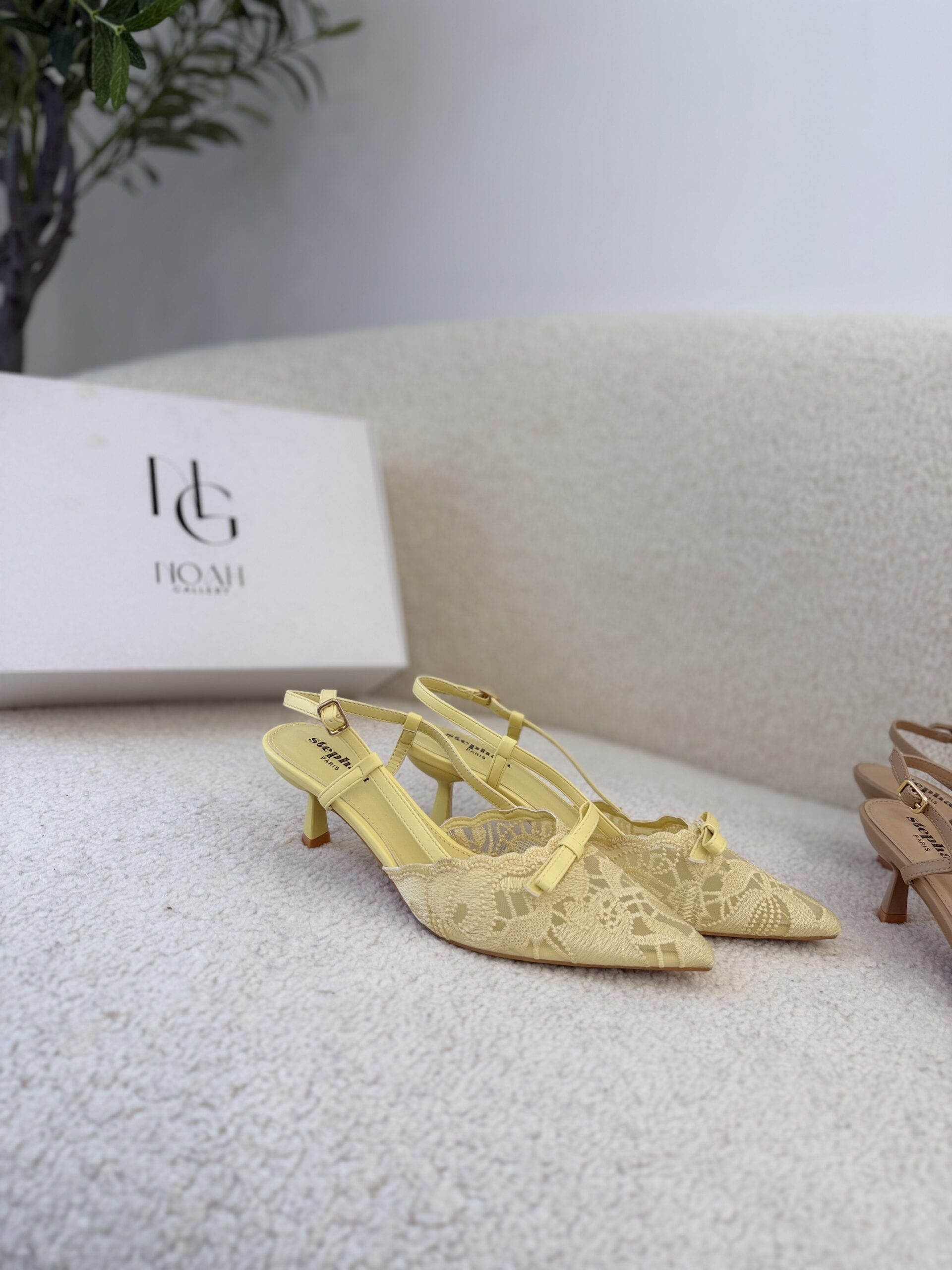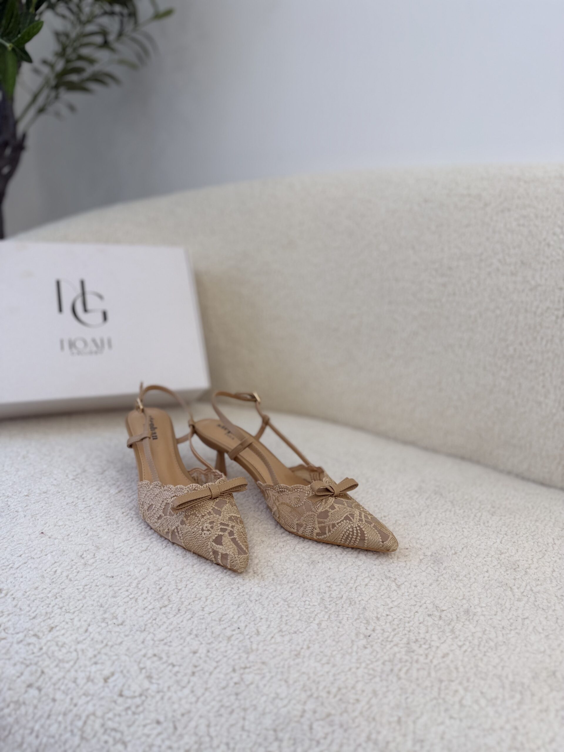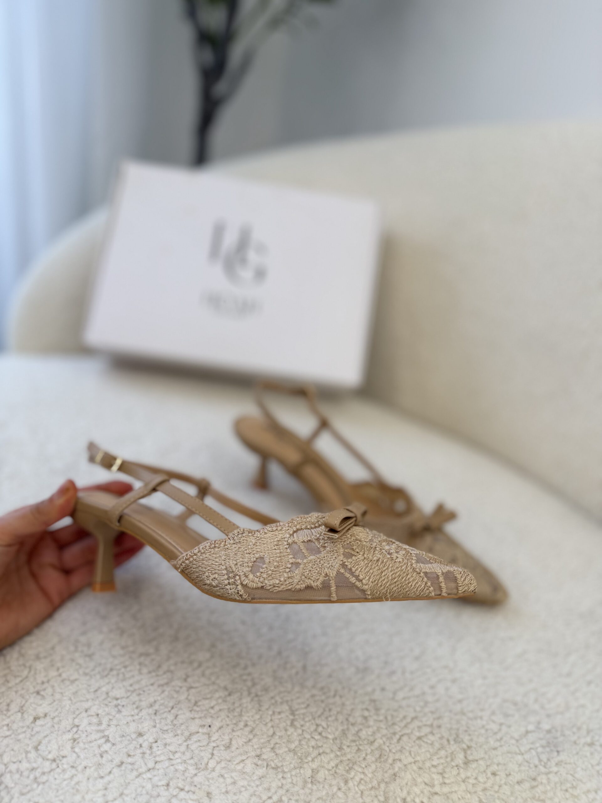 Escarpins raffinés au design féminin, sublimés par une délicate dentelle et un petit nœud sur le devant pour une touche romantique. Leur bout pointu et leur bride fine apportent une silhouette élégante, parfaite pour compléter une tenue chic ou habillée.