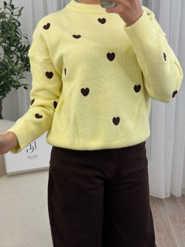 Ce pull jaune lumineux, délicatement orné de petits cœurs noirs, apporte une touche de douceur et de féminité à votre tenue. Sa coupe confortable et son tissu agréable à porter en font une pièce idéale pour le quotidien. Facile à associer avec un pantalon ou une jupe, il illumine le look tout en ajoutant une note romantique et moderne, parfaite pour un style à la fois simple et tendance.
