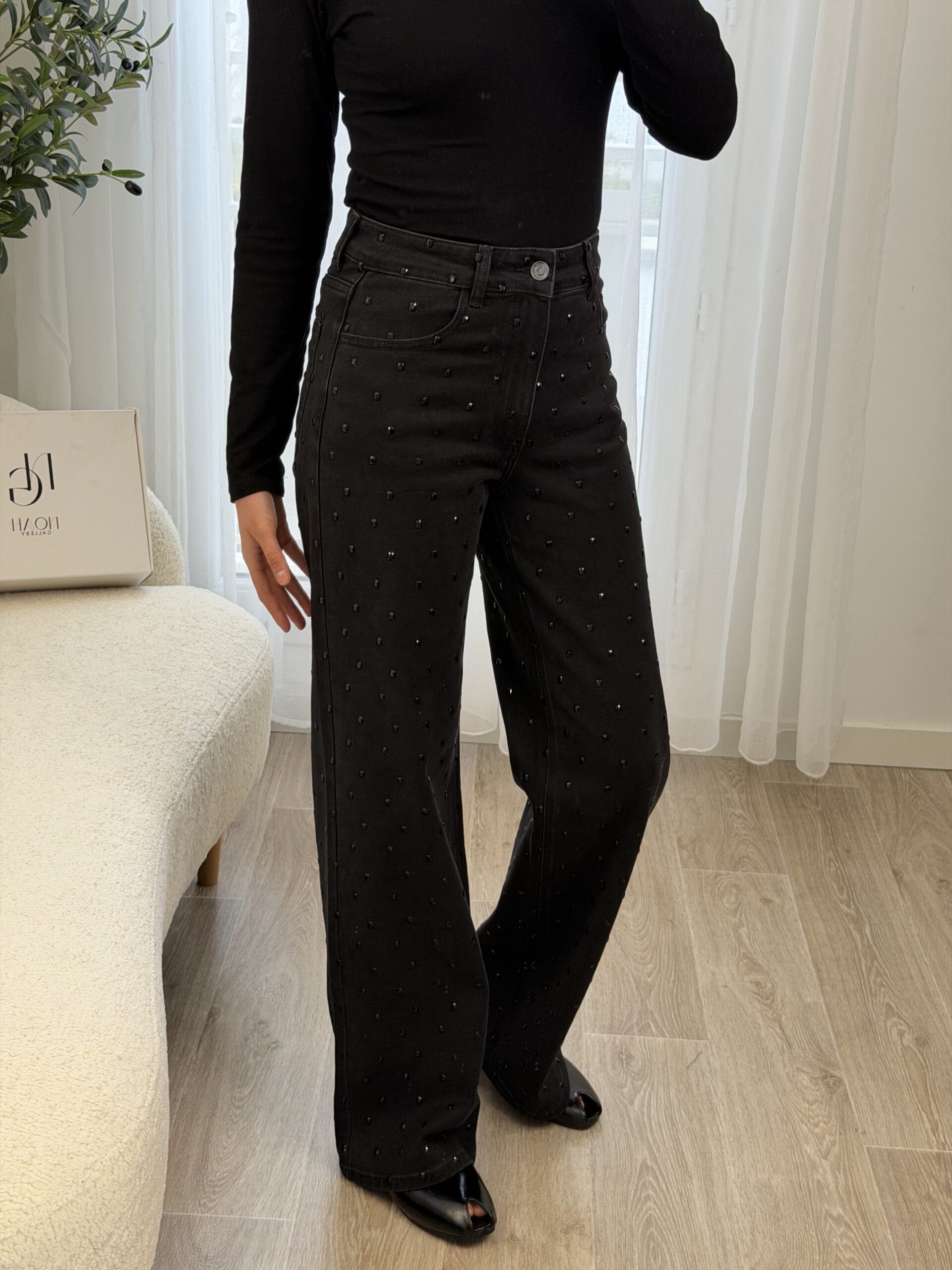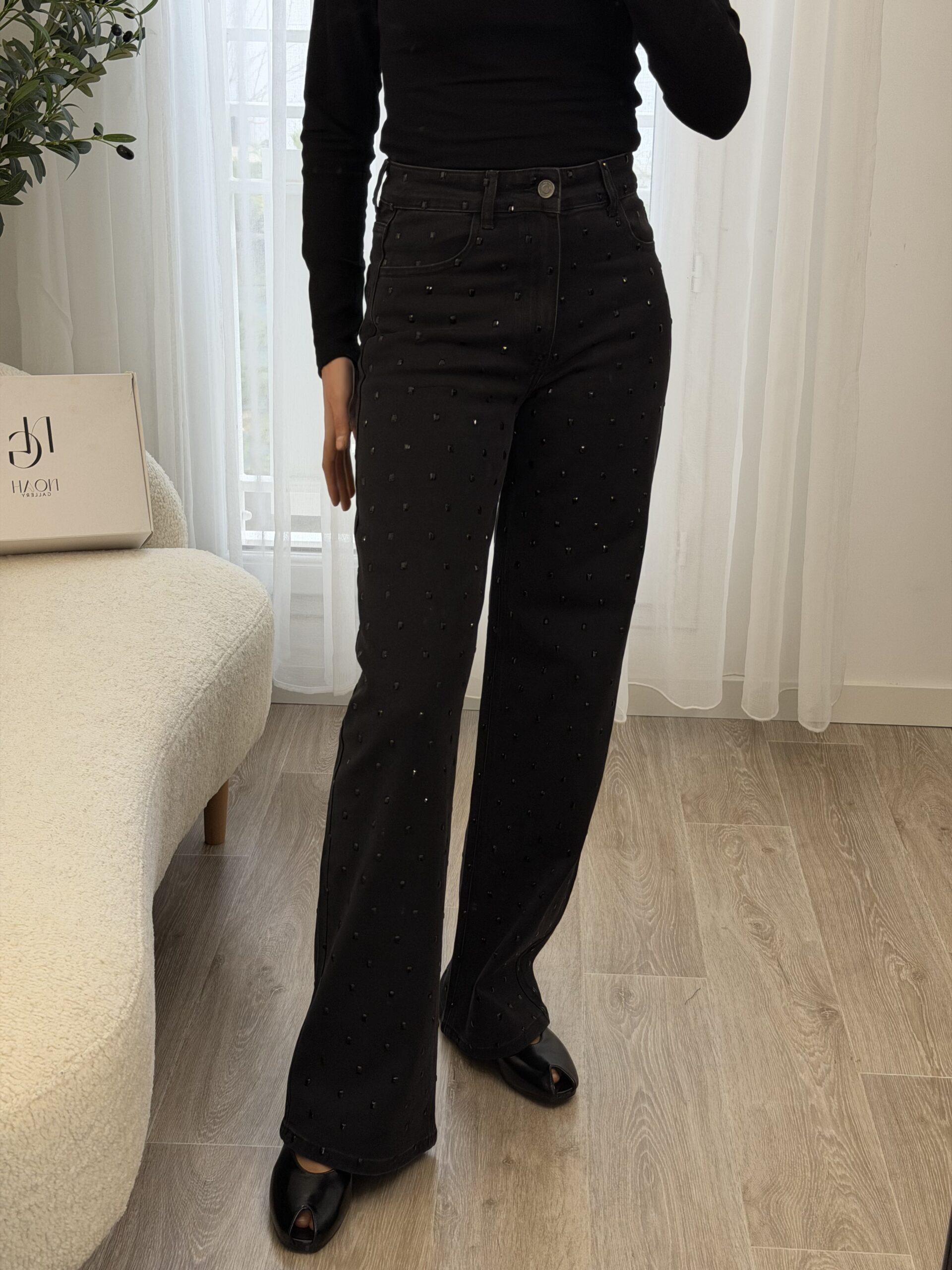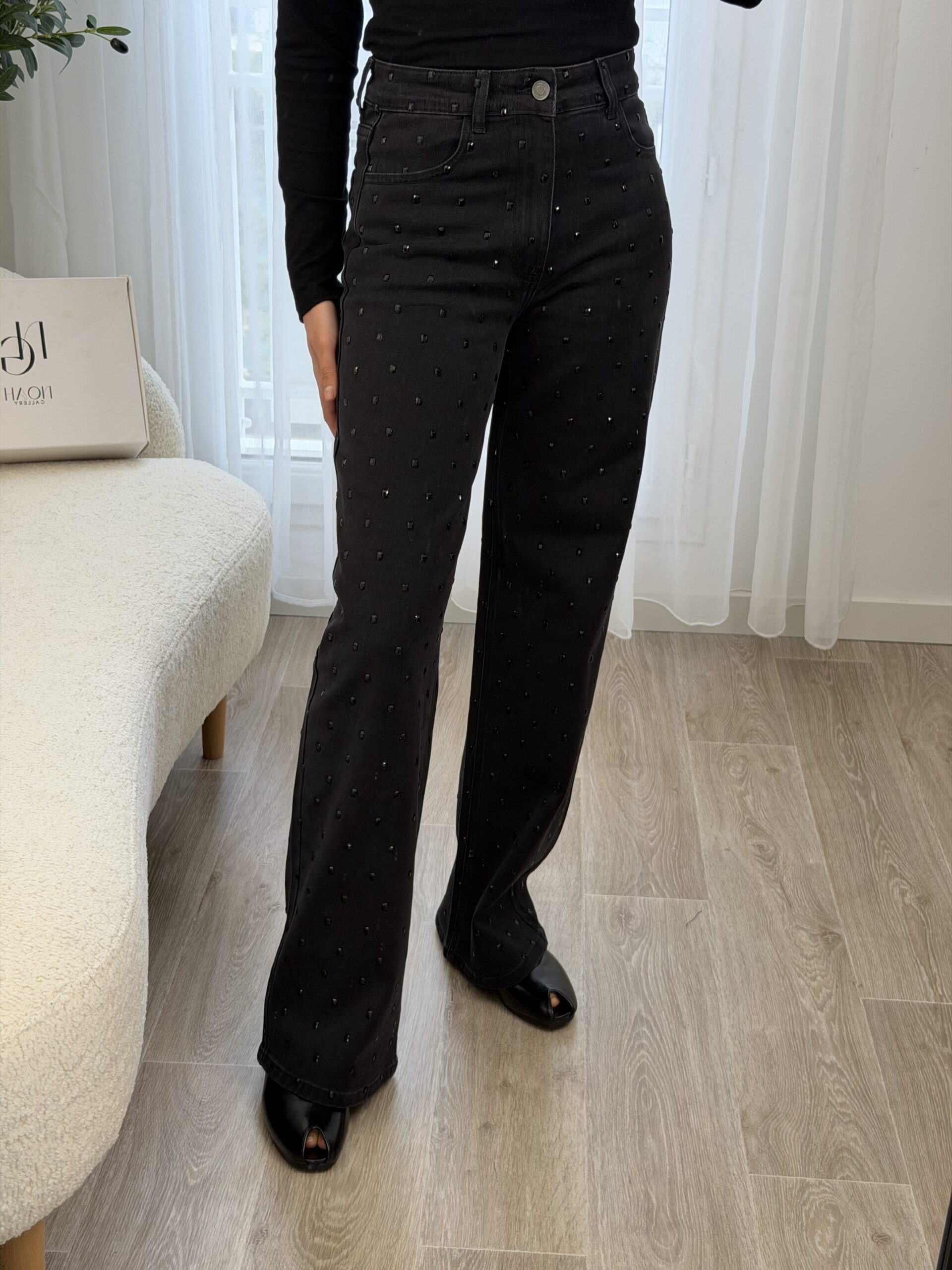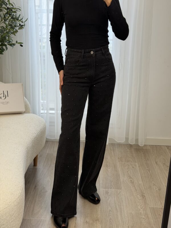 Jean noir taille haute à la coupe flatteuse et à la longueur généreuse, idéal pour allonger la silhouette. Orné de grands strass noirs ton sur ton, il apporte une touche glamour subtile tout en restant élégant. Parfait pour un look chic et moderne, de jour comme en soirée.