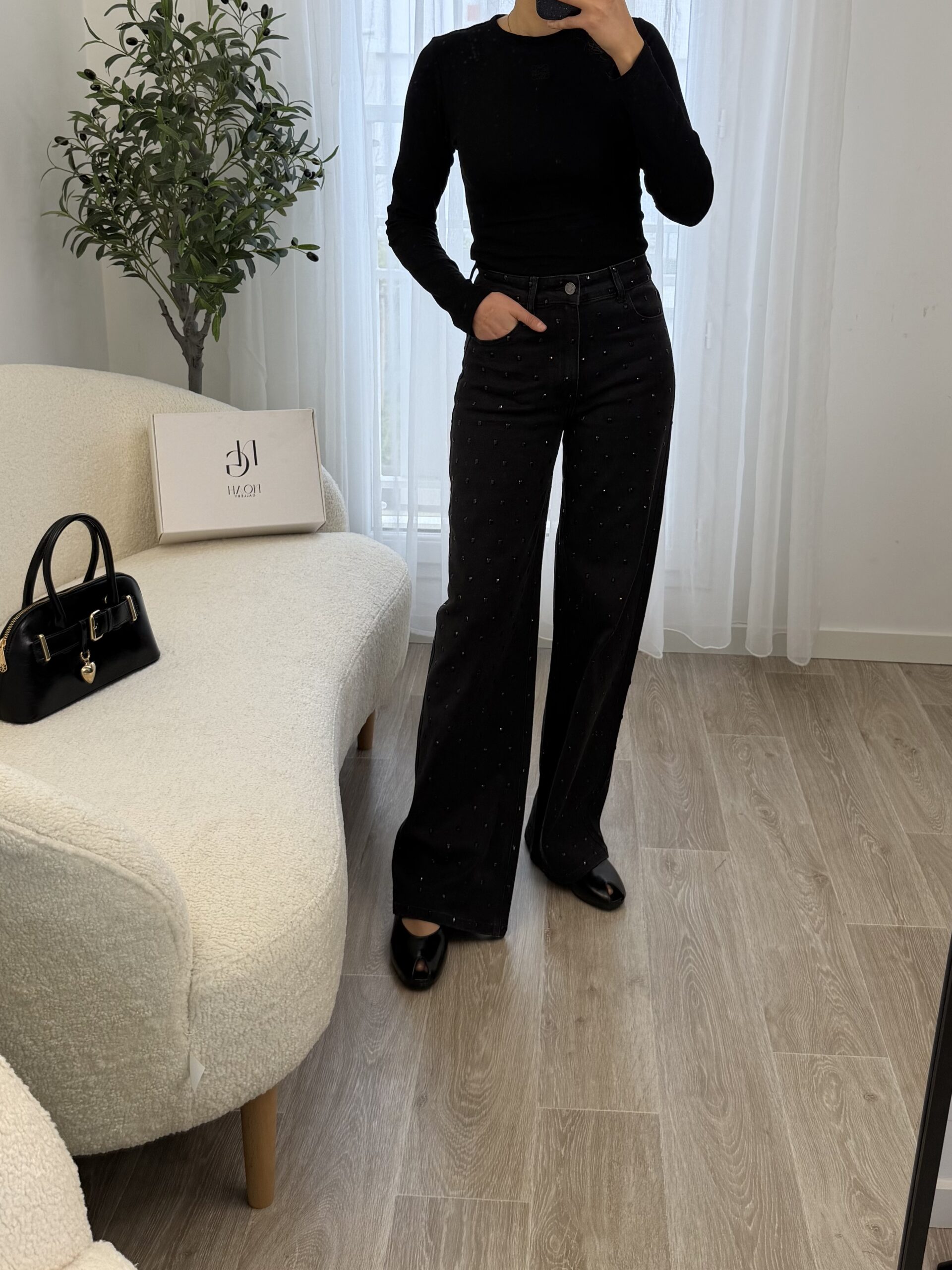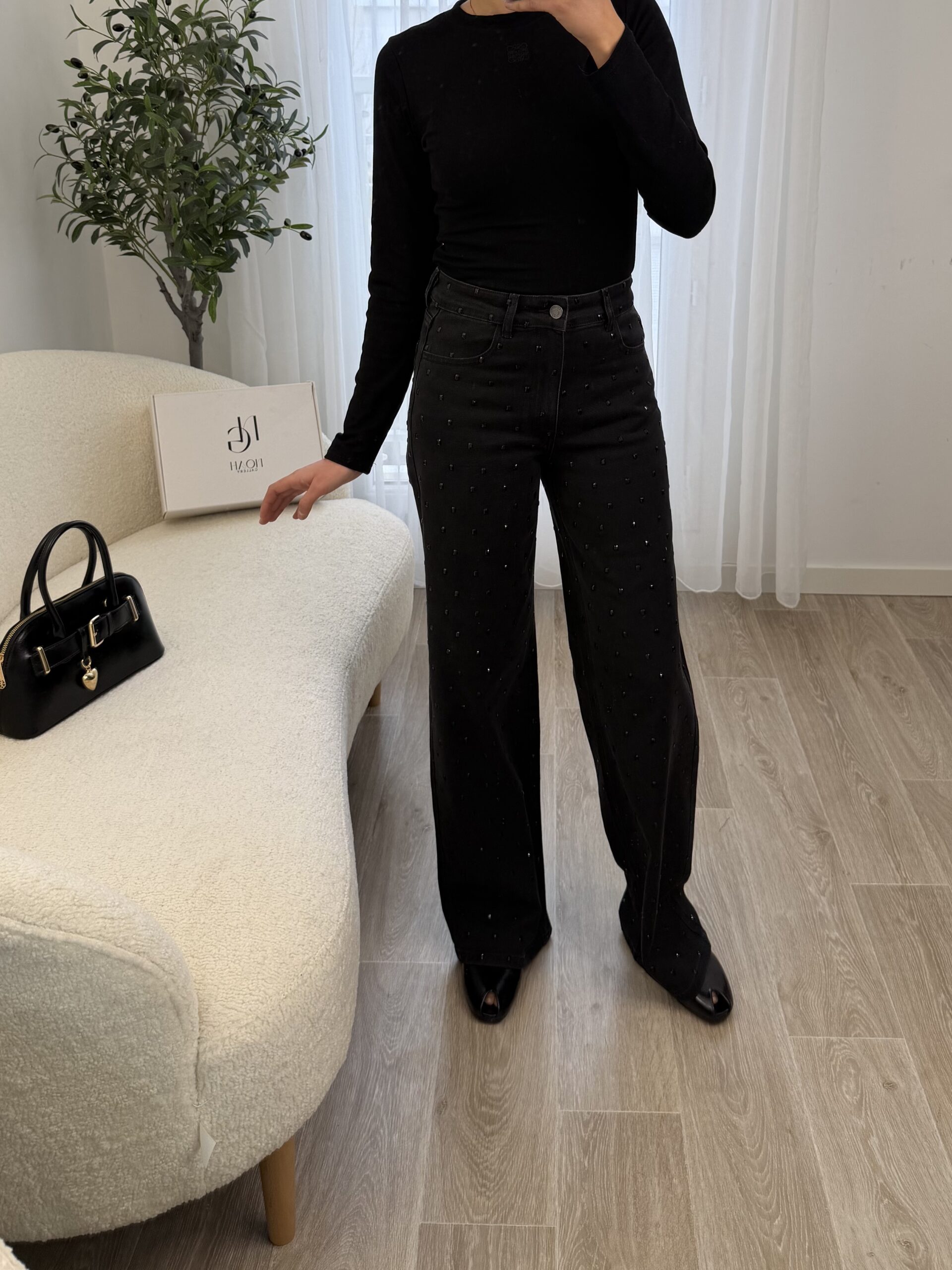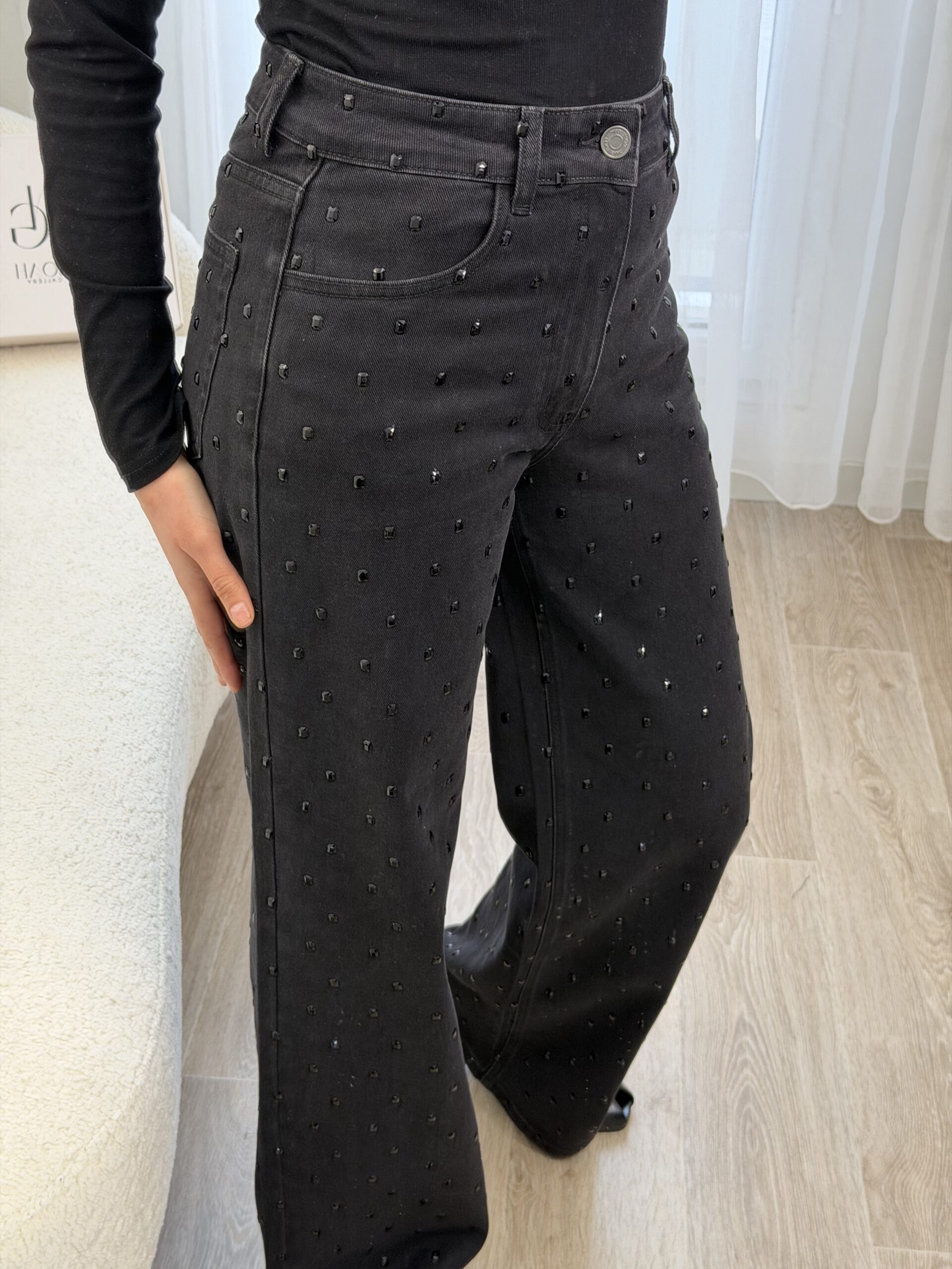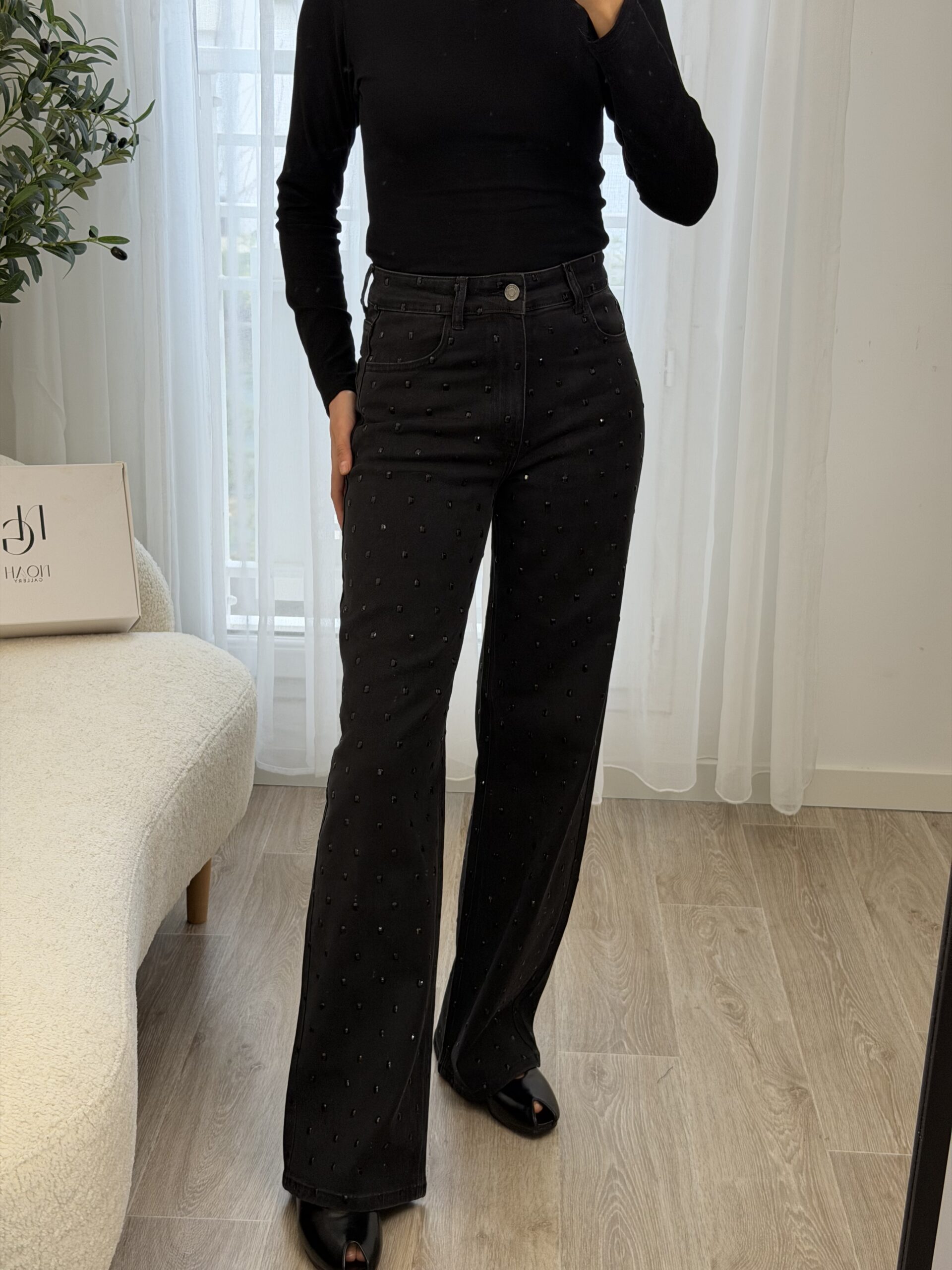 Jean noir taille haute à la coupe flatteuse et à la longueur généreuse, idéal pour allonger la silhouette. Orné de grands strass noirs ton sur ton, il apporte une touche glamour subtile tout en restant élégant. Parfait pour un look chic et moderne, de jour comme en soirée.