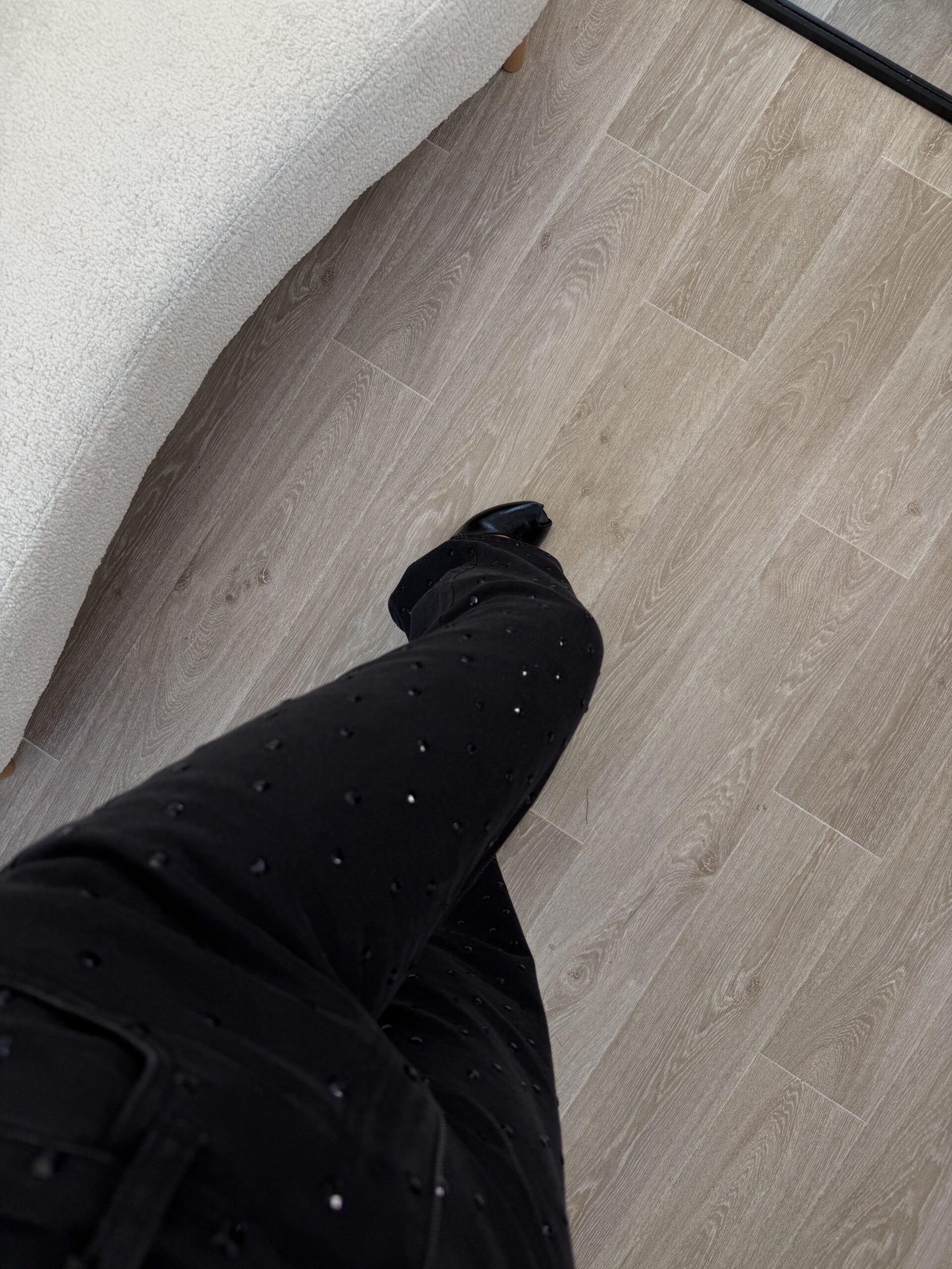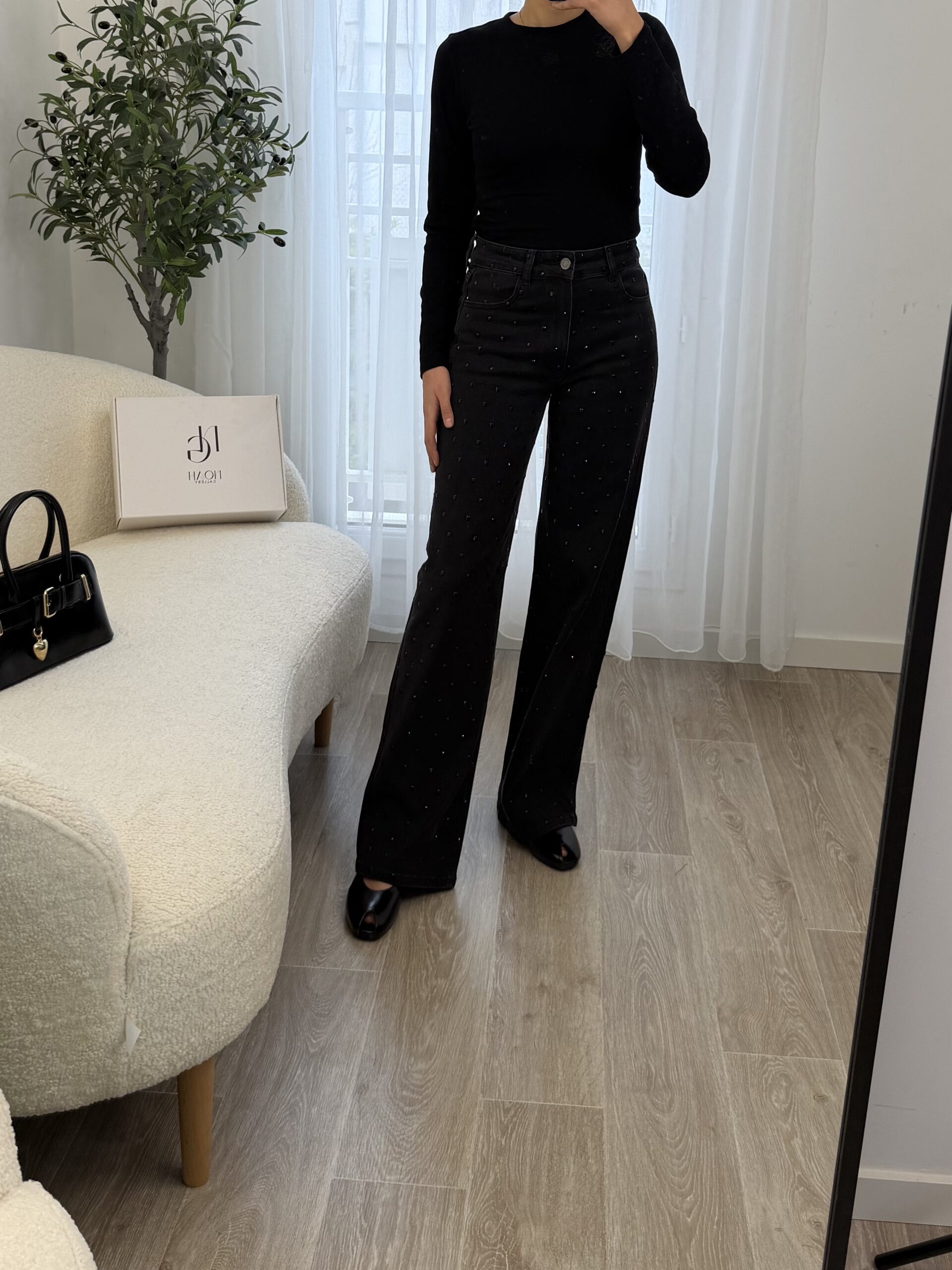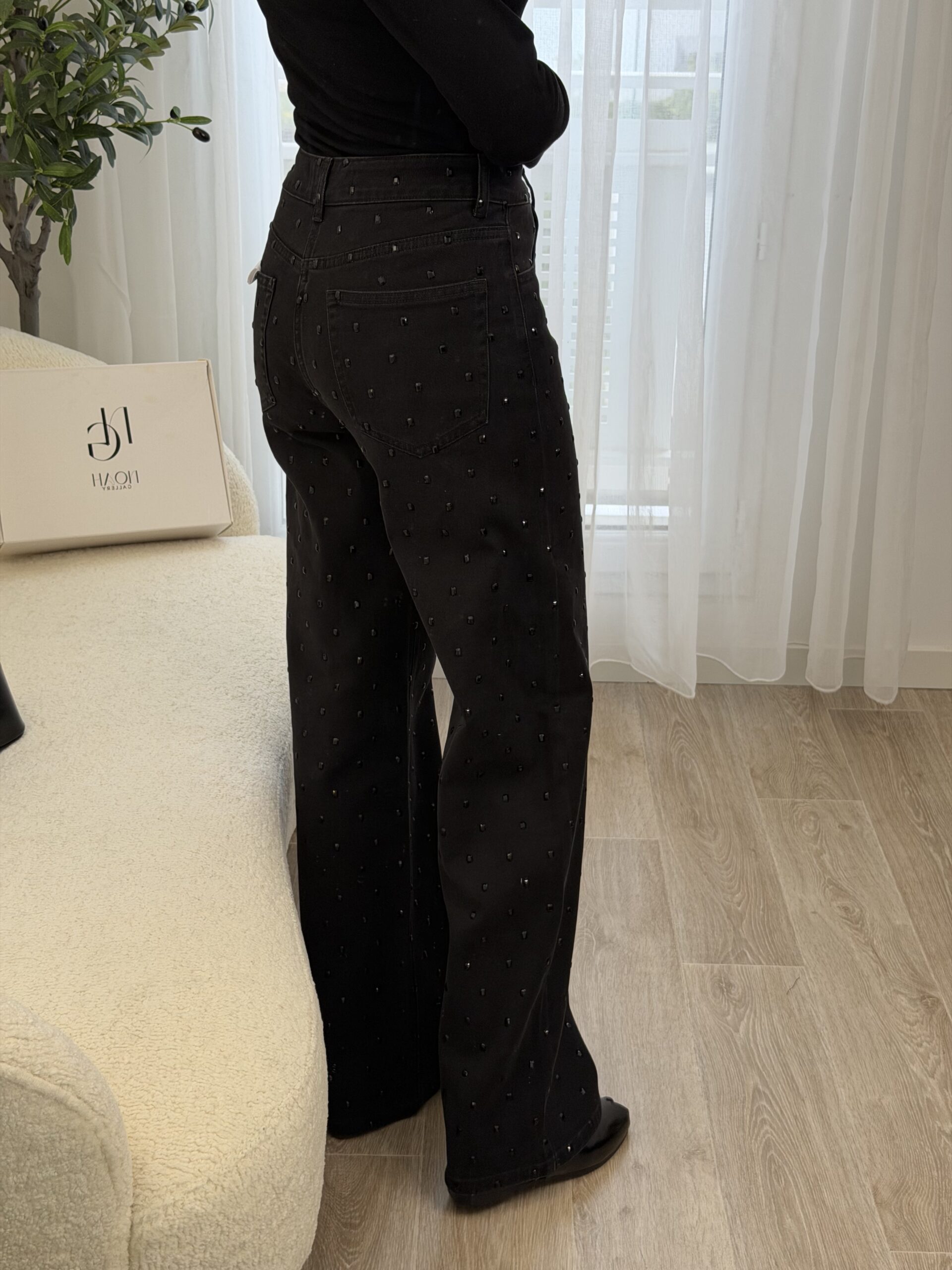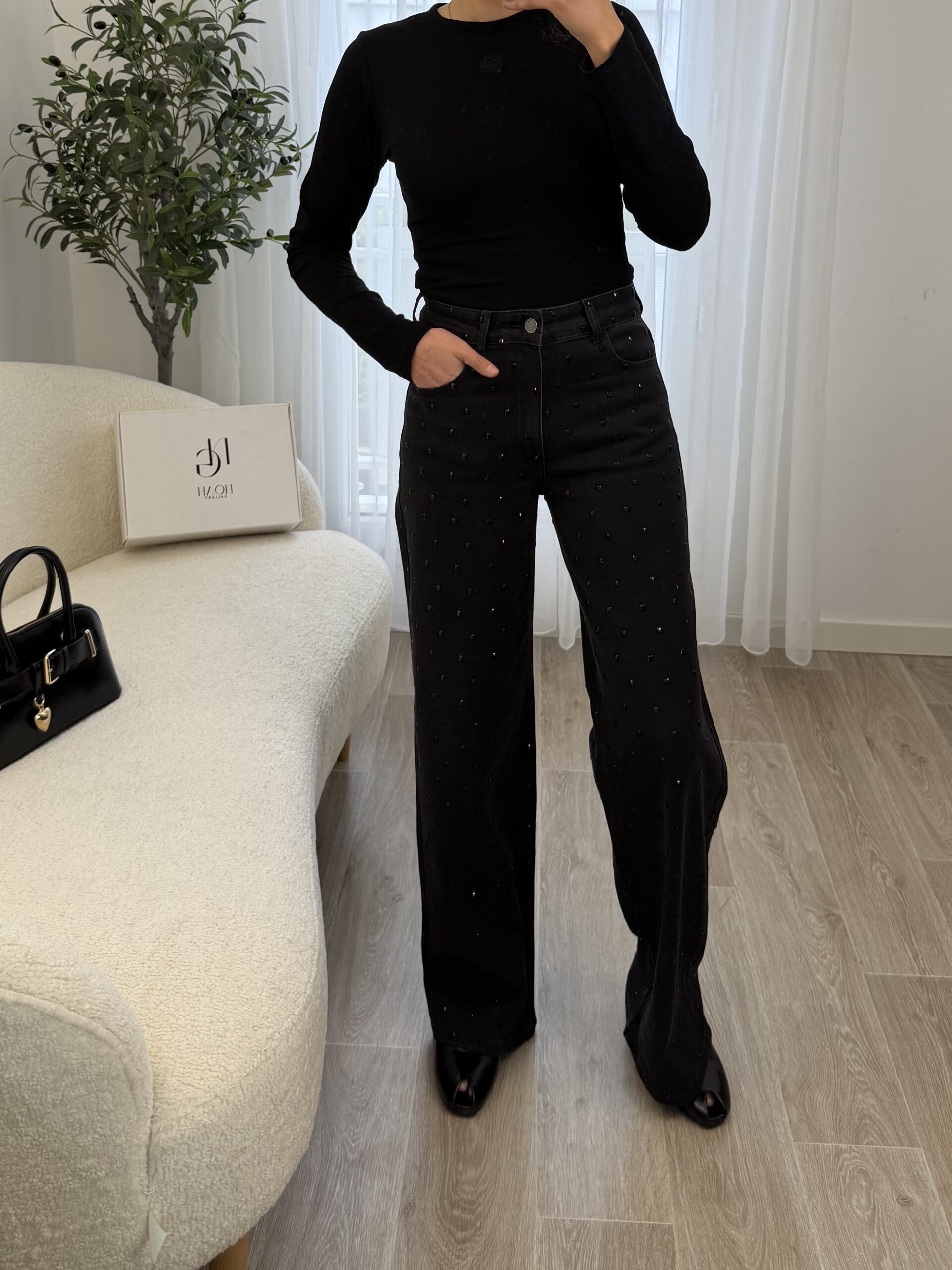 Jean noir taille haute à la coupe flatteuse et à la longueur généreuse, idéal pour allonger la silhouette. Orné de grands strass noirs ton sur ton, il apporte une touche glamour subtile tout en restant élégant. Parfait pour un look chic et moderne, de jour comme en soirée.