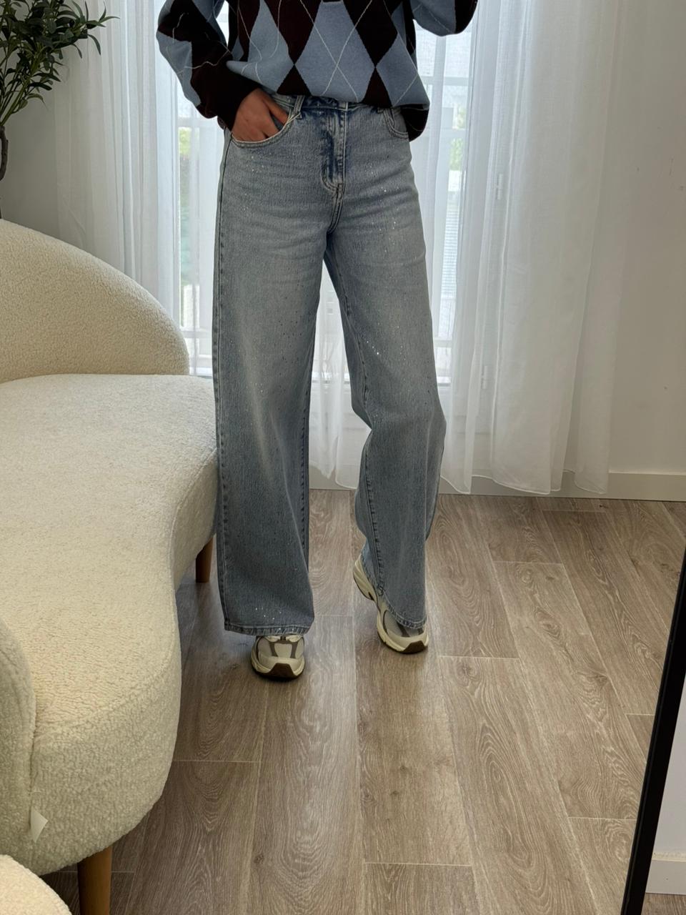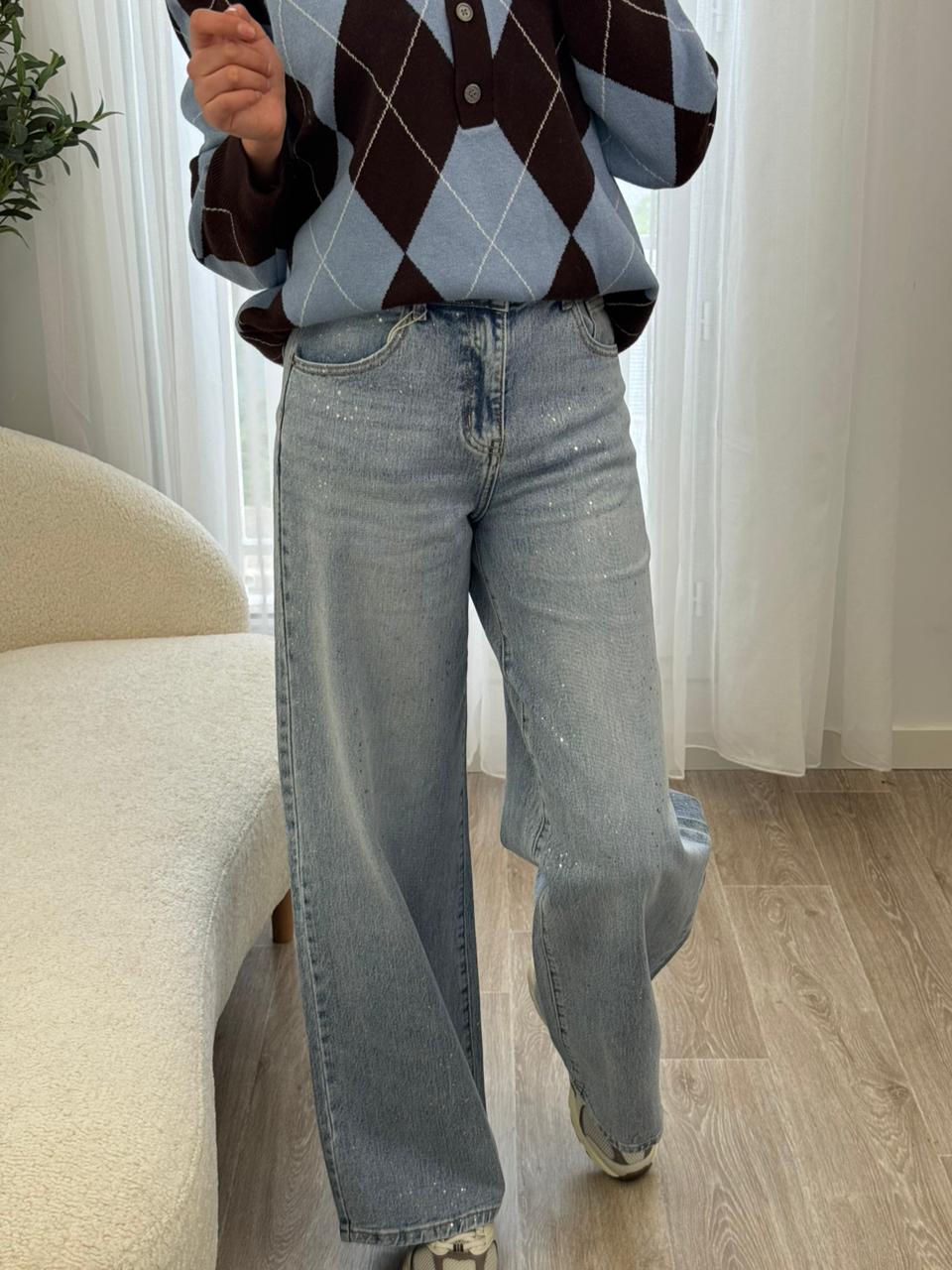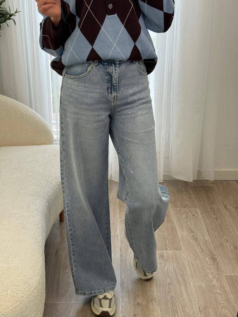Jean coupe large au style moderne et décontracté, confectionné dans un denim bleu clair avec de délicats détails scintillants qui apportent une touche lumineuse et tendance. Sa taille confortable et sa coupe fluide allongent la silhouette tout en offrant une grande liberté de mouvement. Facile à associer avec un pull, une chemise ou un top simple, c’est la pièce idéale pour un look casual chic au quotidien.
