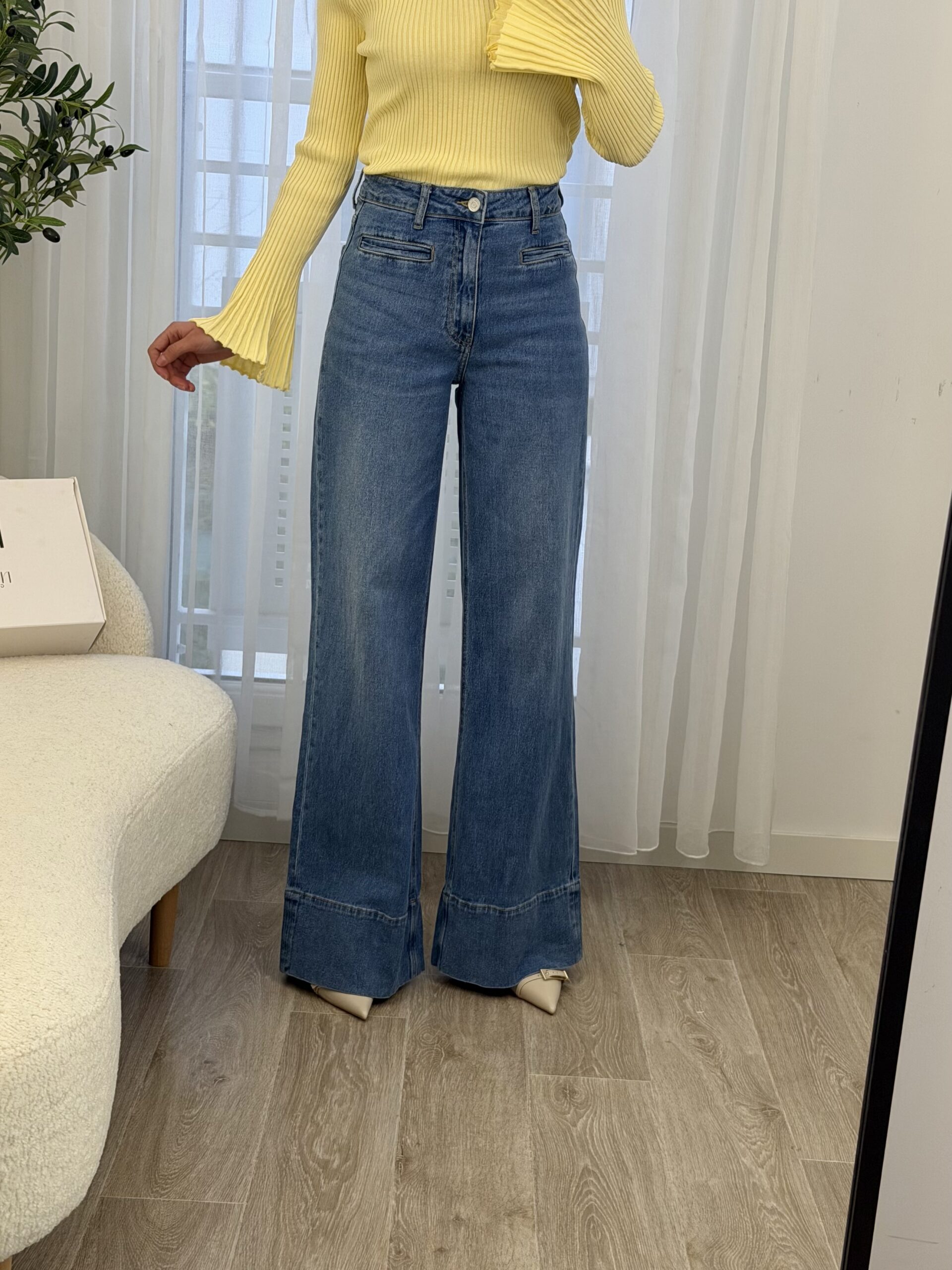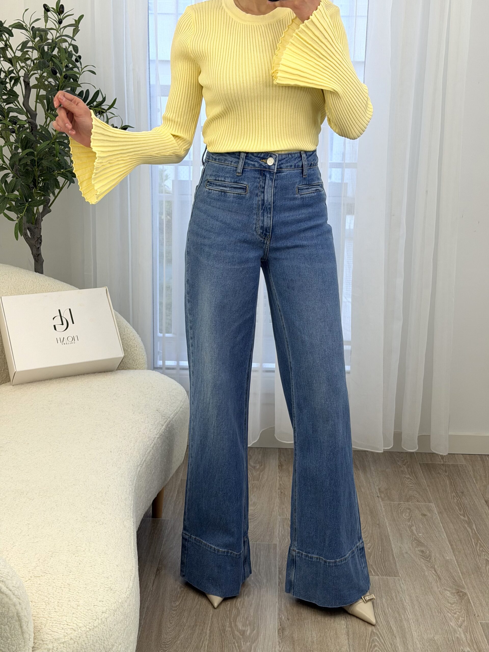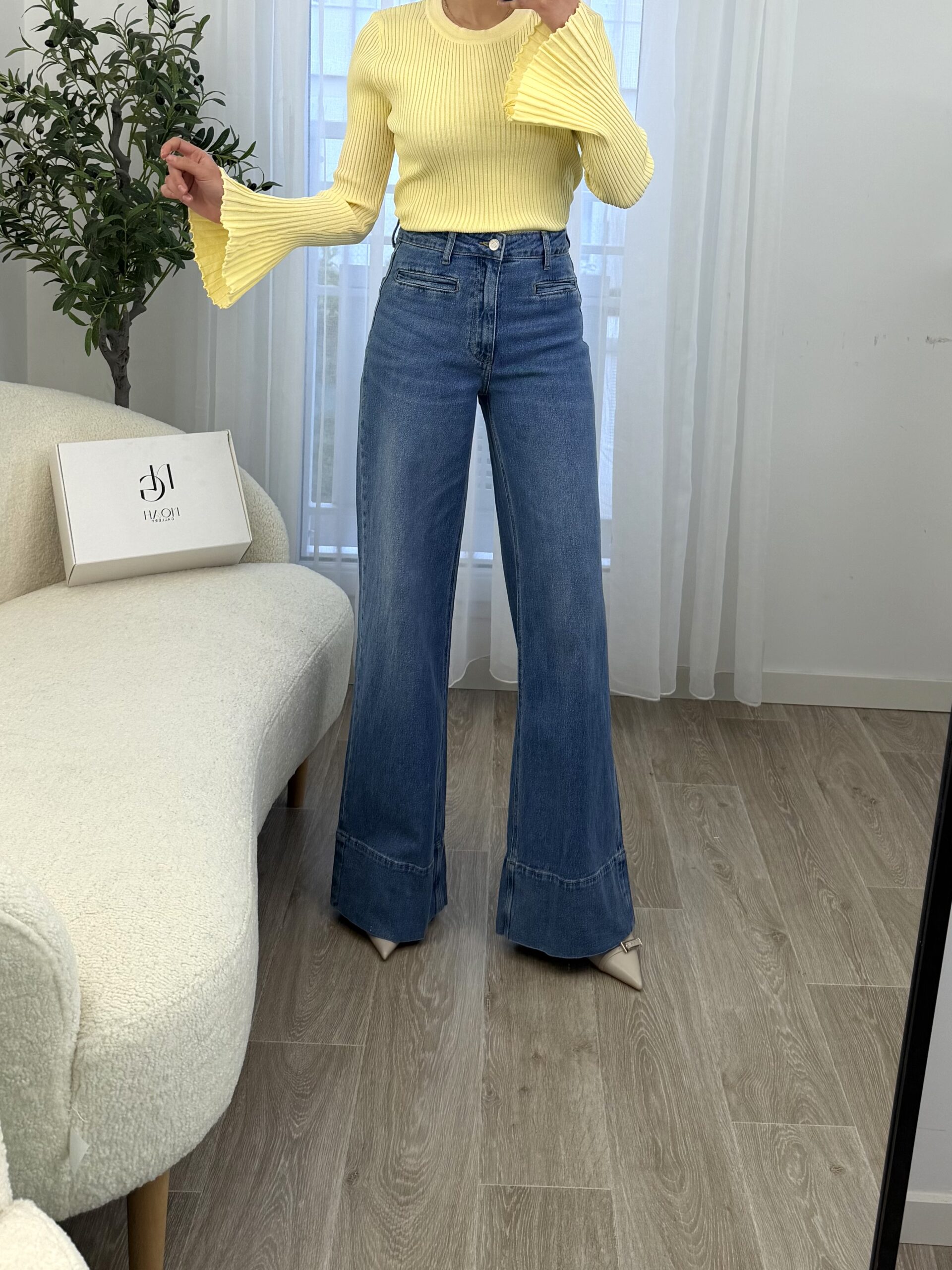 Jean taille haute à la coupe flare très longue, conçu pour allonger la silhouette et offrir une allure élégante et moderne. Son denim bleu structuré épouse la taille tout en s’évasant harmonieusement sur la jambe. Une pièce forte et flatteuse, idéale avec des talons comme avec des plateformes.