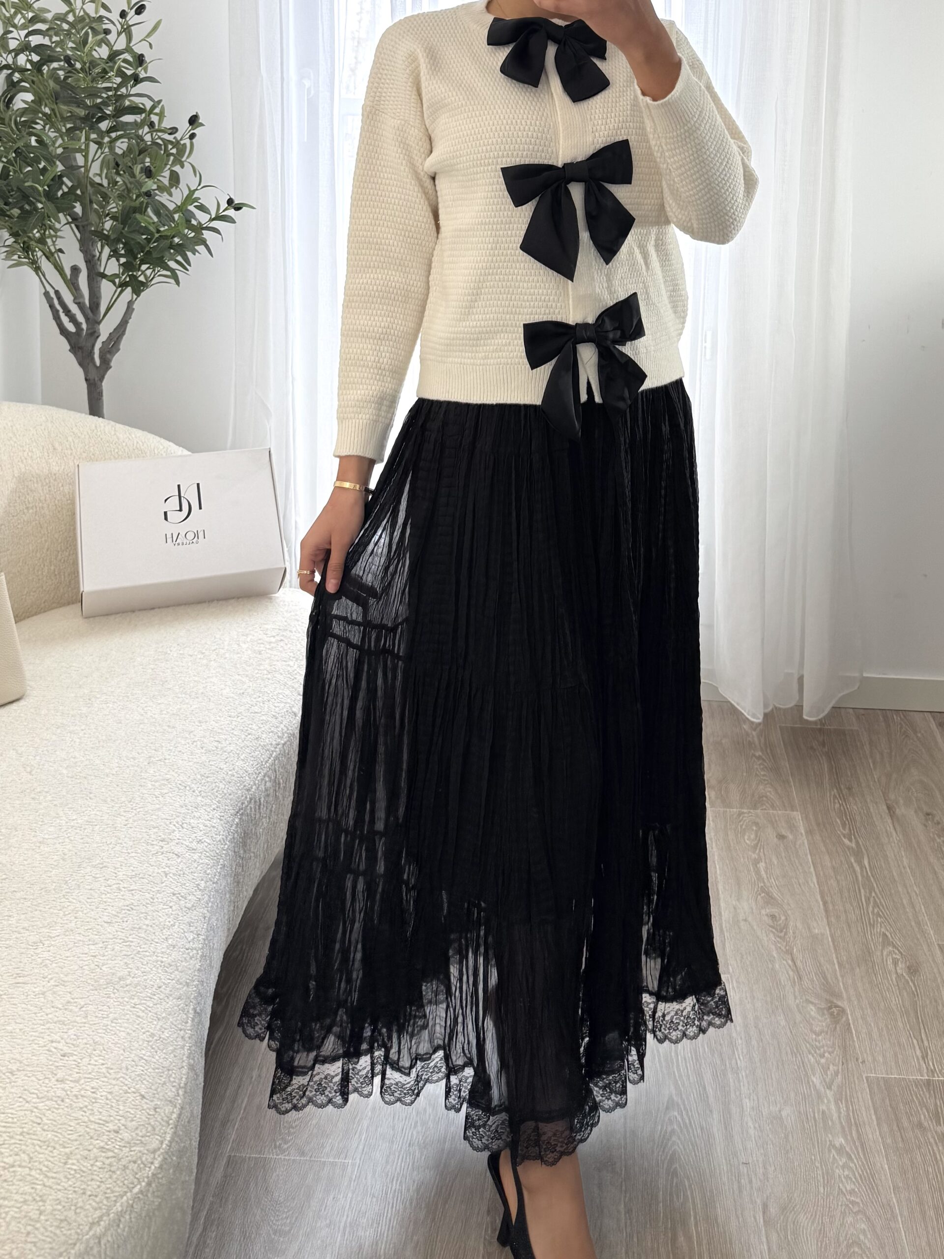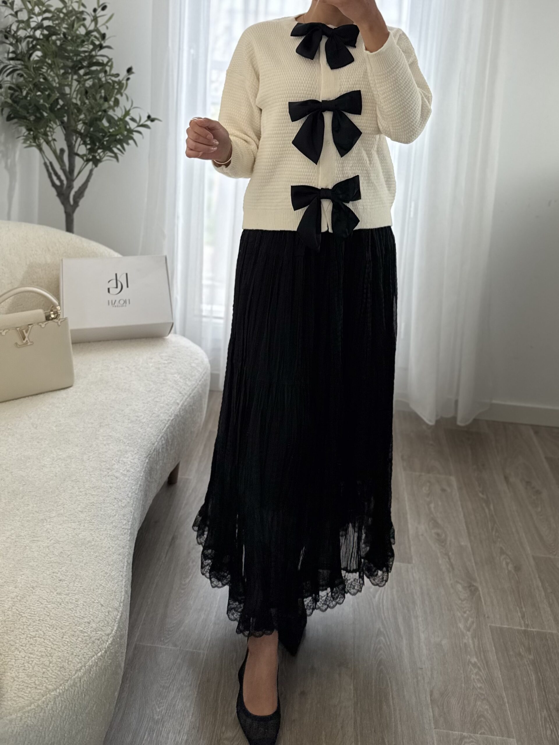Laisse-toi séduire par l’élégance intemporelle de notre jupe longue noire plissée. Légère et fluide, elle offre une allure à la fois féminine et sophistiquée. Sa texture délicatement plissée et sa finition en dentelle apportent une touche raffinée, parfaite pour toutes les occasions — du look chic de soirée au style bohème du quotidien. Facile à associer avec un chemisier ou un pull ajusté, cette jupe deviendra sans aucun doute une pièce phare de ta garde-robe.