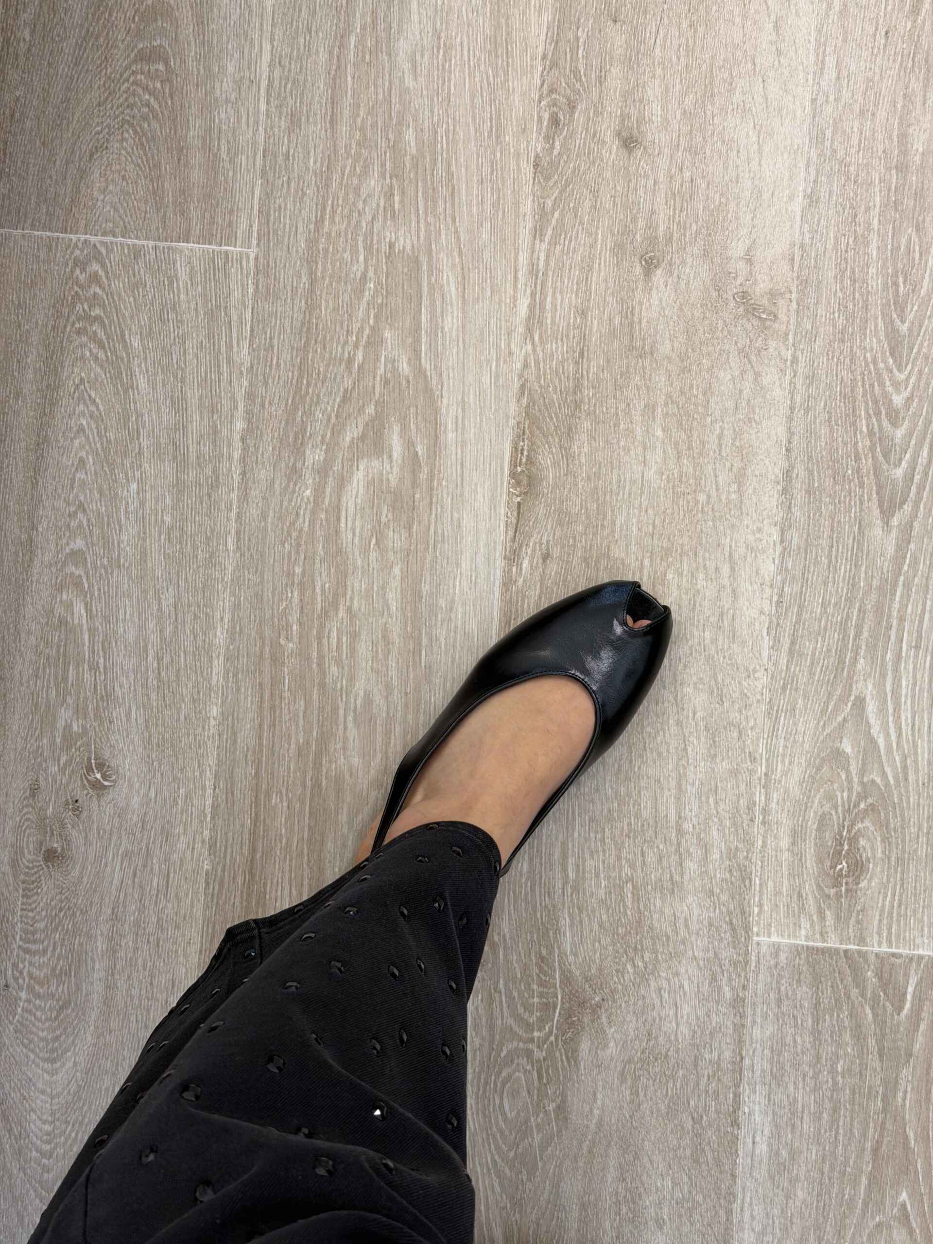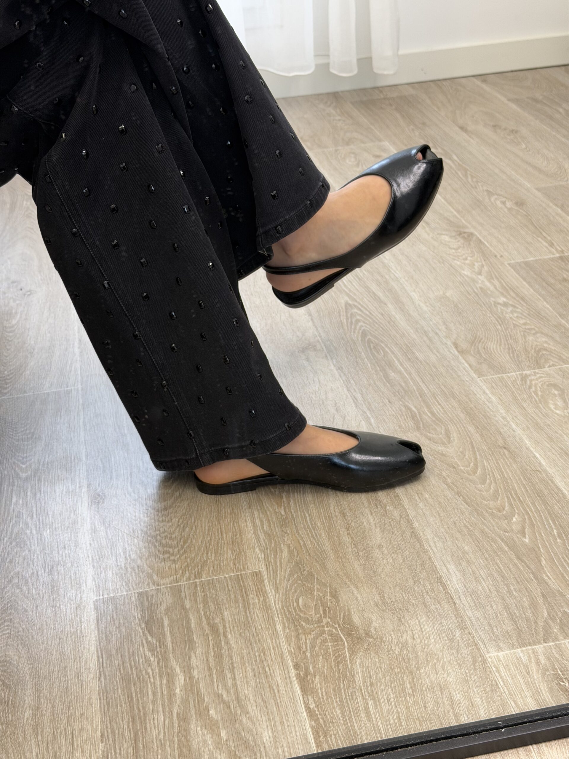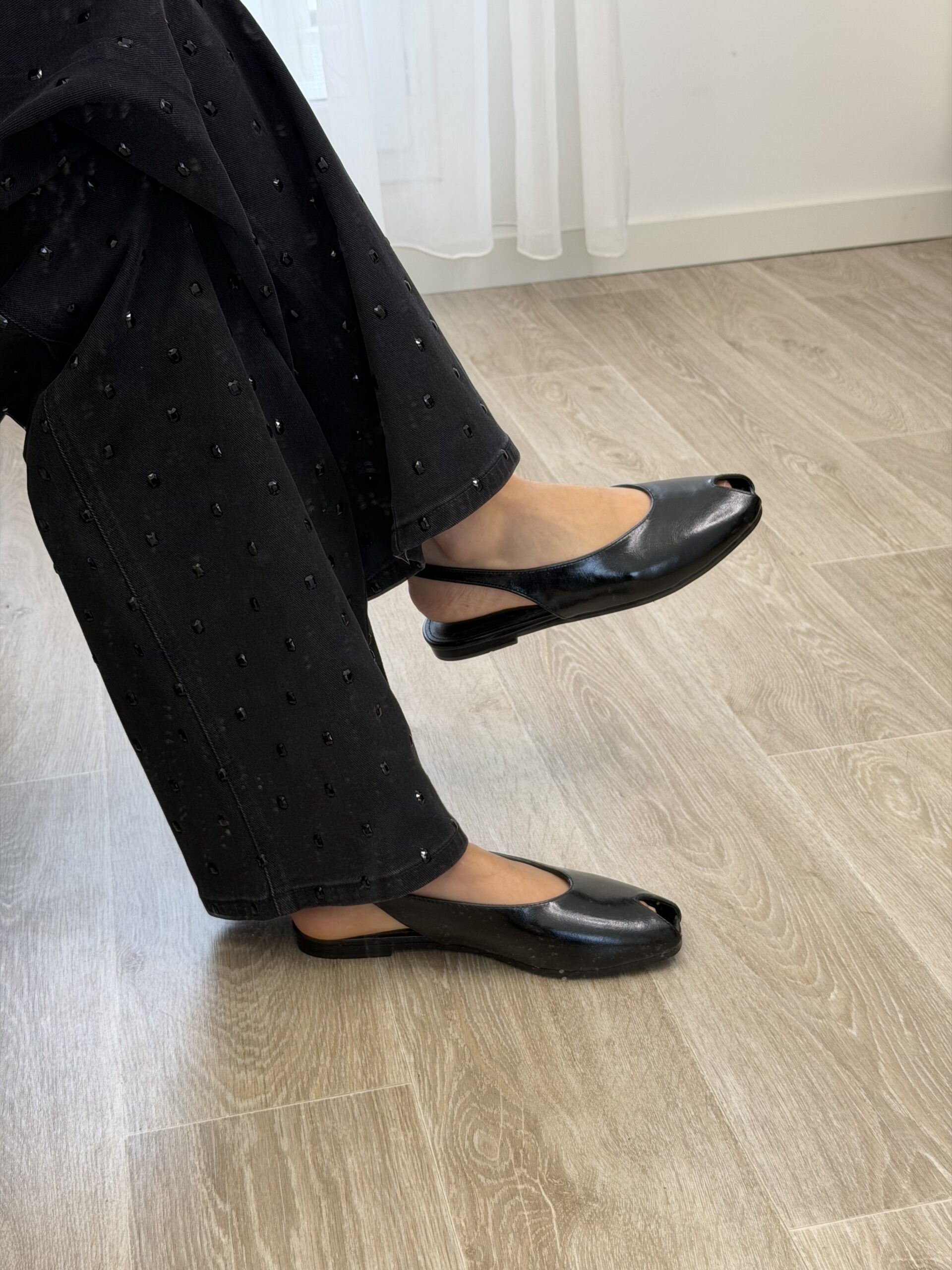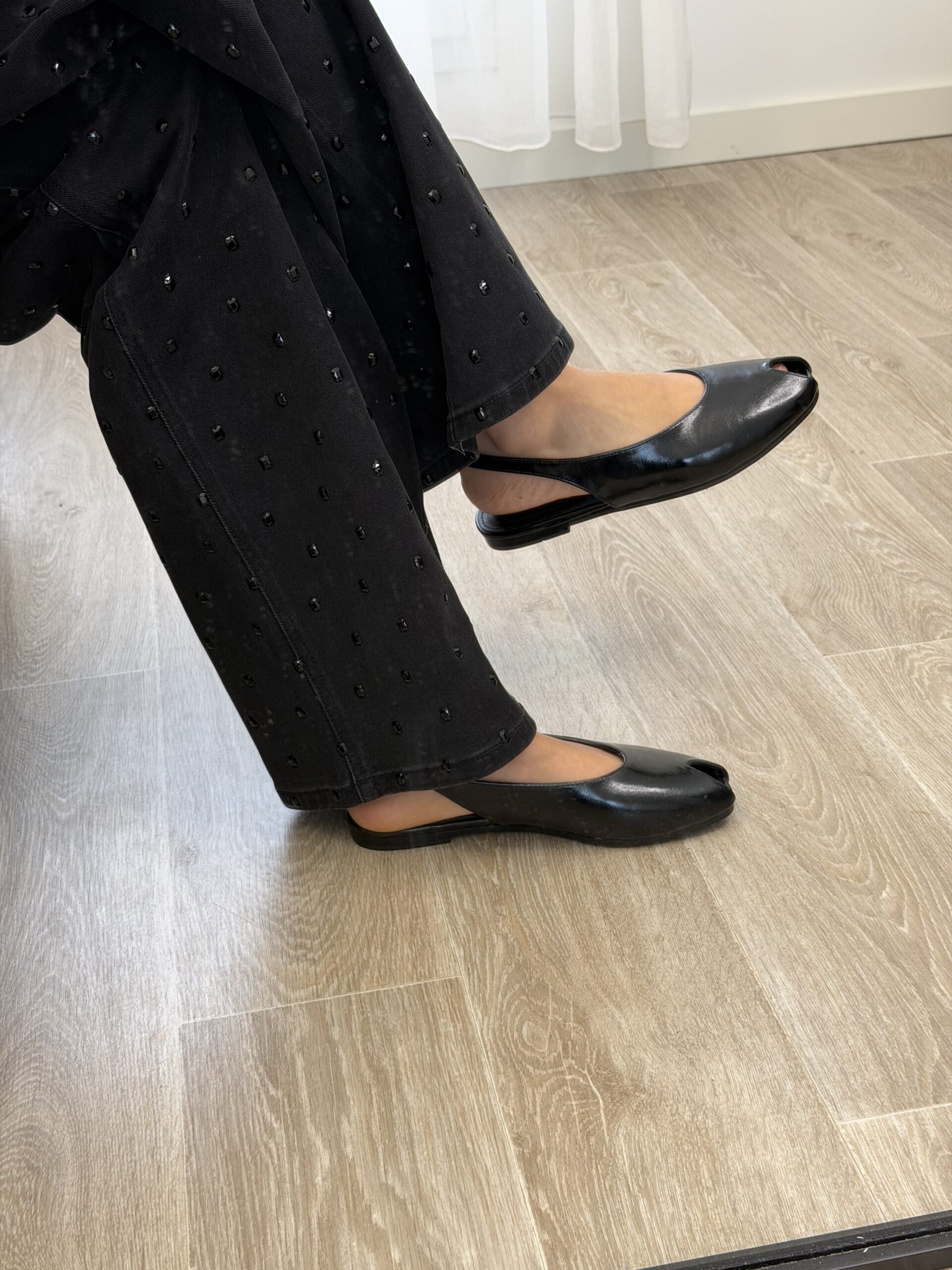 Mules plates en noir brillant au design épuré et sophistiqué. Bout légèrement ouvert pour une touche moderne, avec une finition lisse qui apporte chic et minimalisme. Confortables et faciles à porter, elles complètent parfaitement un jean à strass ou une tenue habillée pour un look raffiné et tendance.