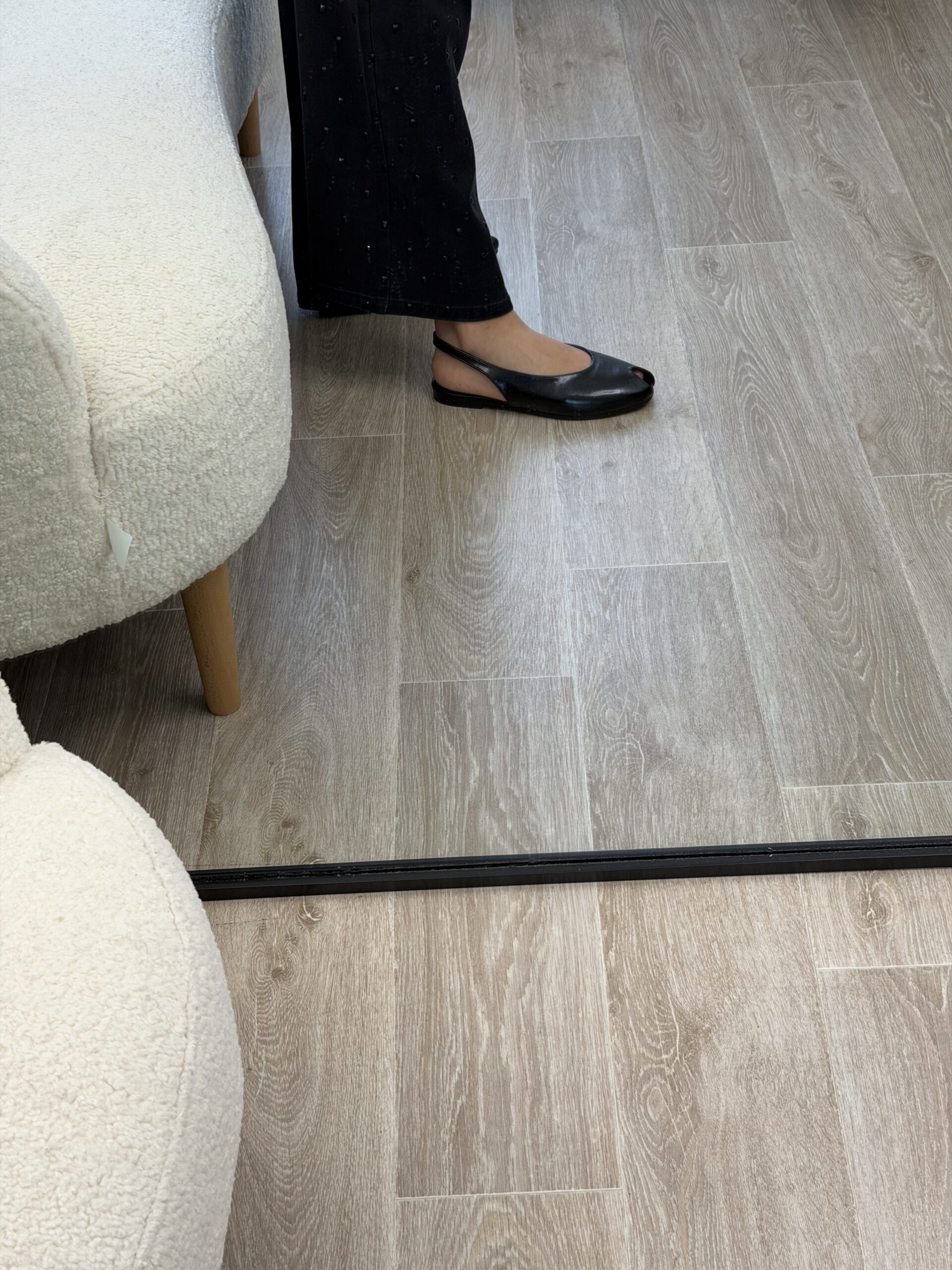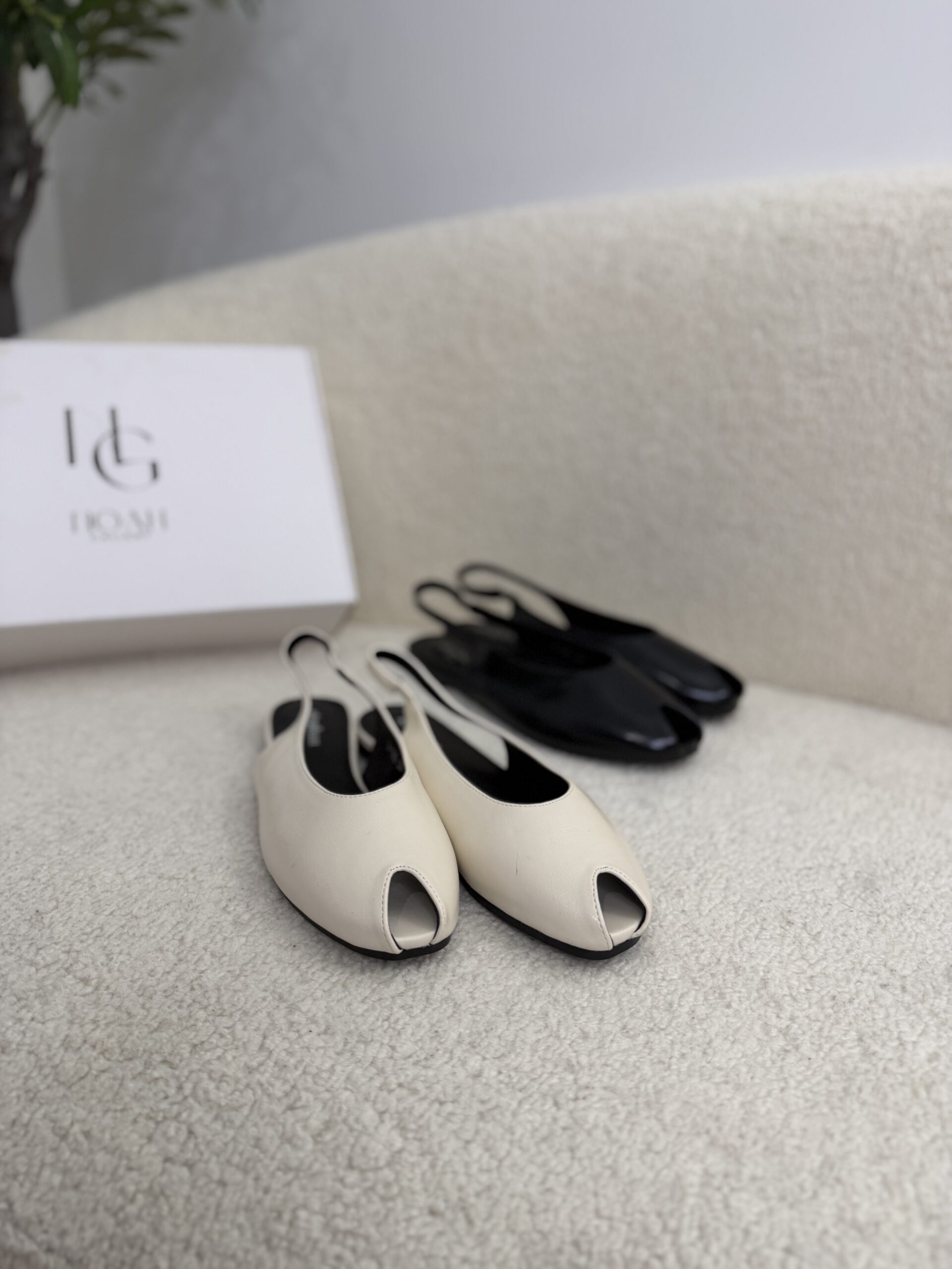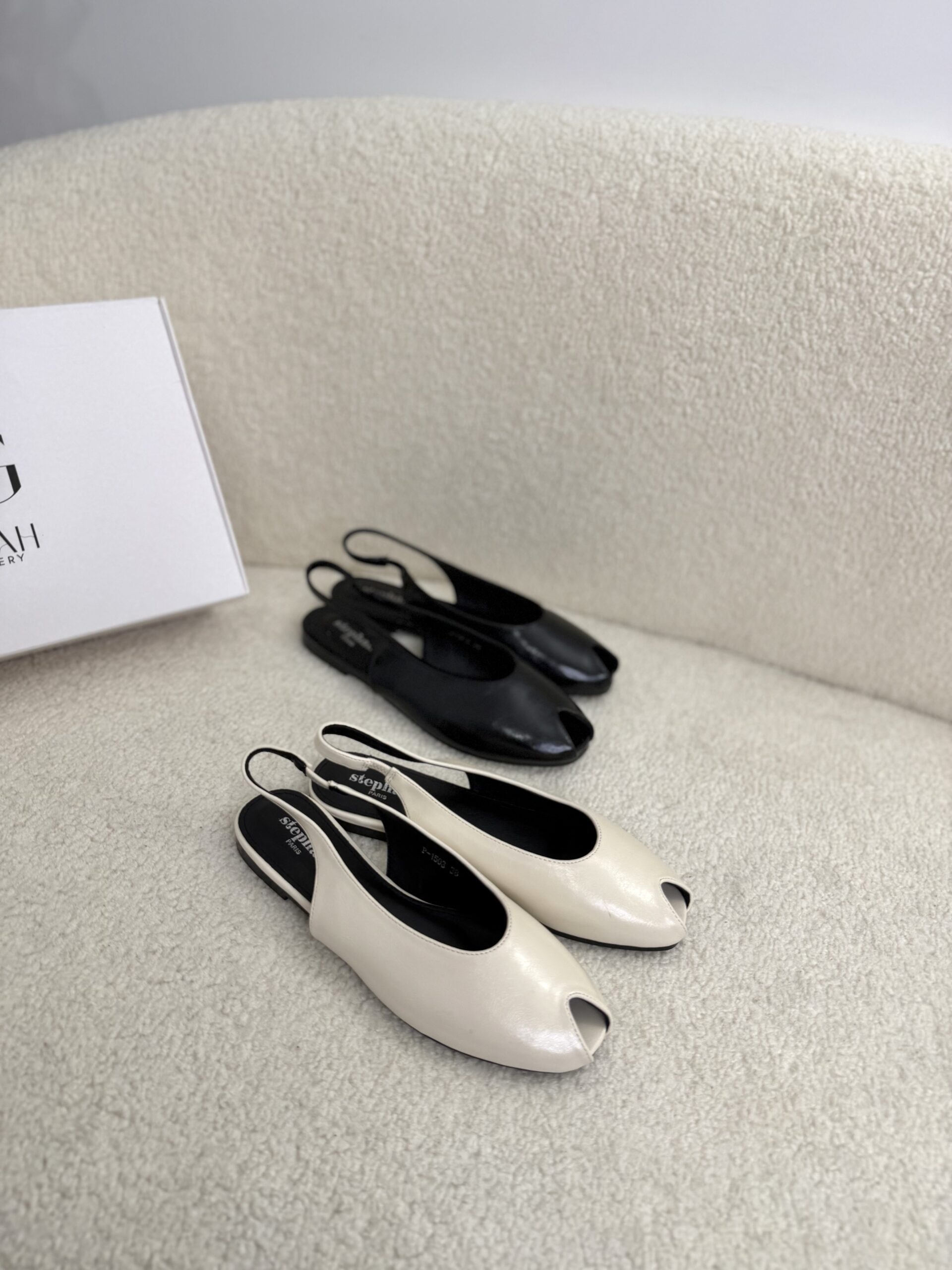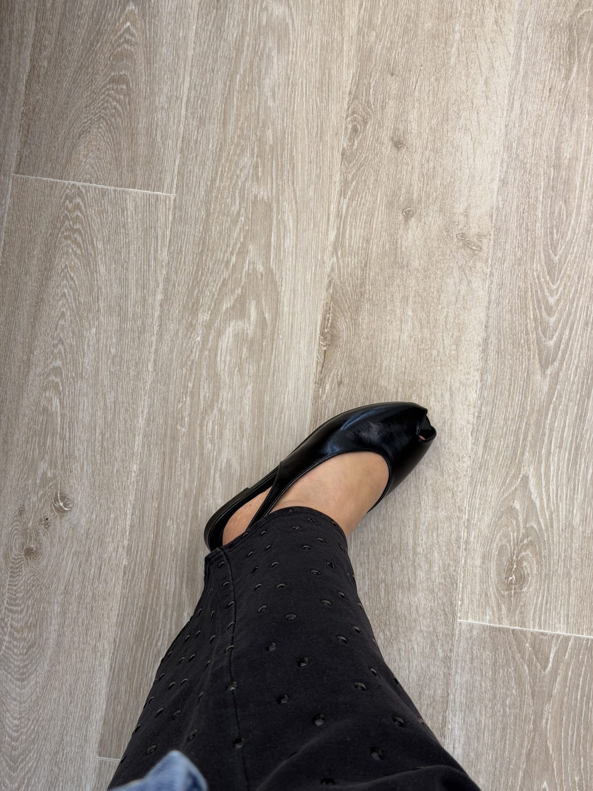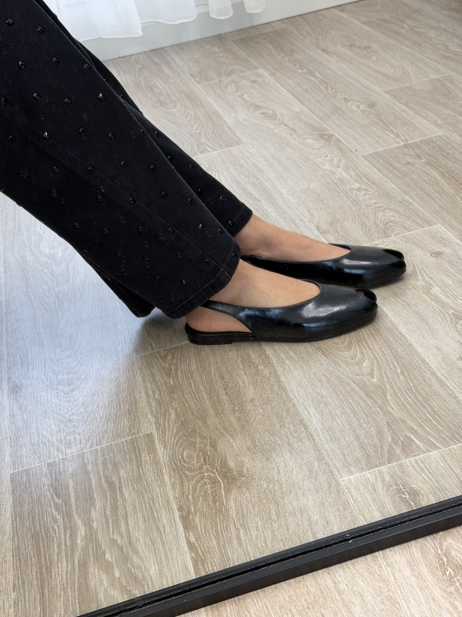 Mules plates en noir brillant au design épuré et sophistiqué. Bout légèrement ouvert pour une touche moderne, avec une finition lisse qui apporte chic et minimalisme. Confortables et faciles à porter, elles complètent parfaitement un jean à strass ou une tenue habillée pour un look raffiné et tendance.