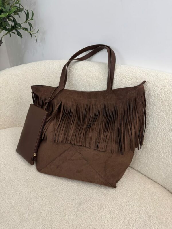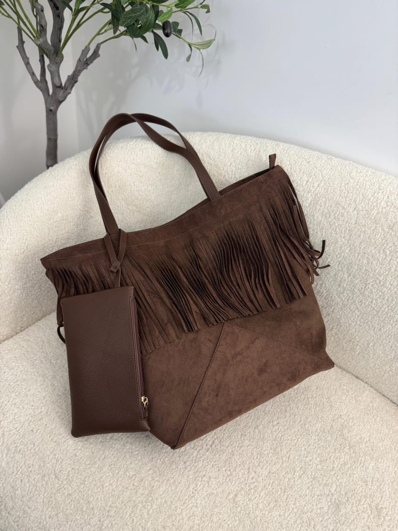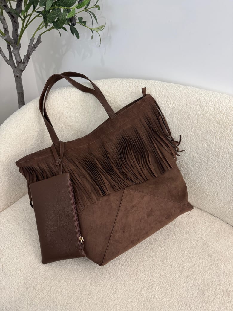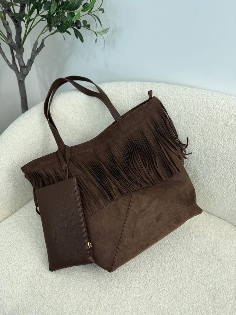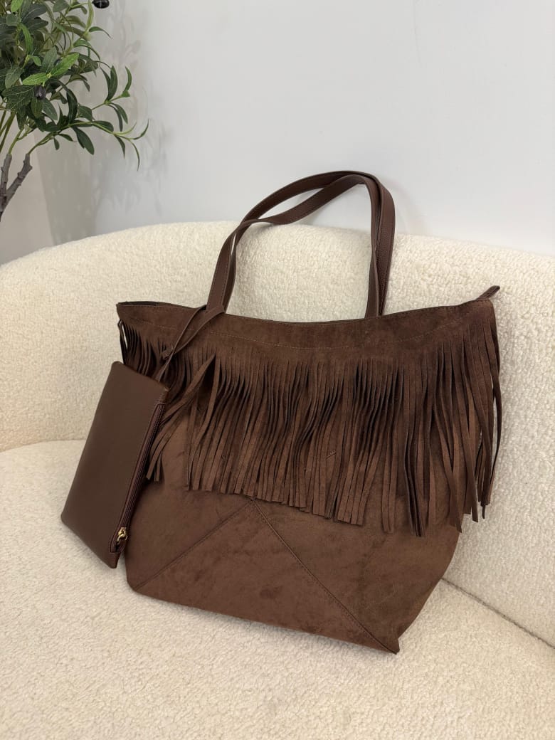 Ce sac à main élégant, dans une teinte marron chaleureuse, allie simplicité et esprit bohème moderne. Son design est sublimé par de délicates franges qui apportent du mouvement et une touche de douceur, tandis que sa matière effet velours lui confère un aspect raffiné. Pratique et chic, il s’adapte parfaitement à un usage quotidien comme aux tenues plus élégantes, ajoutant une note de caractère et de sophistication à chaque look.