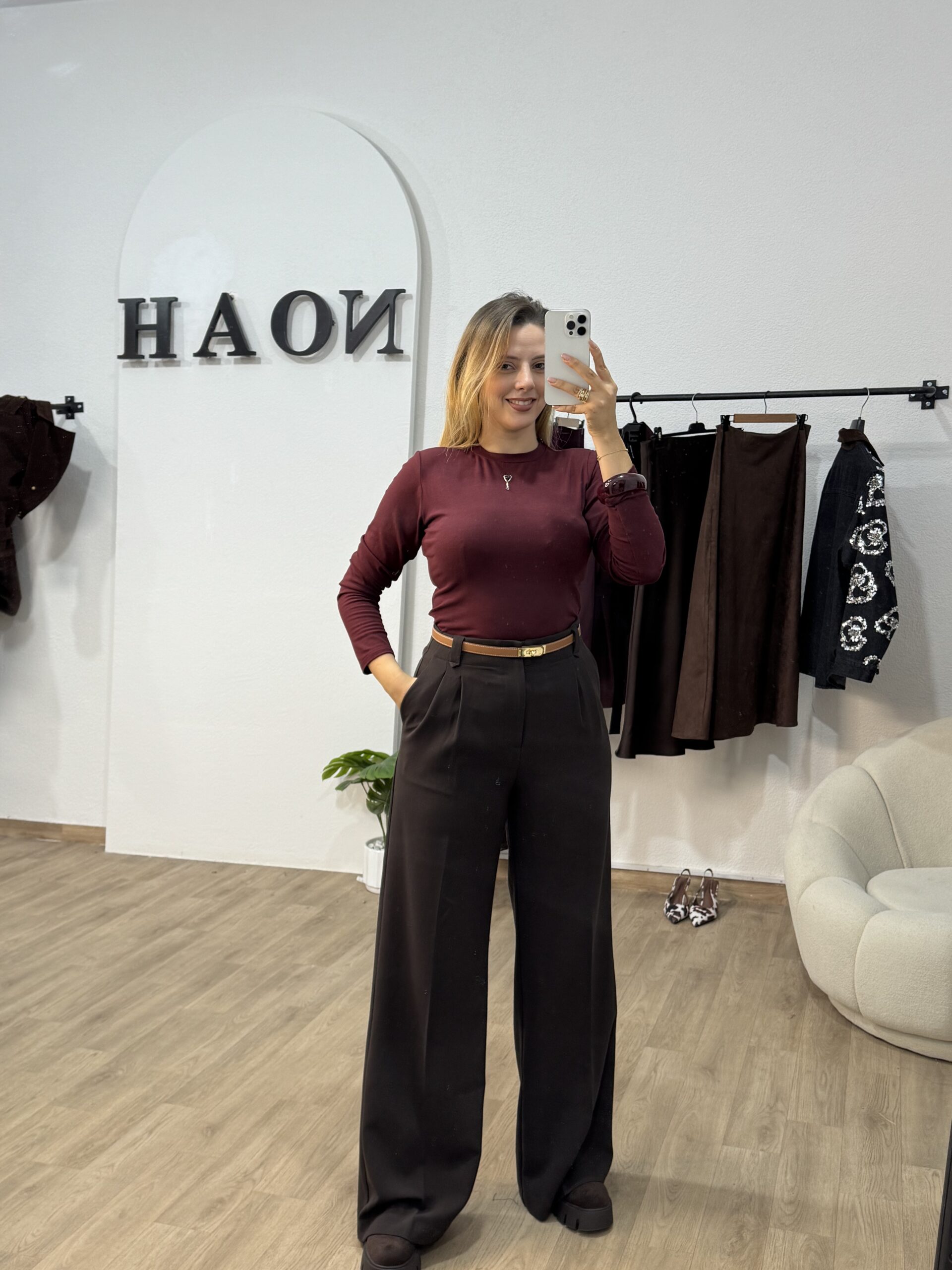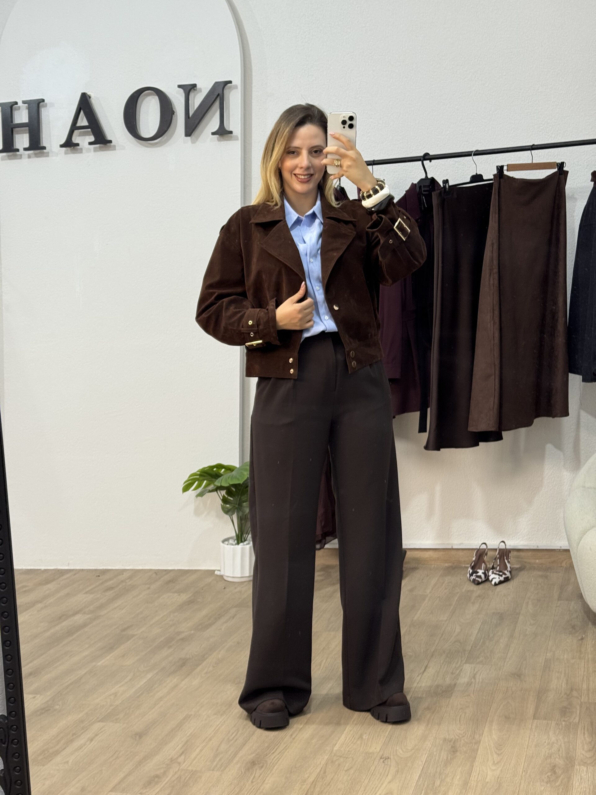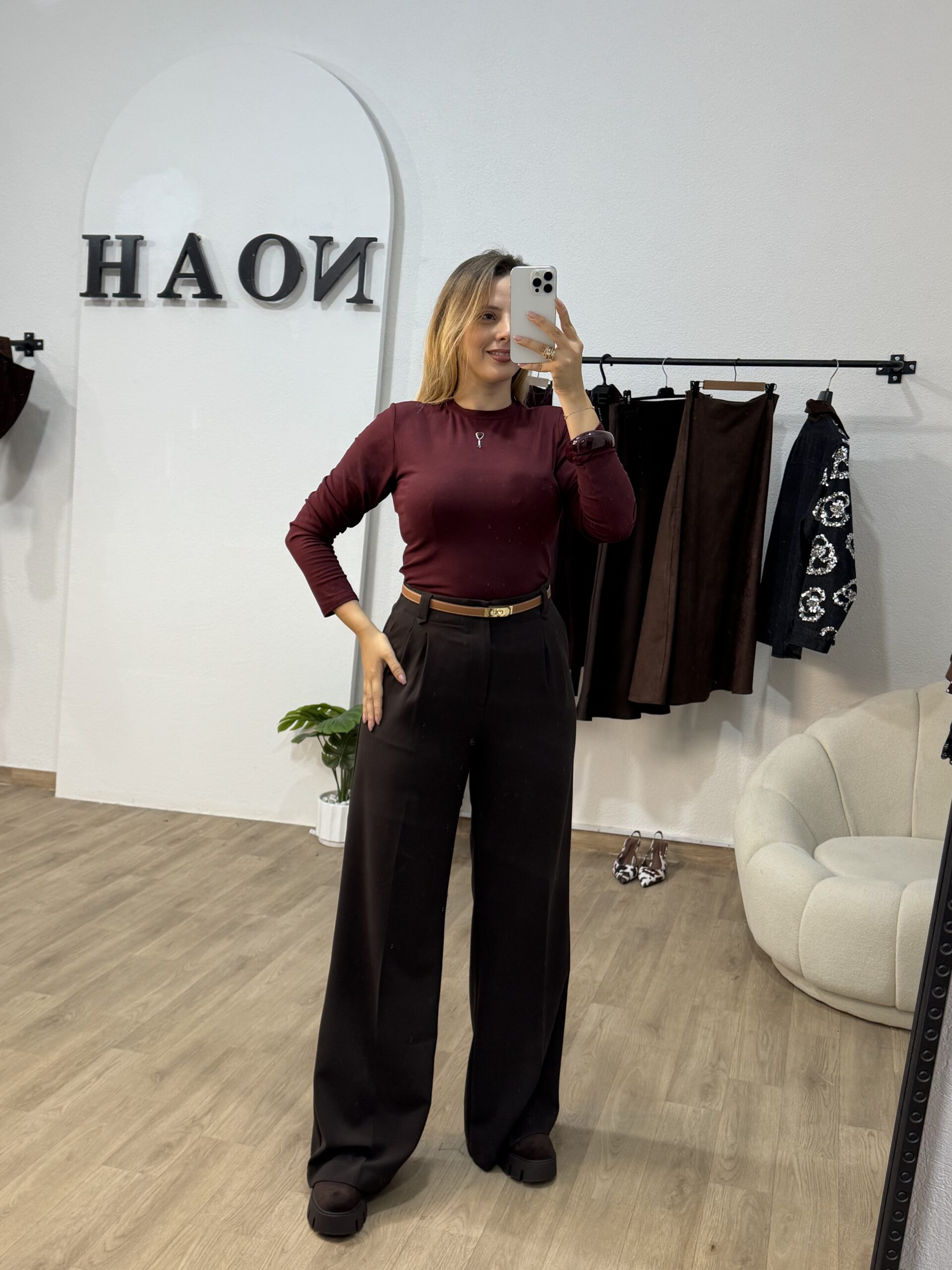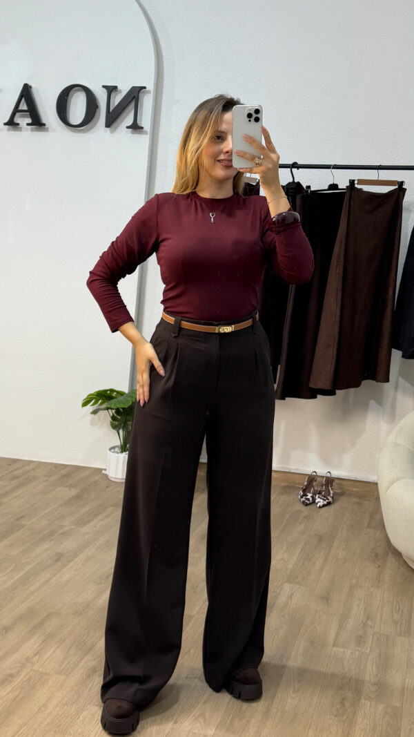 Ce pantalon tailleur à la coupe wide leg offre une silhouette élancée et élégante. Confectionné dans un tissu fluide au tombé impeccable, il présente une taille haute flatteuse ainsi que des pinces avant qui structurent la ligne. Sa teinte brun foncé lui donne un style chic et polyvalent, parfait aussi bien pour le bureau que pour des tenues casual sophistiquées.