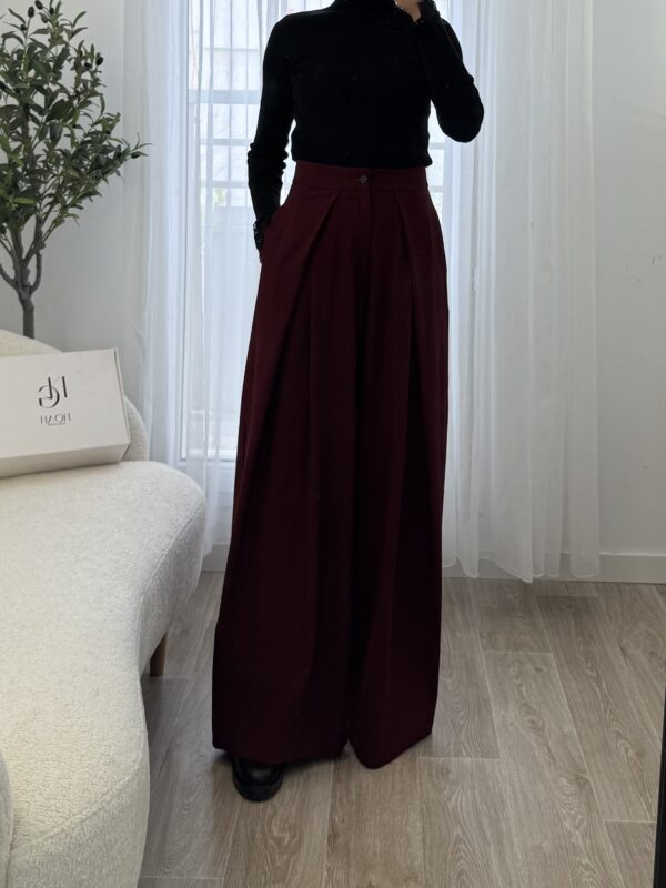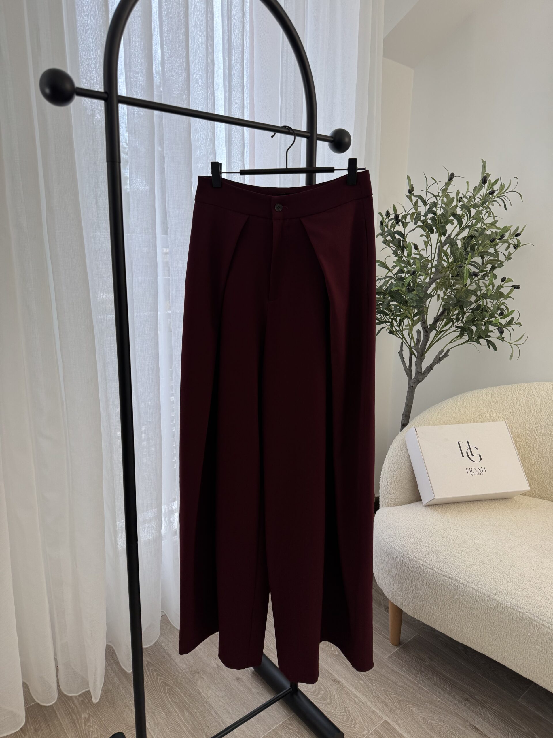 Avec sa coupe palazzo très ample, il assure un confort maximal tout en conservant un look chic et moderne. La teinte bordeaux intense ajoute une touche de caractère, parfaite pour des tenues de bureau, des looks habillés ou des ensembles minimalistes.