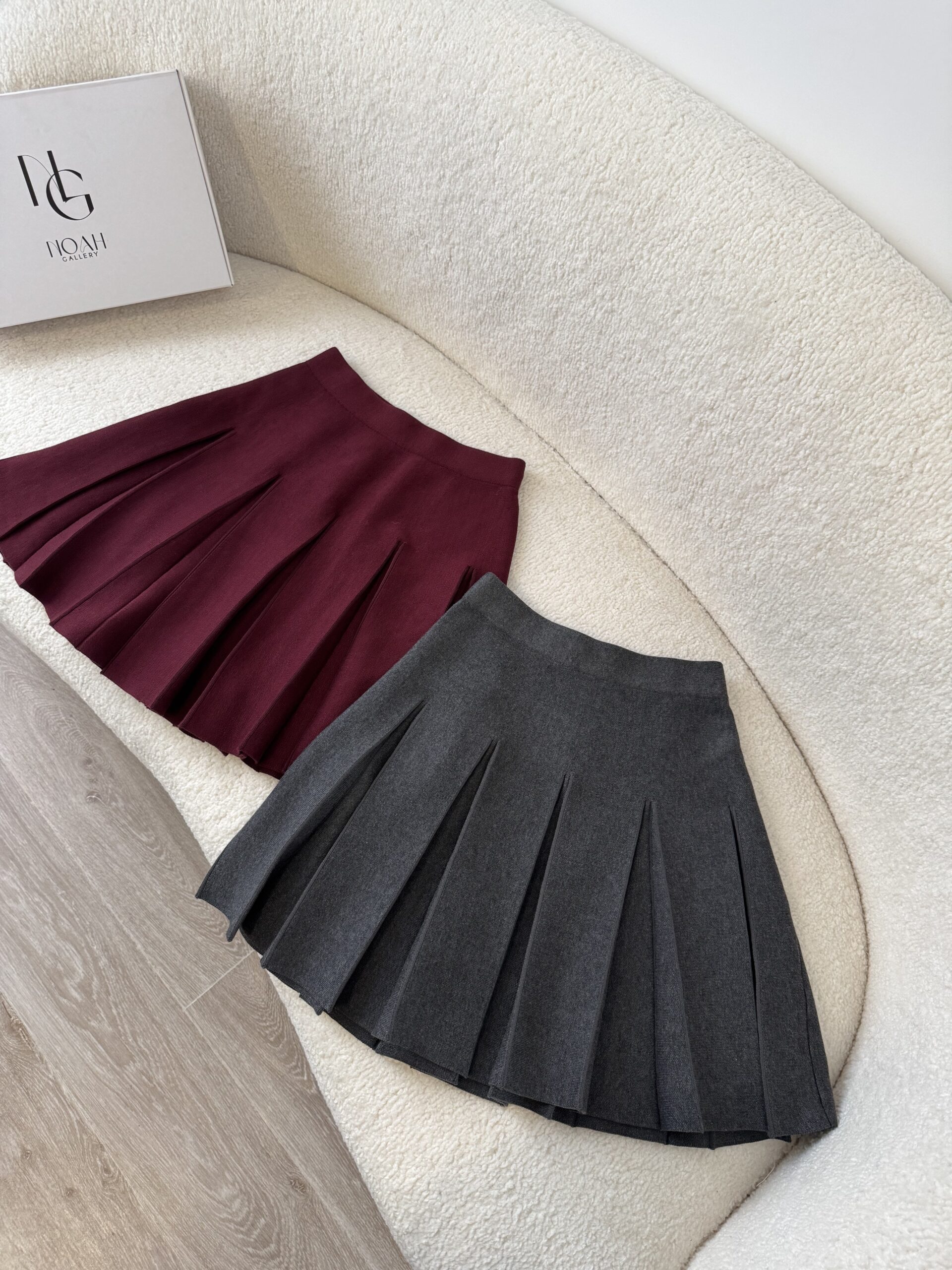 Jupe noire en laine plissée, courte et évasée, offrant un tombé structuré et élégant. Son tissu épais assure confort et chaleur, idéale pour un look chic et raffiné.