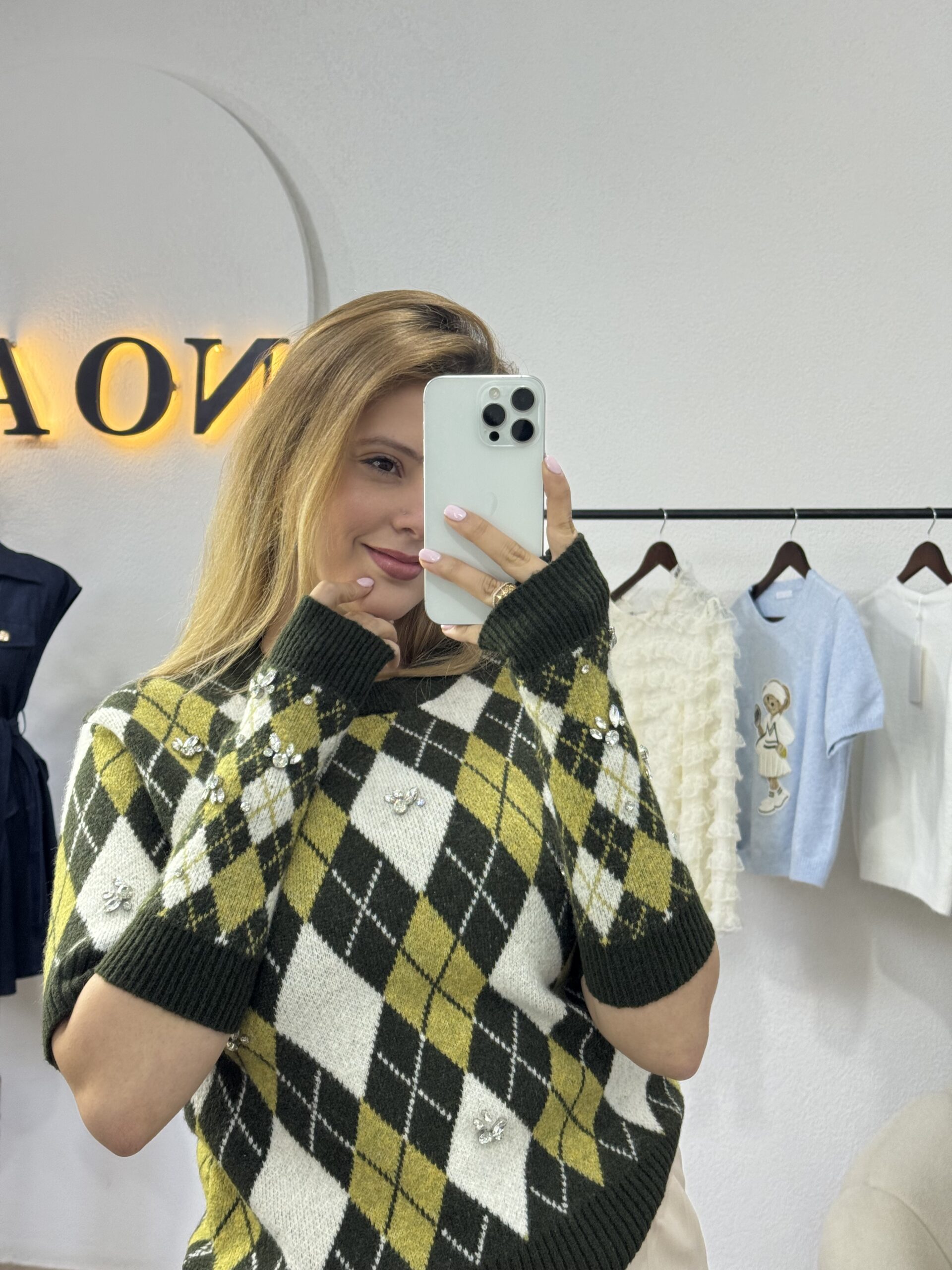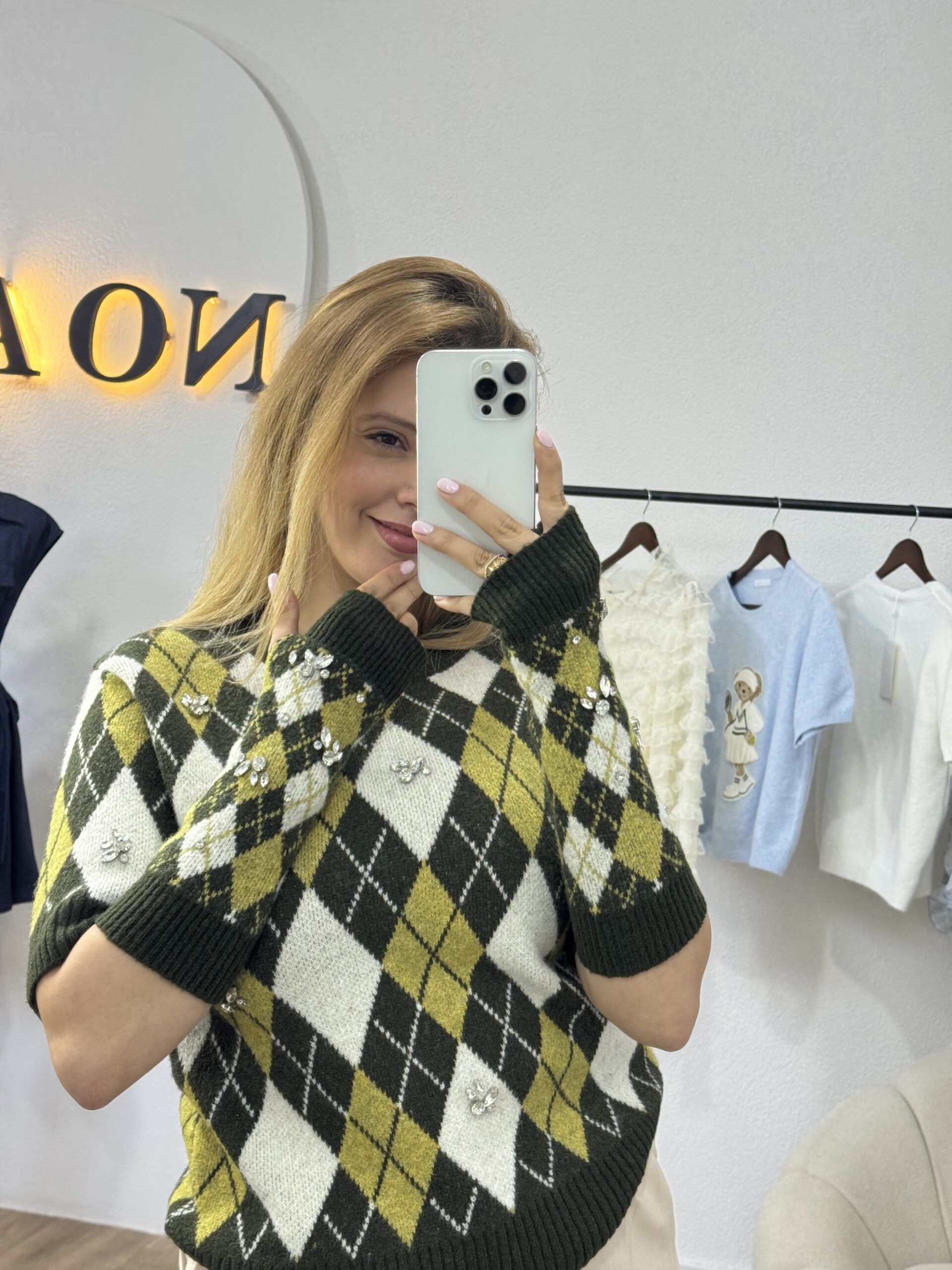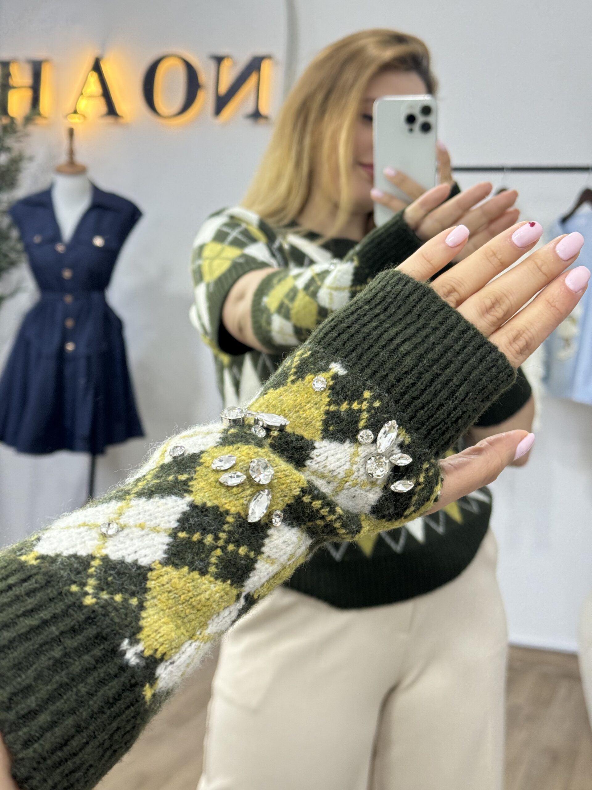 Ce pull en maille se distingue par son motif losange intemporel, revisité dans une palette de couleurs élégante et harmonieuse. Sa coupe soignée et sa matière douce assurent un confort optimal tout en apportant une touche de sophistication au look. Les mitaines assorties, avec le pull, ajoutent une note originale et pratique, renforçant son style chic et tendance. Idéal pour les journées fraîches, ce pull est parfait pour celles qui recherchent une pièce à la fois chaleureuse, moderne et raffinée.