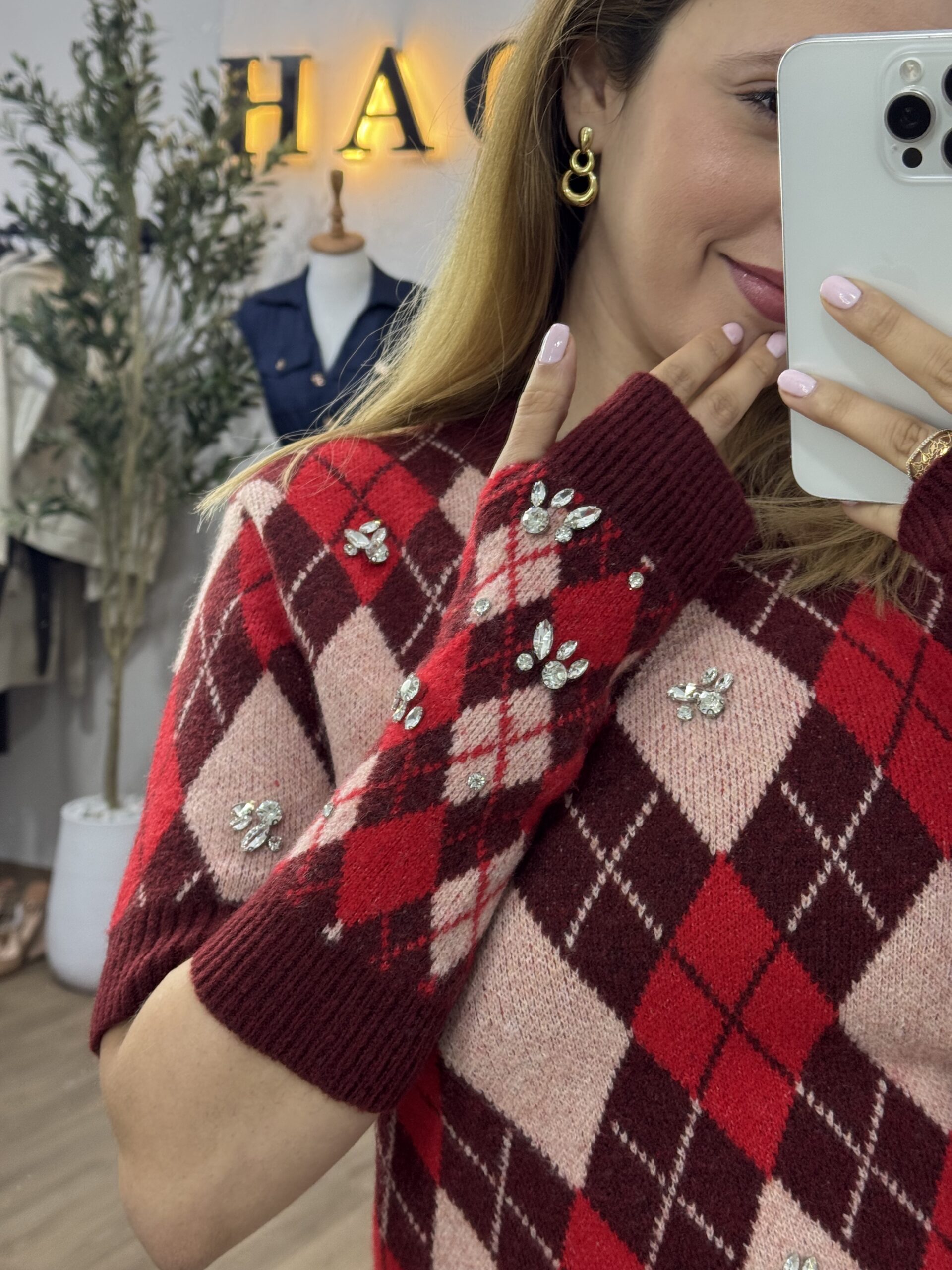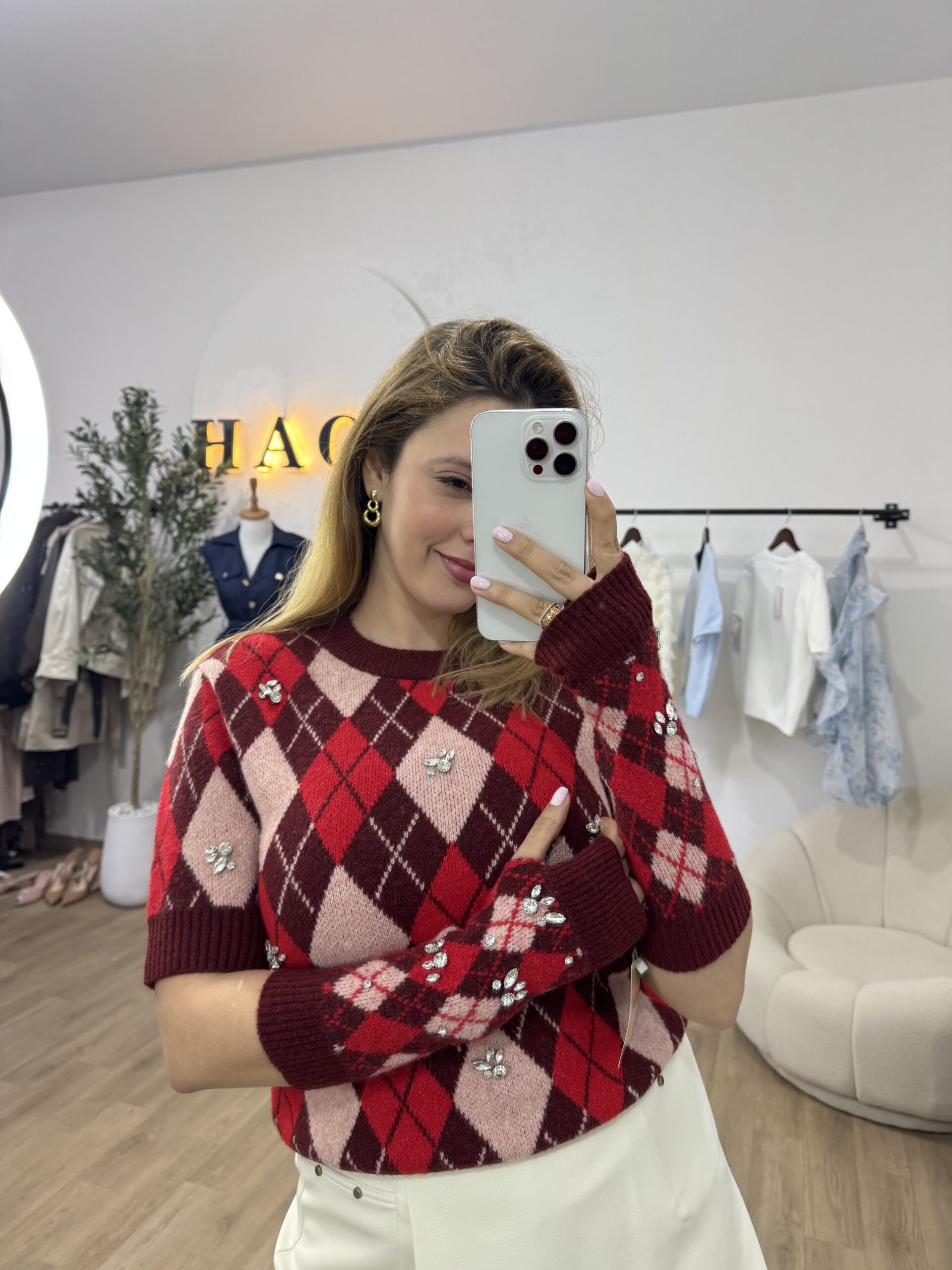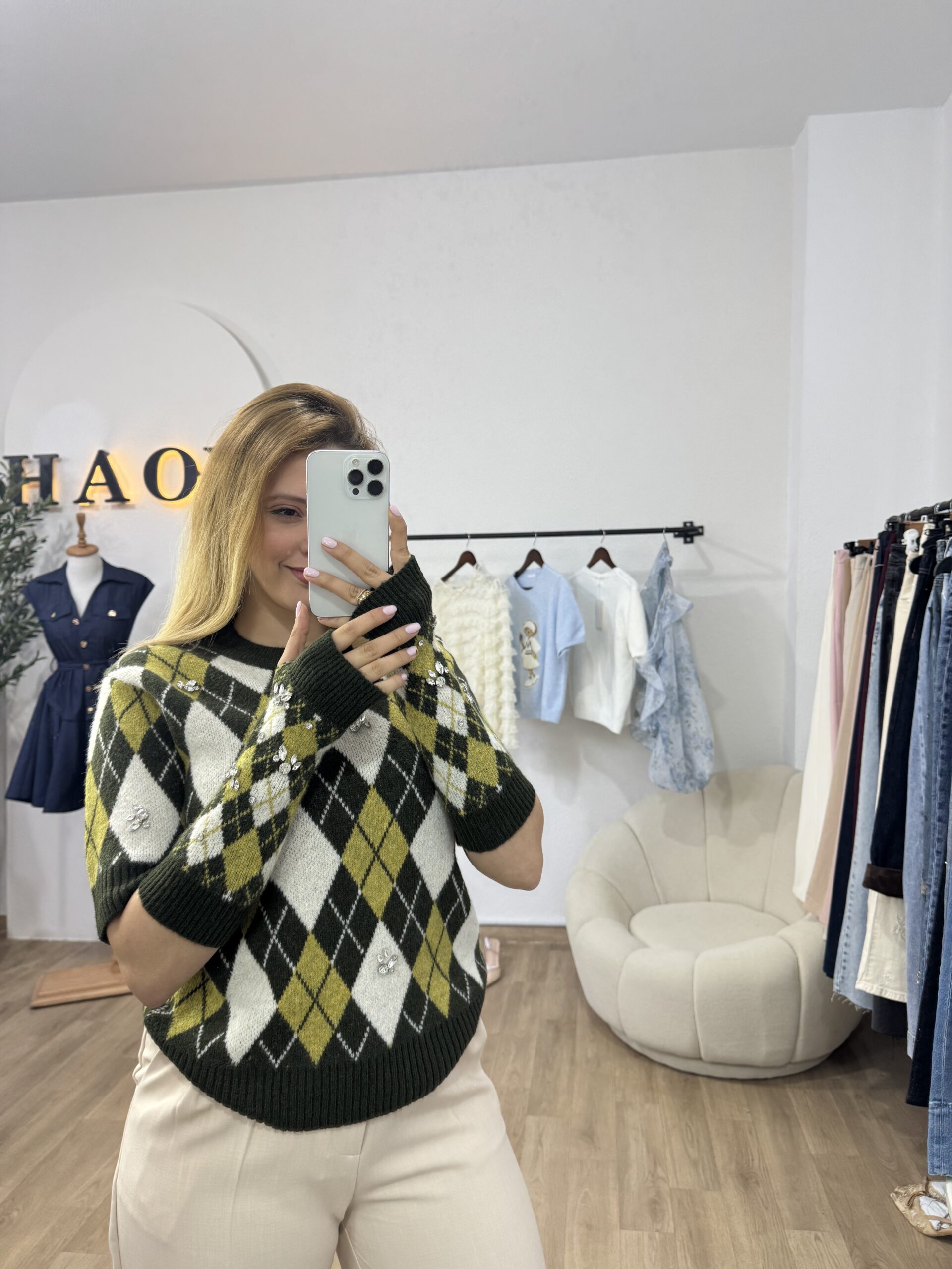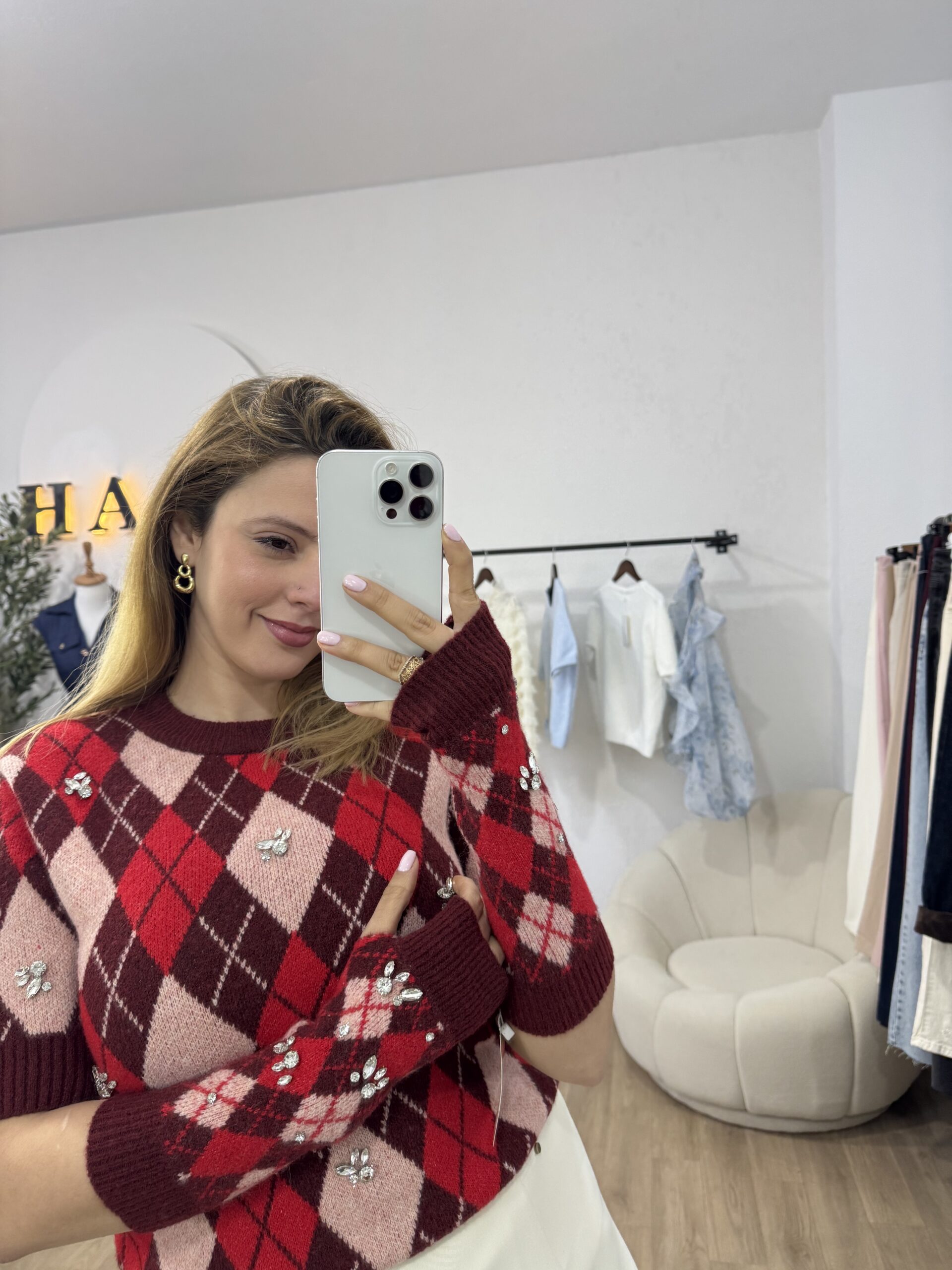 Ce pull en maille se distingue par son motif losange intemporel, revisité dans une palette de couleurs élégante et harmonieuse. Sa coupe soignée et sa matière douce assurent un confort optimal tout en apportant une touche de sophistication au look. Les mitaines assorties, avec le pull, ajoutent une note originale et pratique, renforçant son style chic et tendance. Idéal pour les journées fraîches, ce pull est parfait pour celles qui recherchent une pièce à la fois chaleureuse, moderne et raffinée.