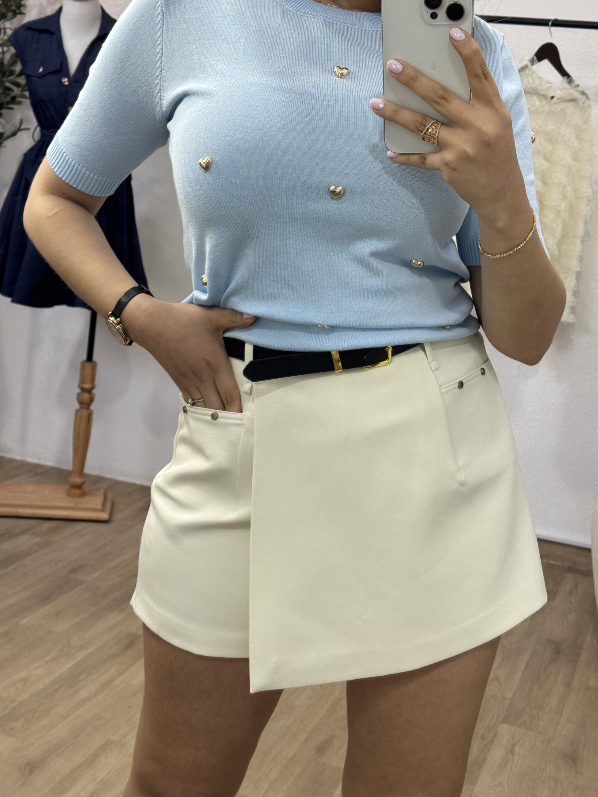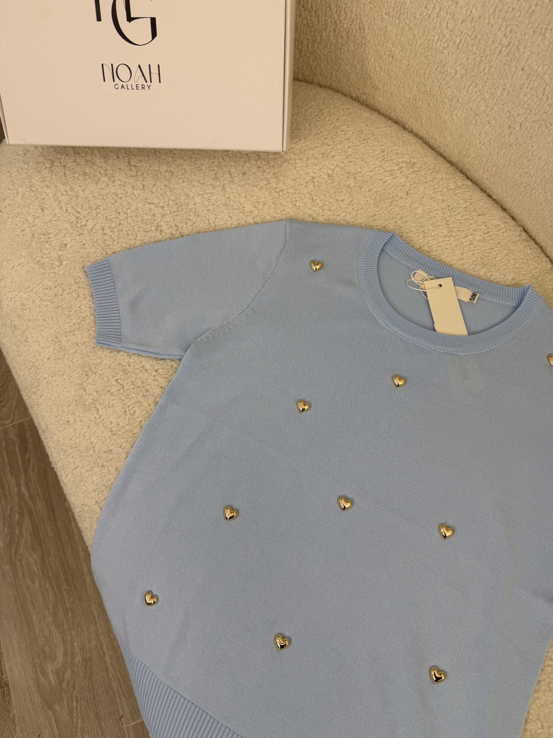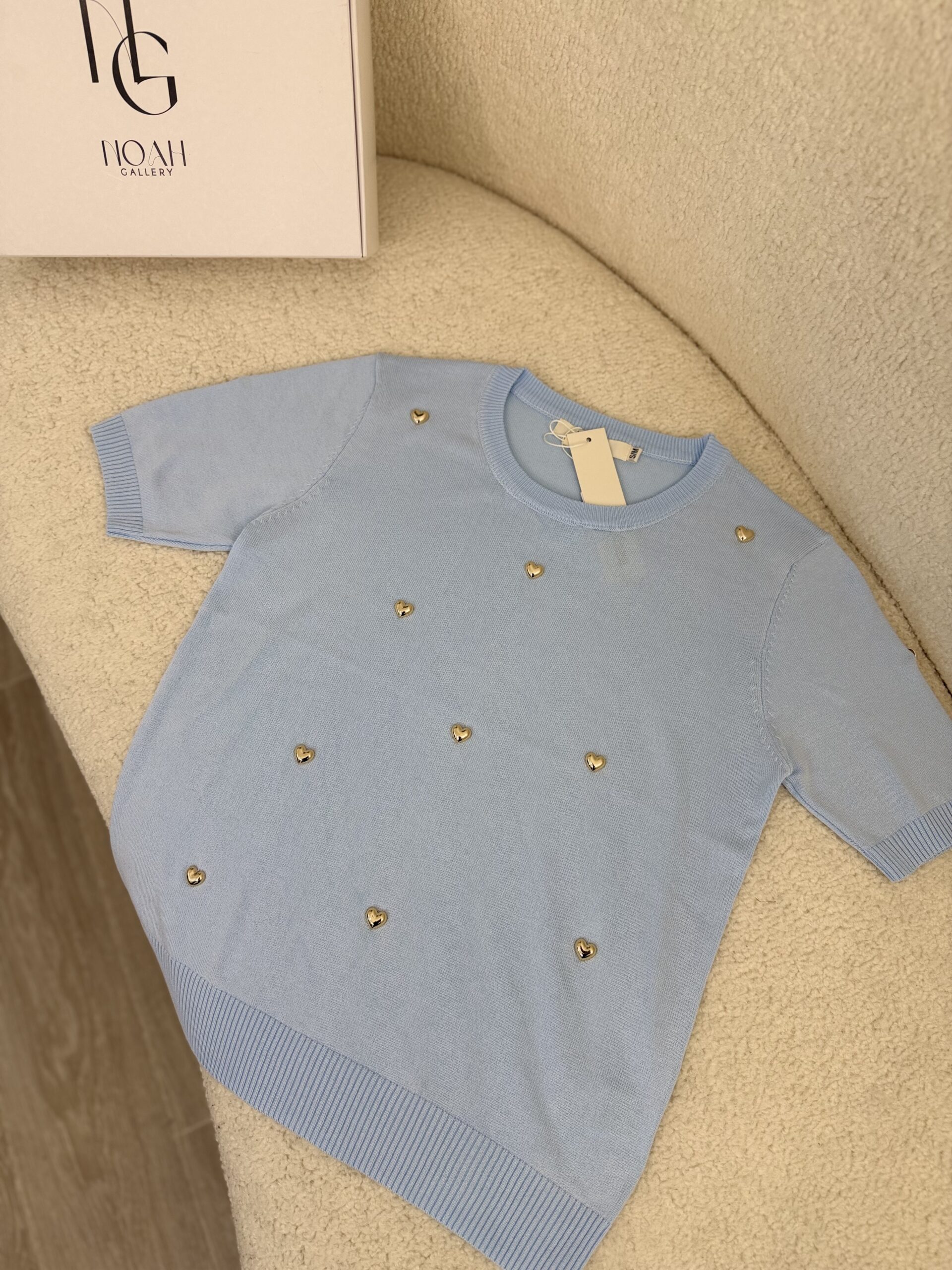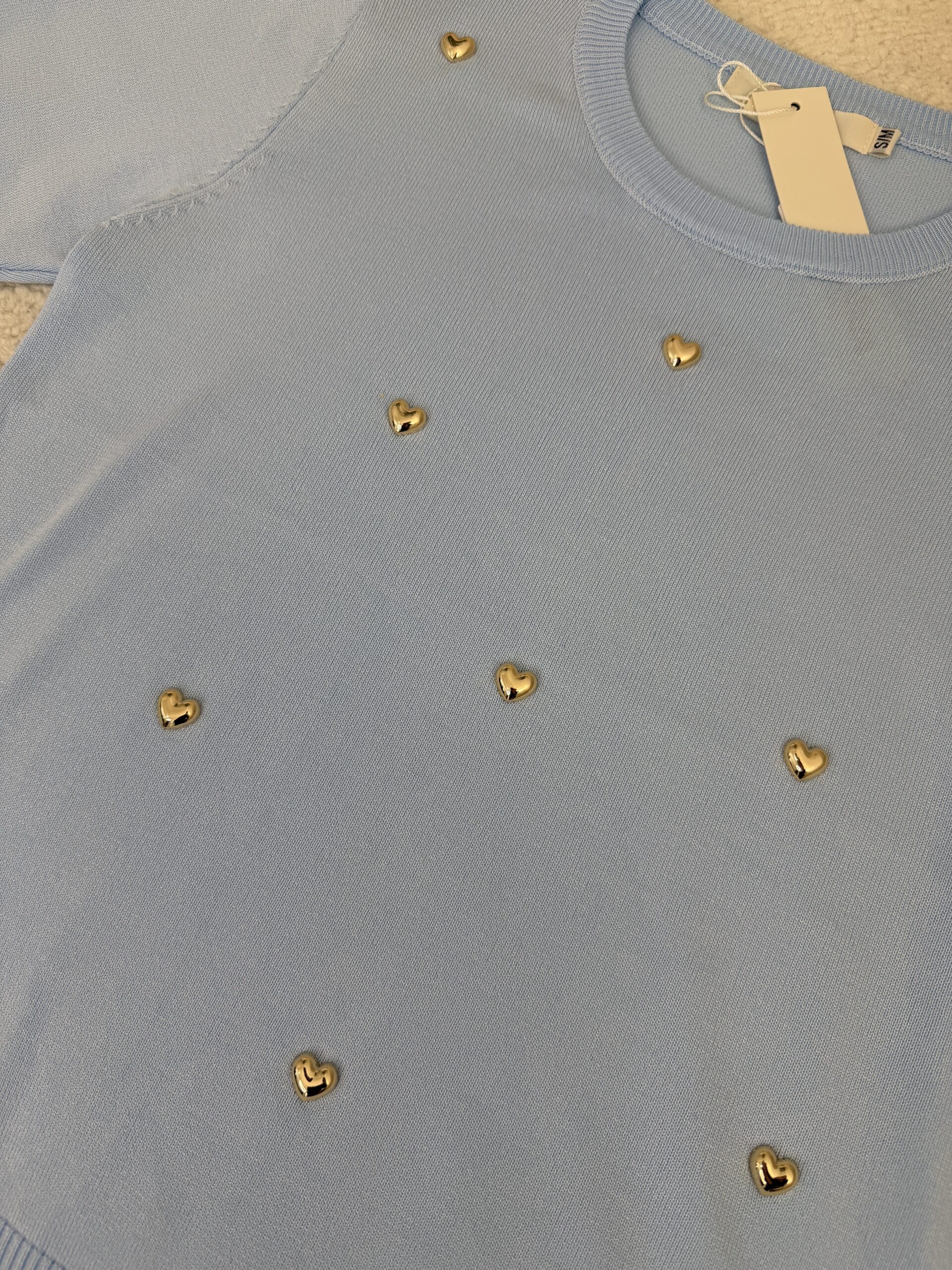 Son coloris bleu pastel délicat est sublimé par de petits cœurs dorés appliqués qui ajoutent une note chic et originale. Avec ses manches courtes et sa coupe légèrement ajustée, ce pull est parfait à porter avec un jean, un pantalon habillé ou une jupe pour un look à la fois simple et raffiné.