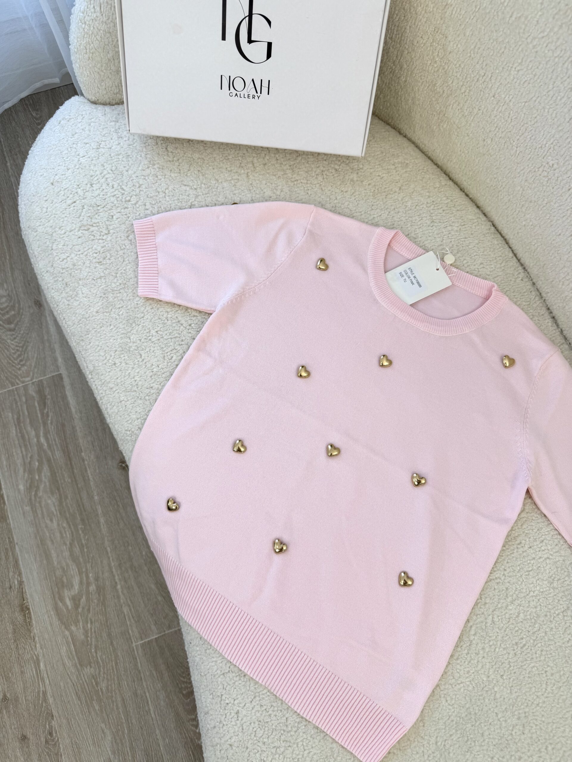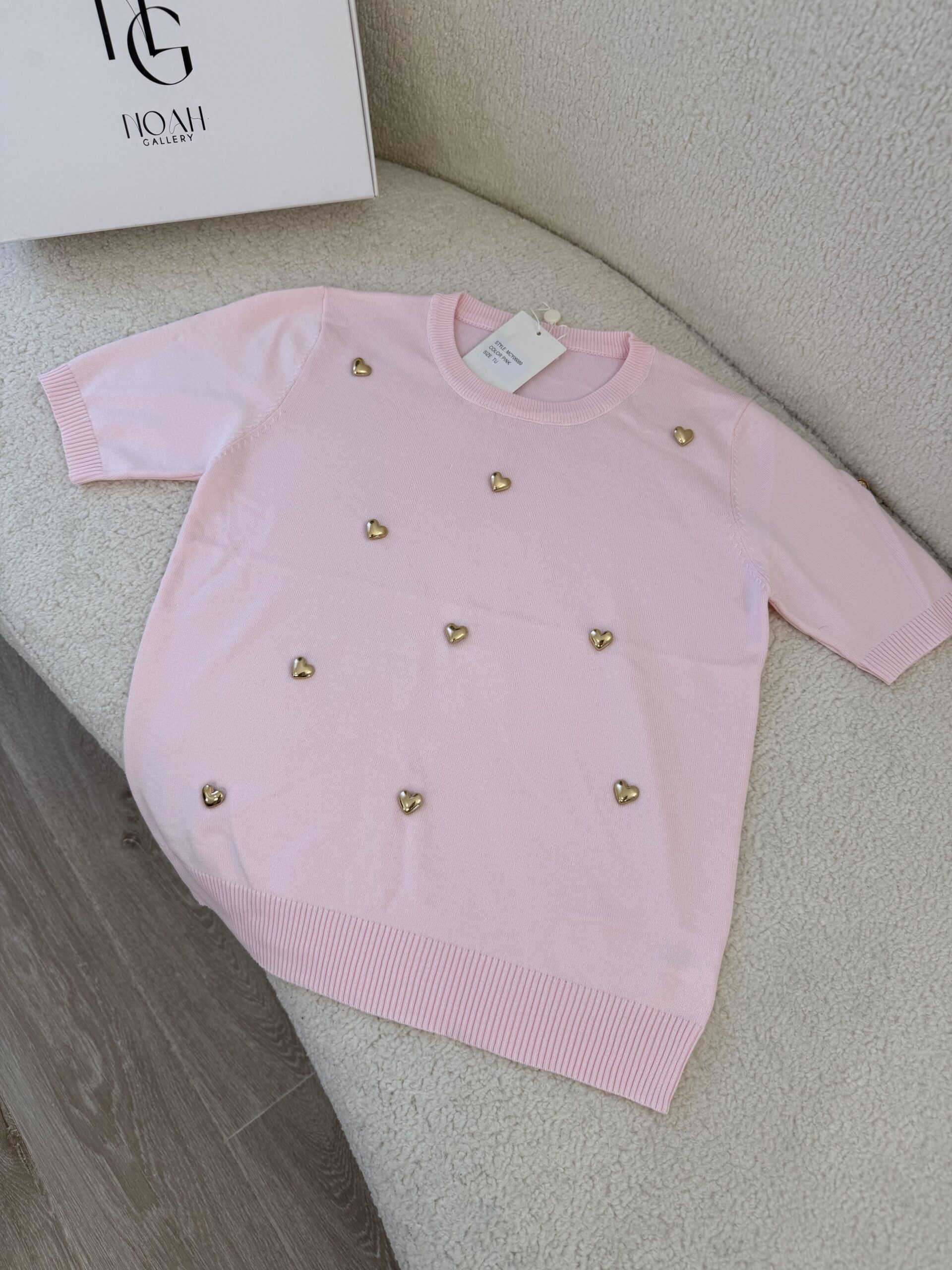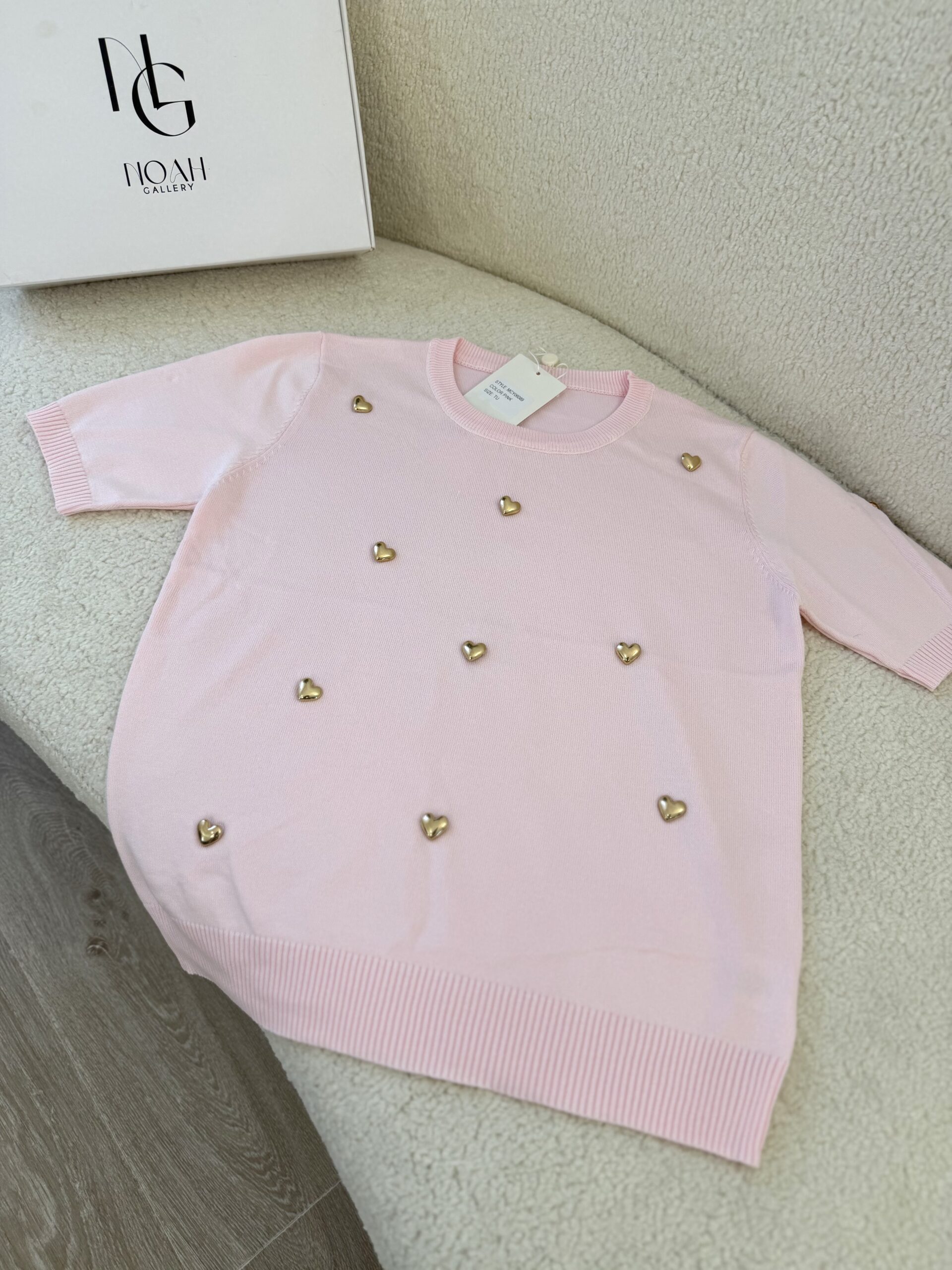 Pull demi-manches en viscose douce, délicatement orné de cœurs dorés qui apportent une touche lumineuse et féminine. Léger et agréable à porter, il se distingue par son style chic et tendance, idéal pour sublimer les looks du quotidien comme les tenues plus habillées.