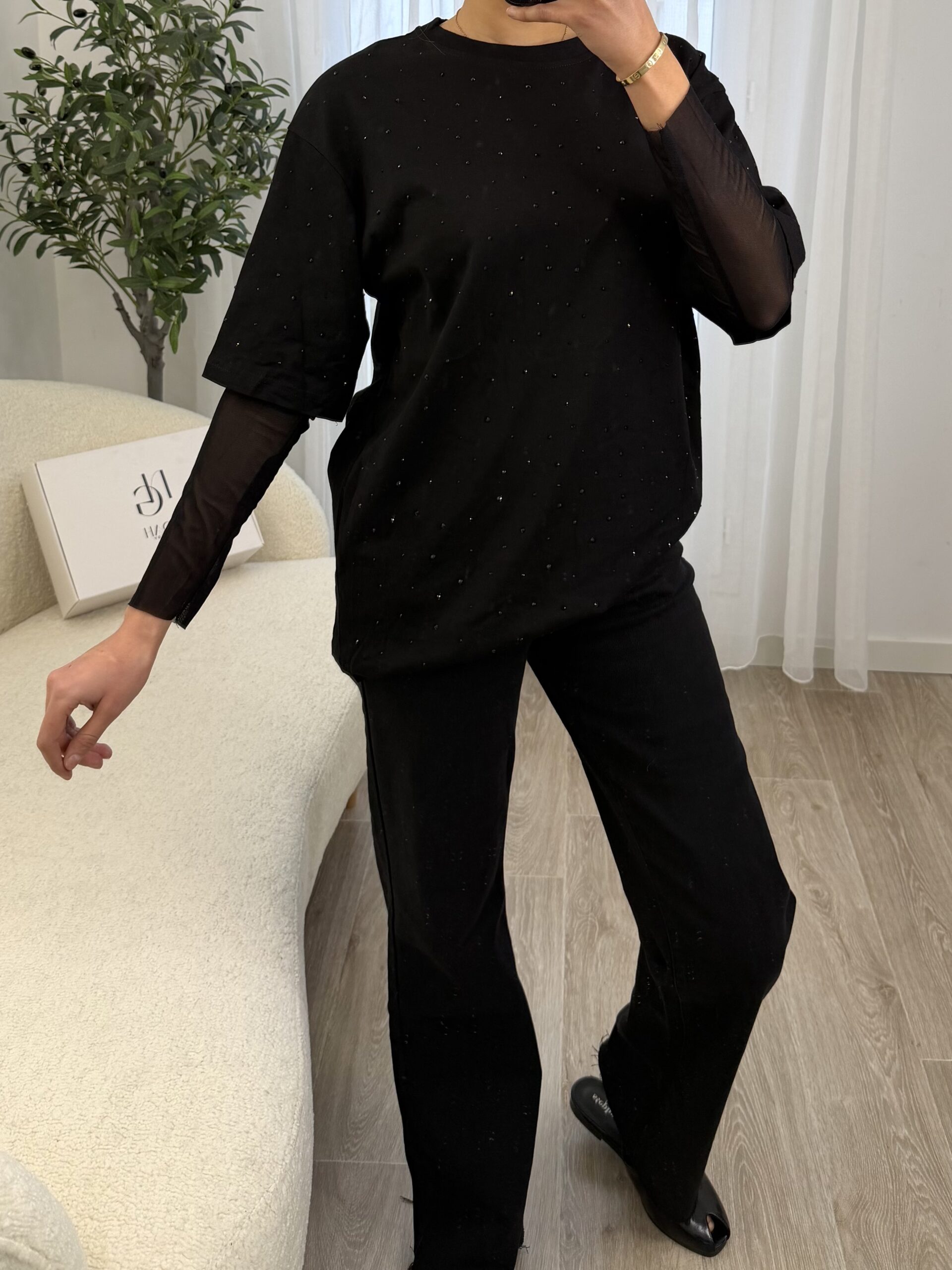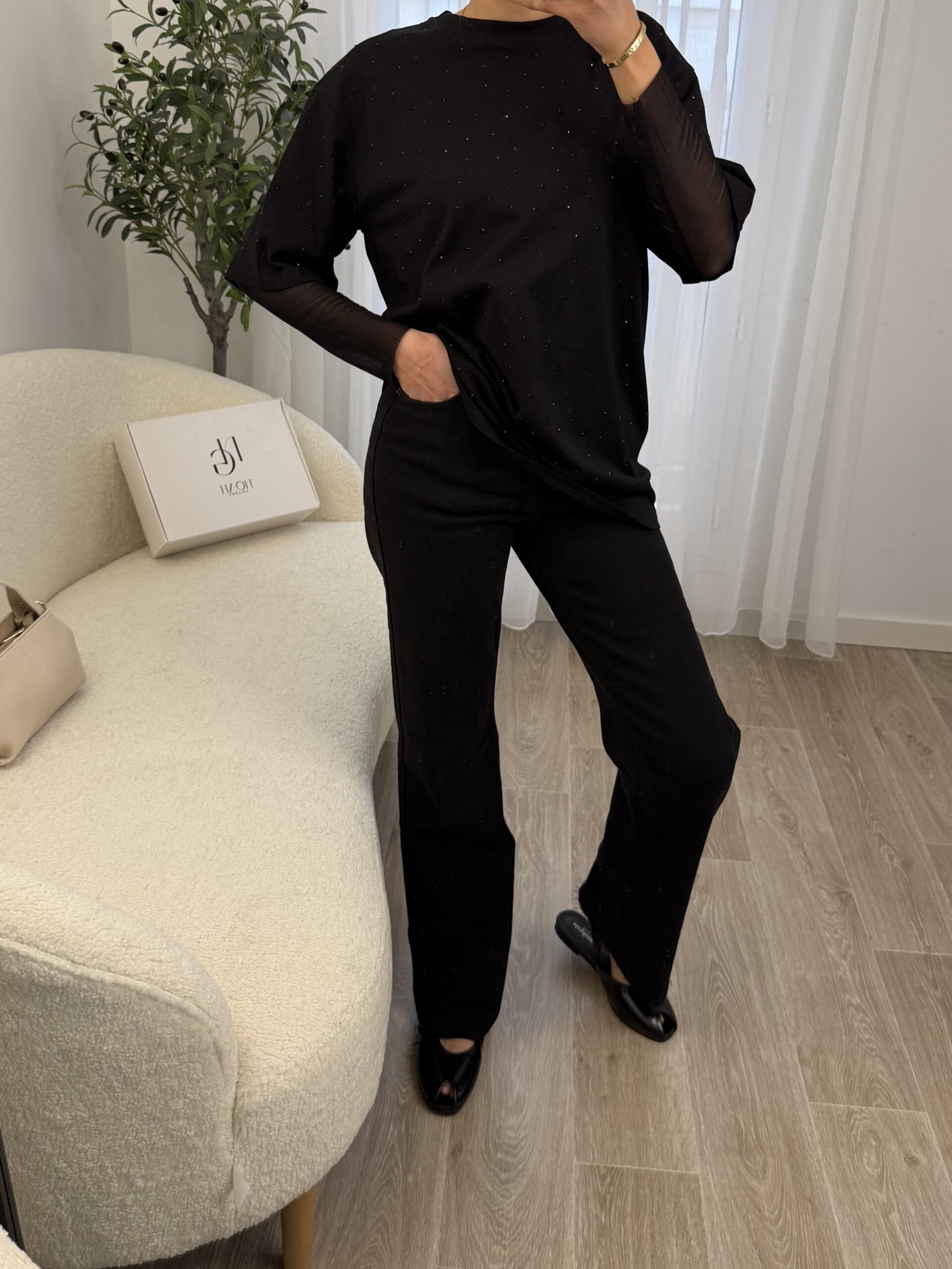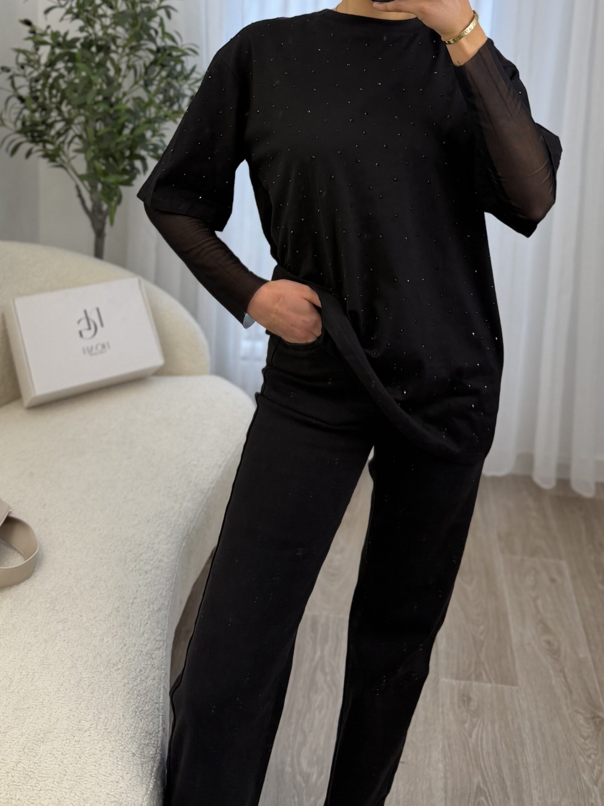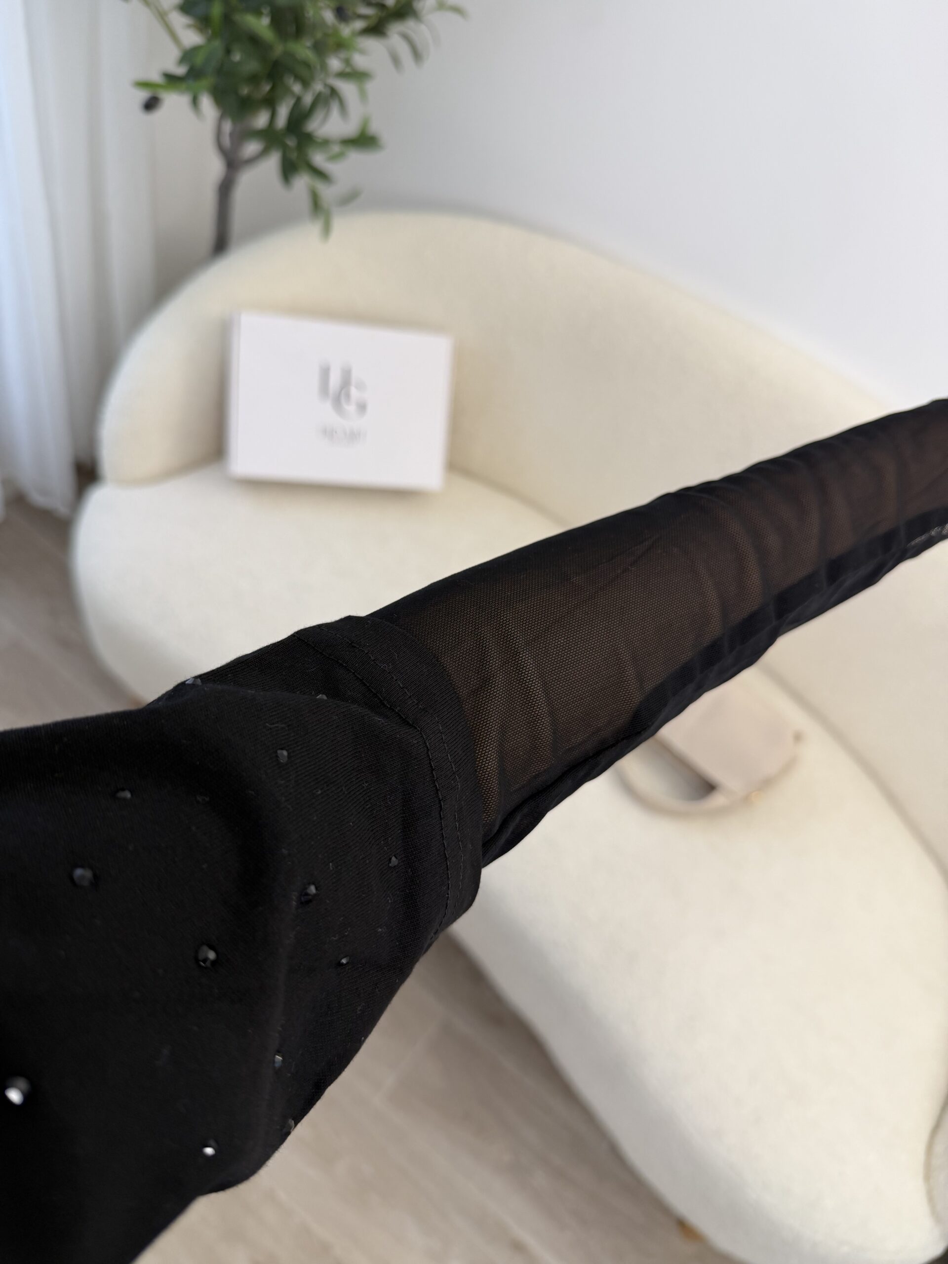 Son jeu de superposition apporte une touche moderne, tandis que les manches intégrées en mousseline ajoutent délicatesse et féminité à la silhouette. Les détails brillants subtilement répartis sur l’ensemble illuminent la tenue avec élégance.