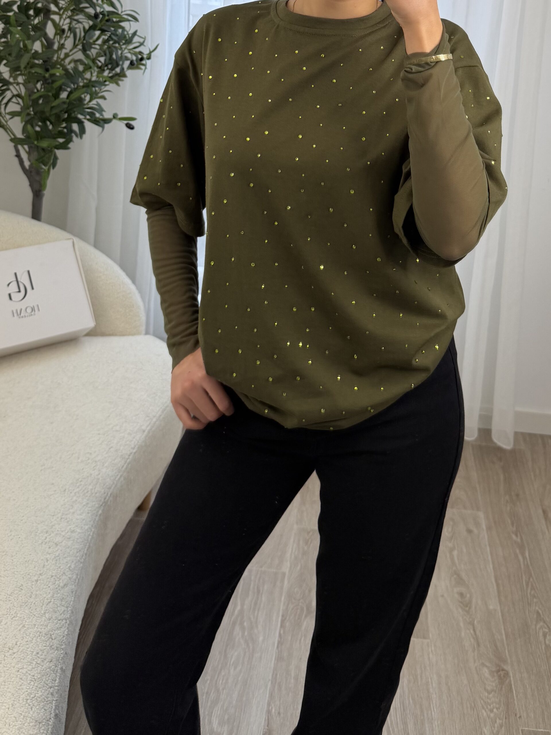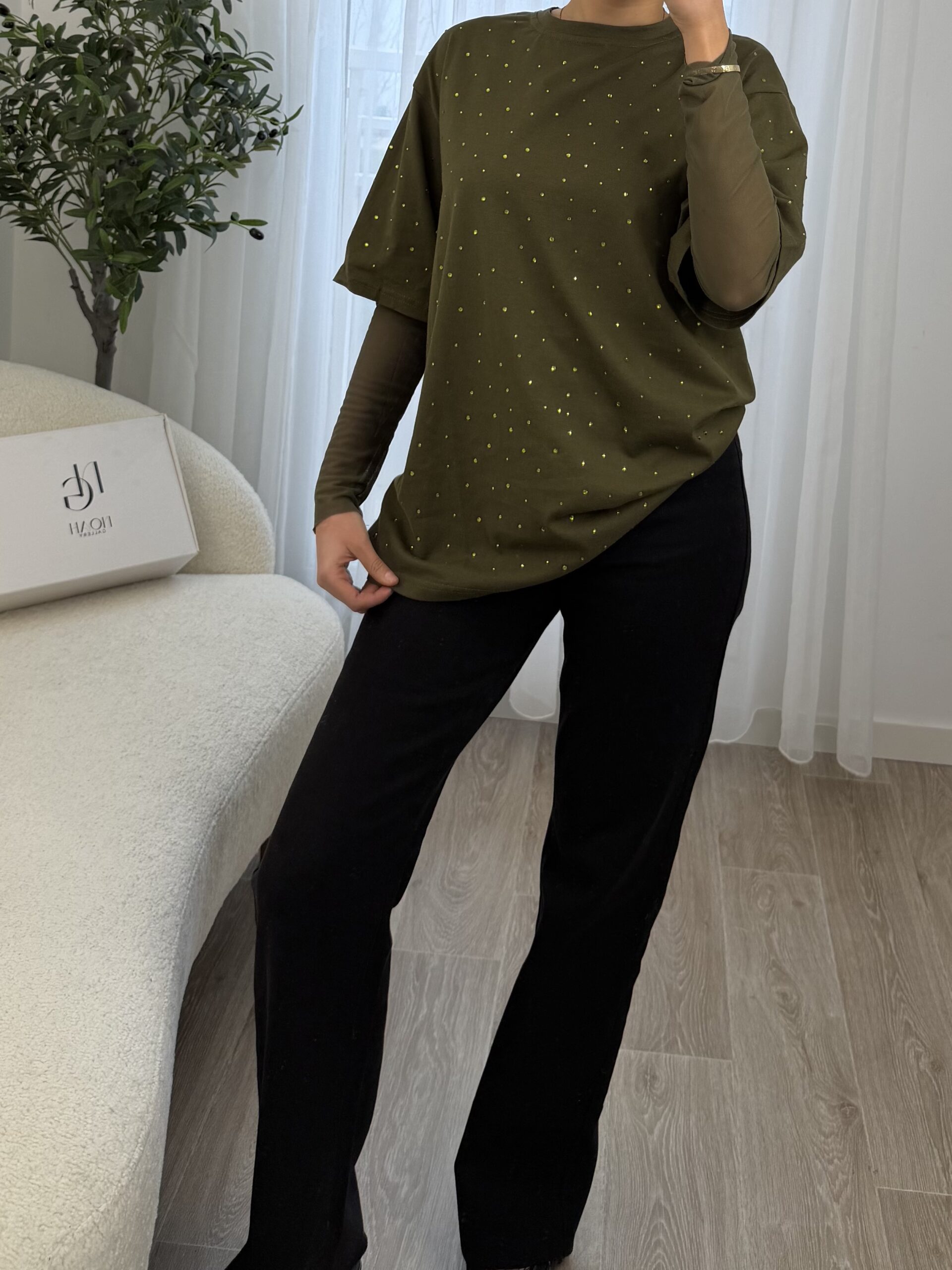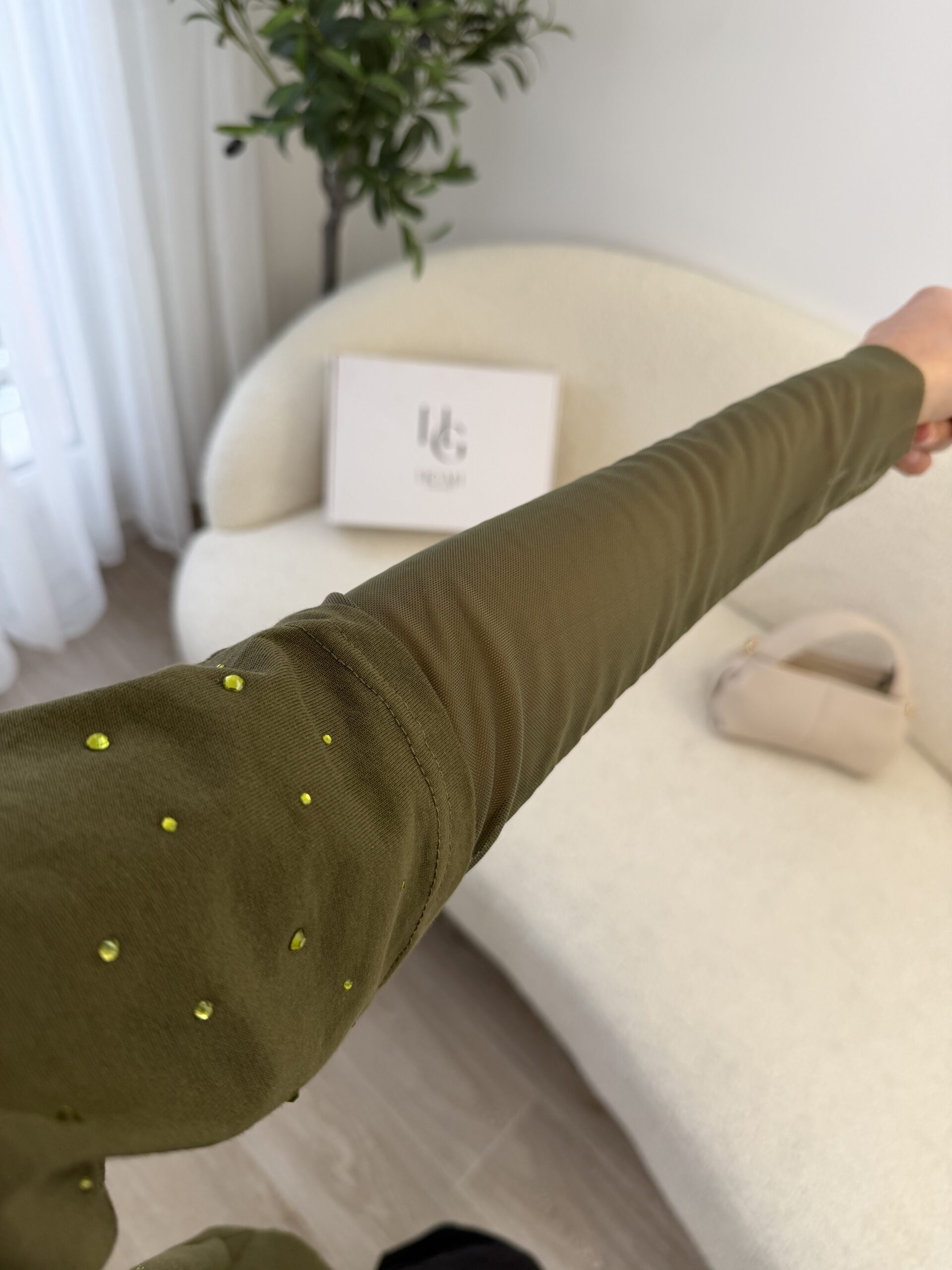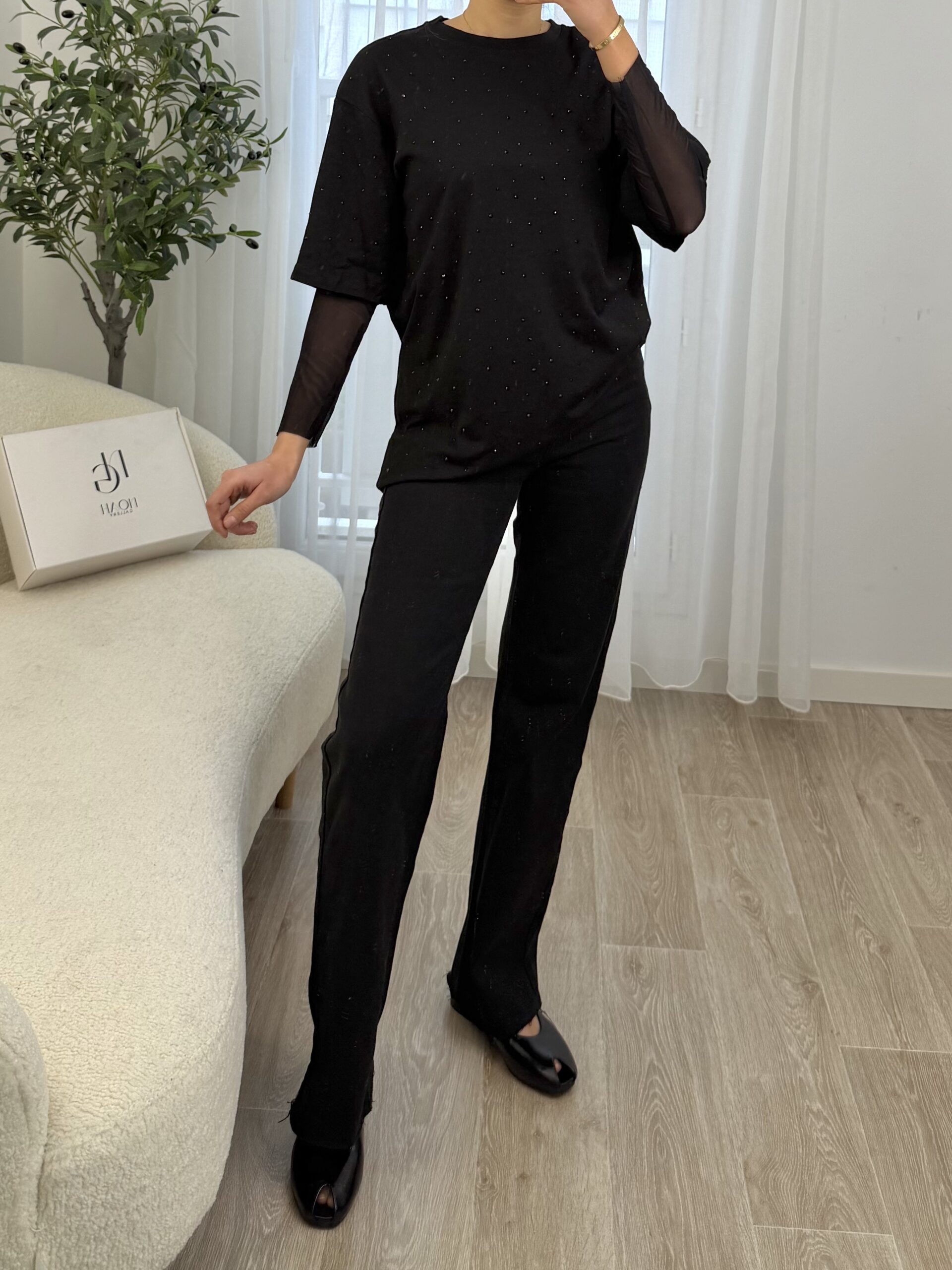 Son jeu de superposition apporte une touche moderne, tandis que les manches intégrées en mousseline ajoutent délicatesse et féminité à la silhouette. Les détails brillants subtilement répartis sur l’ensemble illuminent la tenue avec élégance.