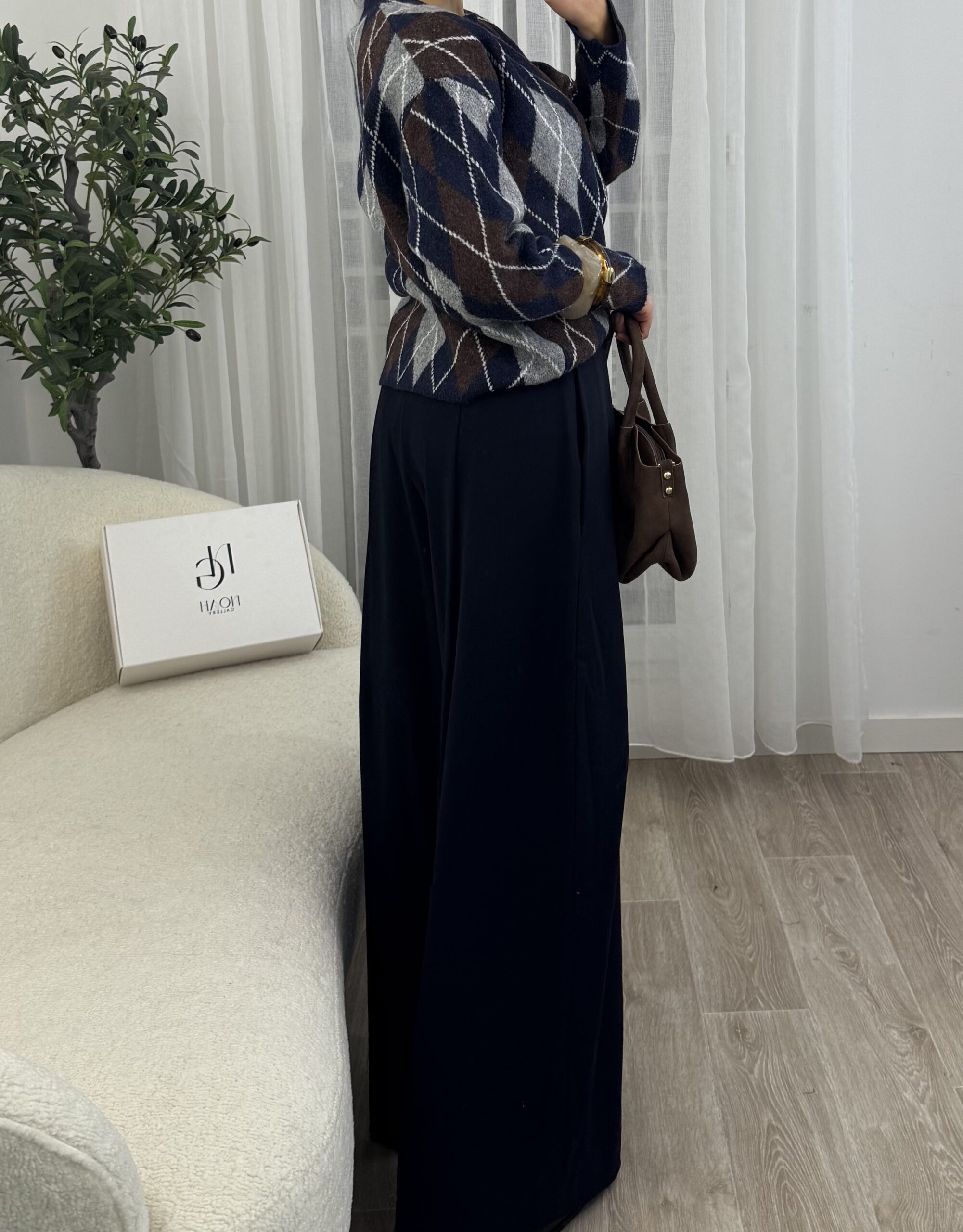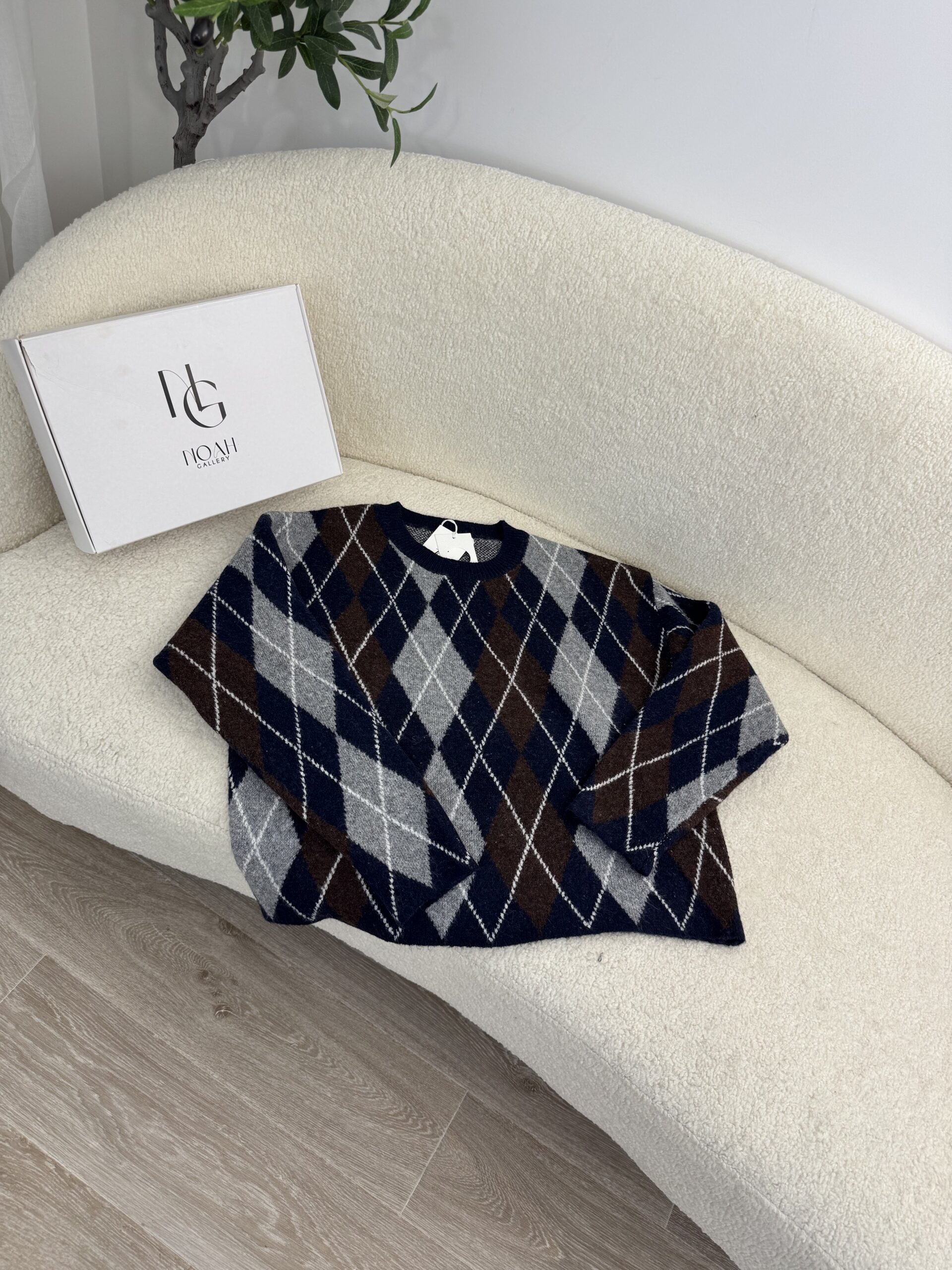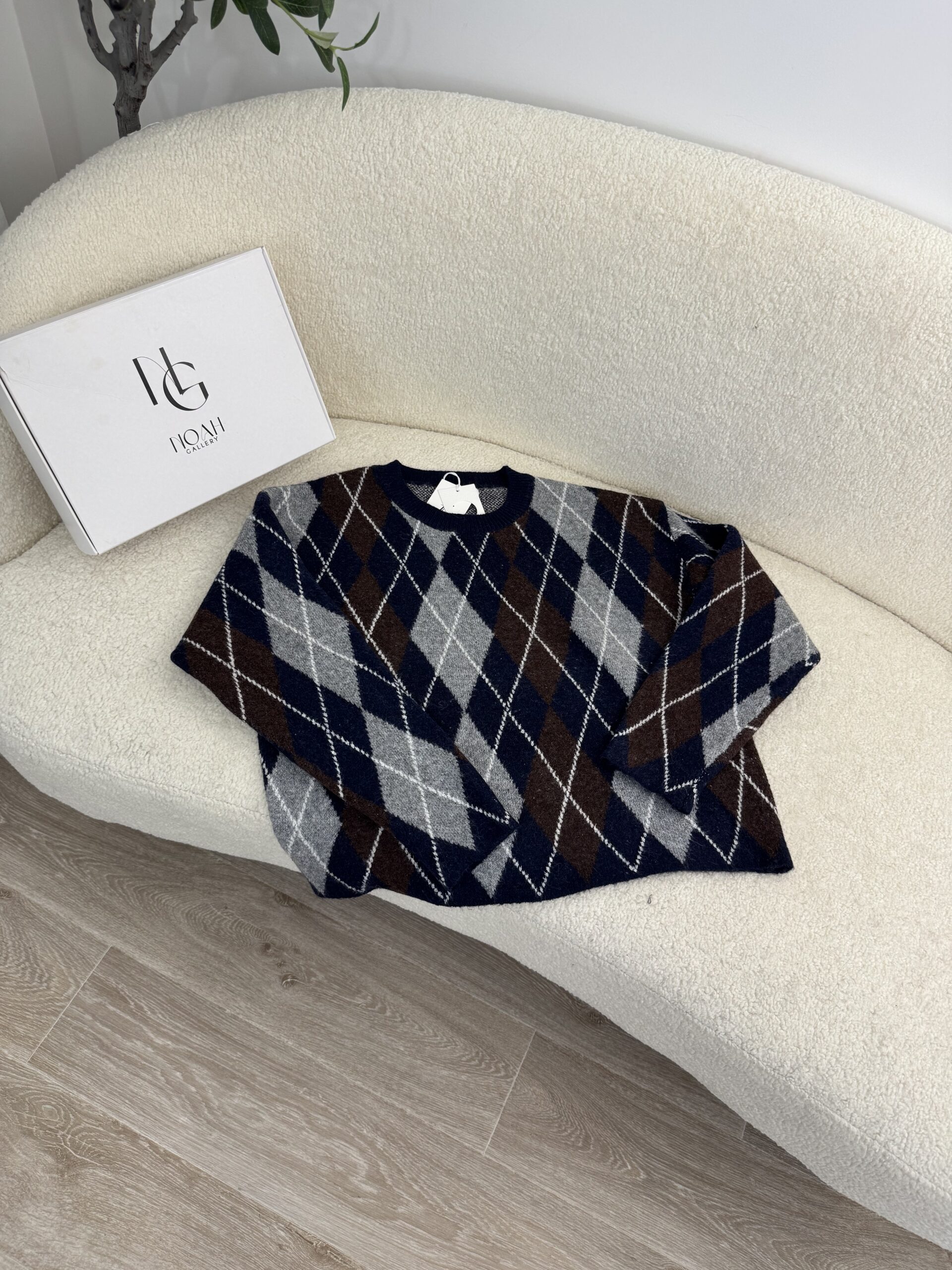 Pull en maille jacquard aux tons bleu et gris, alliant élégance et confort. Son motif jacquard apporte une touche graphique et chaleureuse, idéale pour la saison automne-hiver. Confectionné dans une maille douce et agréable à porter, il se marie parfaitement avec un jean, une jupe ou un pantalon pour un look à la fois casual et soigné.