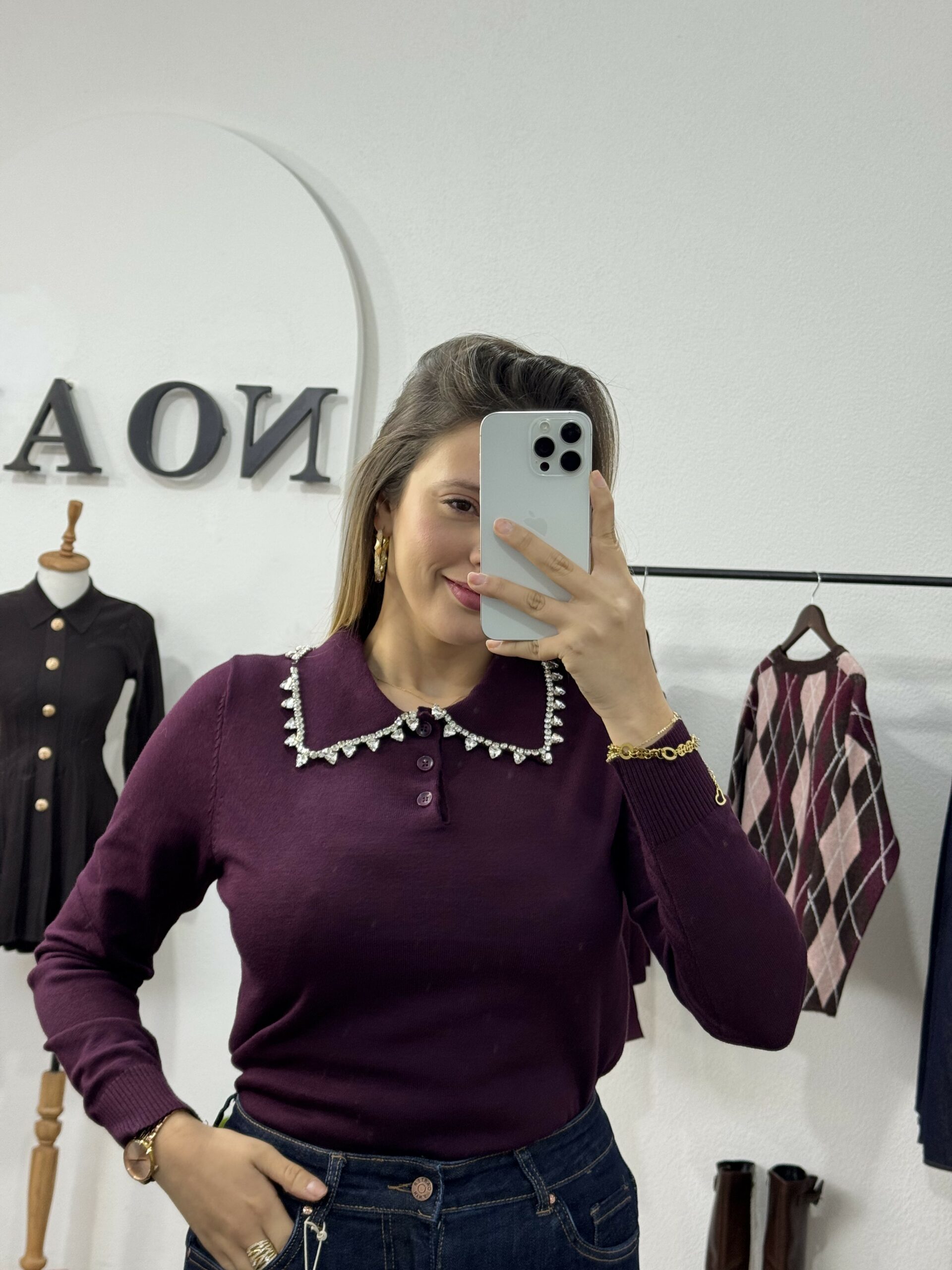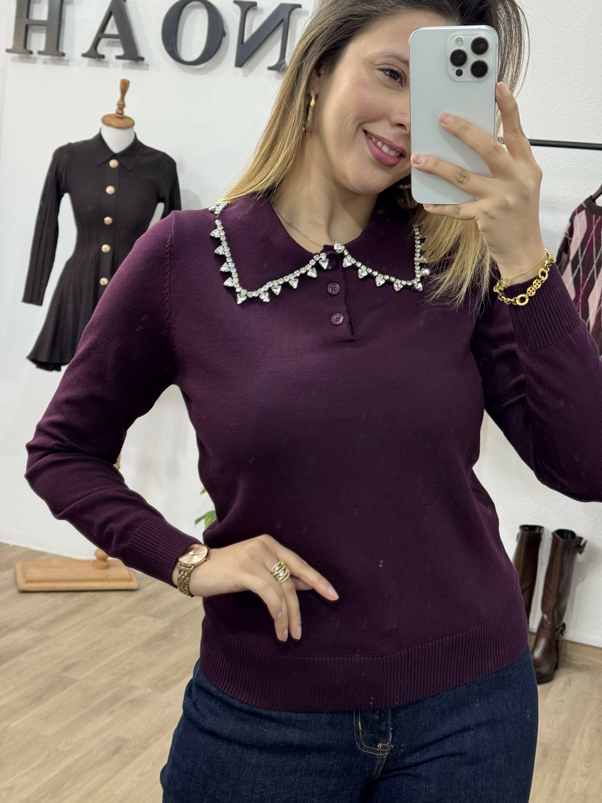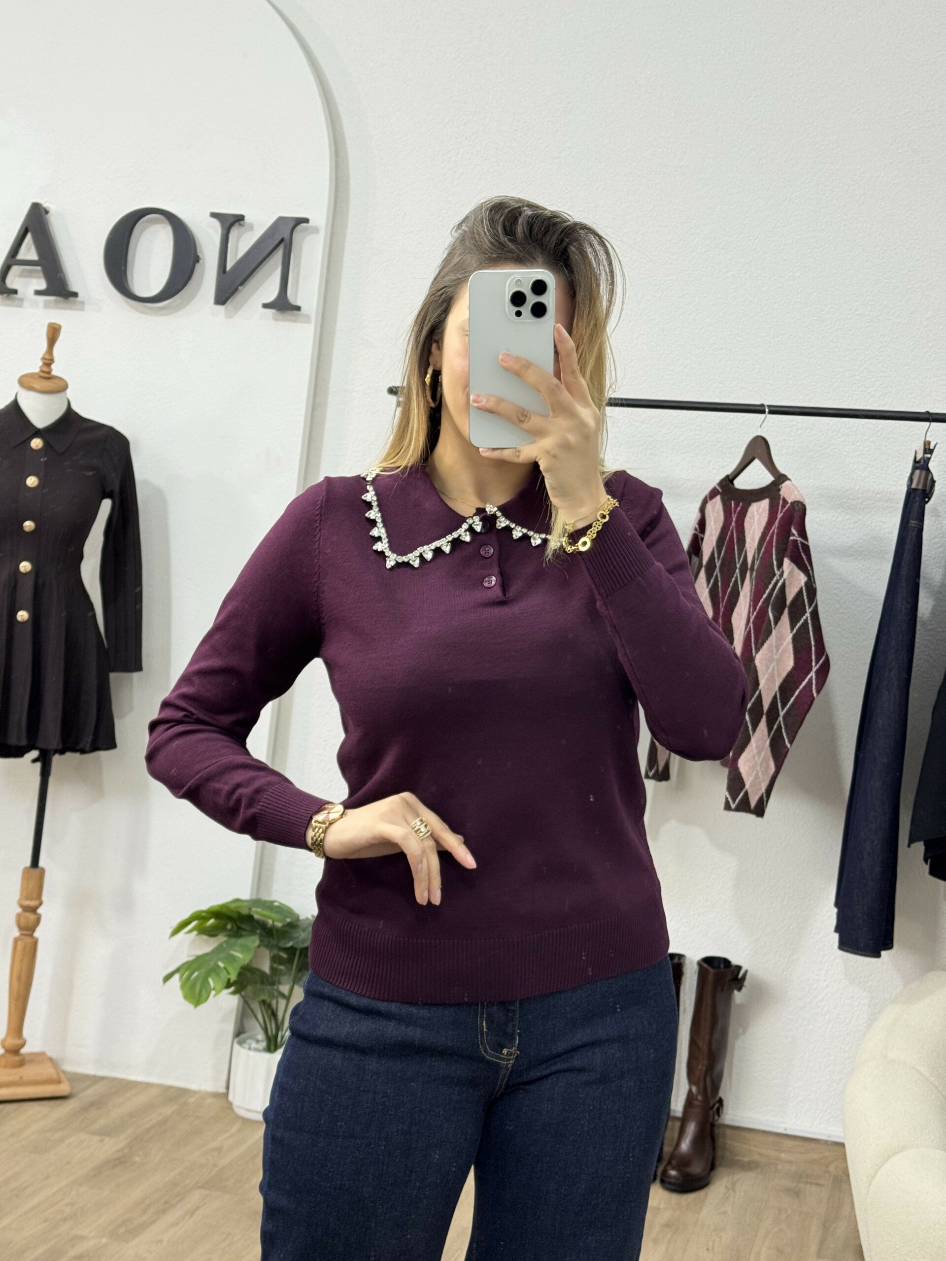Élégant et raffiné, ce pull à col bijou est la pièce parfaite pour illuminer vos tenues d’automne-hiver. Confectionné dans une maille douce et confortable, il se distingue par son col orné de strass scintillants, apportant une touche de chic et de féminité à votre look. Facile à porter, il se marie aussi bien avec un pantalon habillé qu’une jupe fluide pour un style à la fois moderne et sophistiqué. Disponible en tons intemporels et profonds, ce pull sublime la silhouette tout en ajoutant une note d’éclat à votre garde-robe.