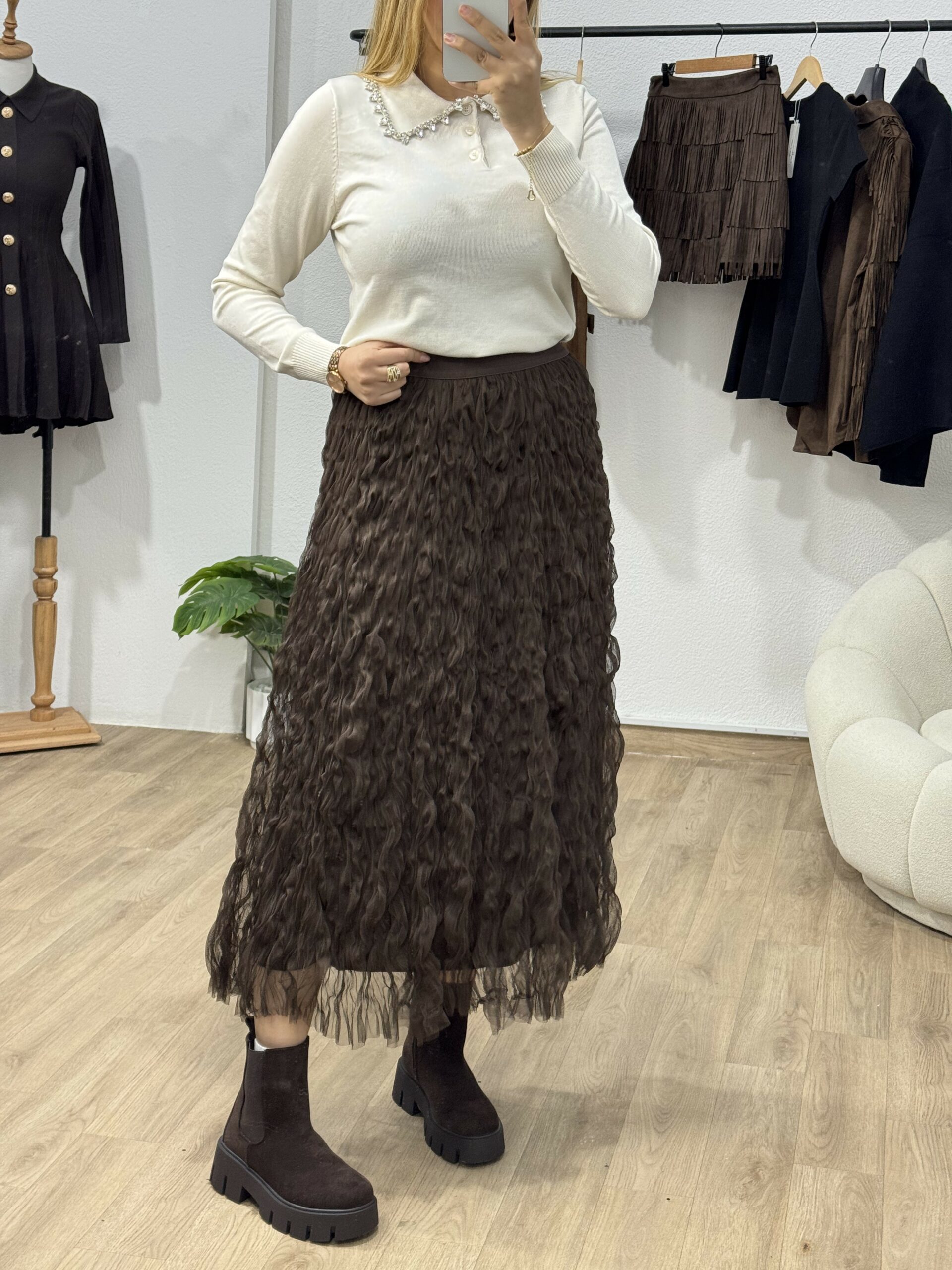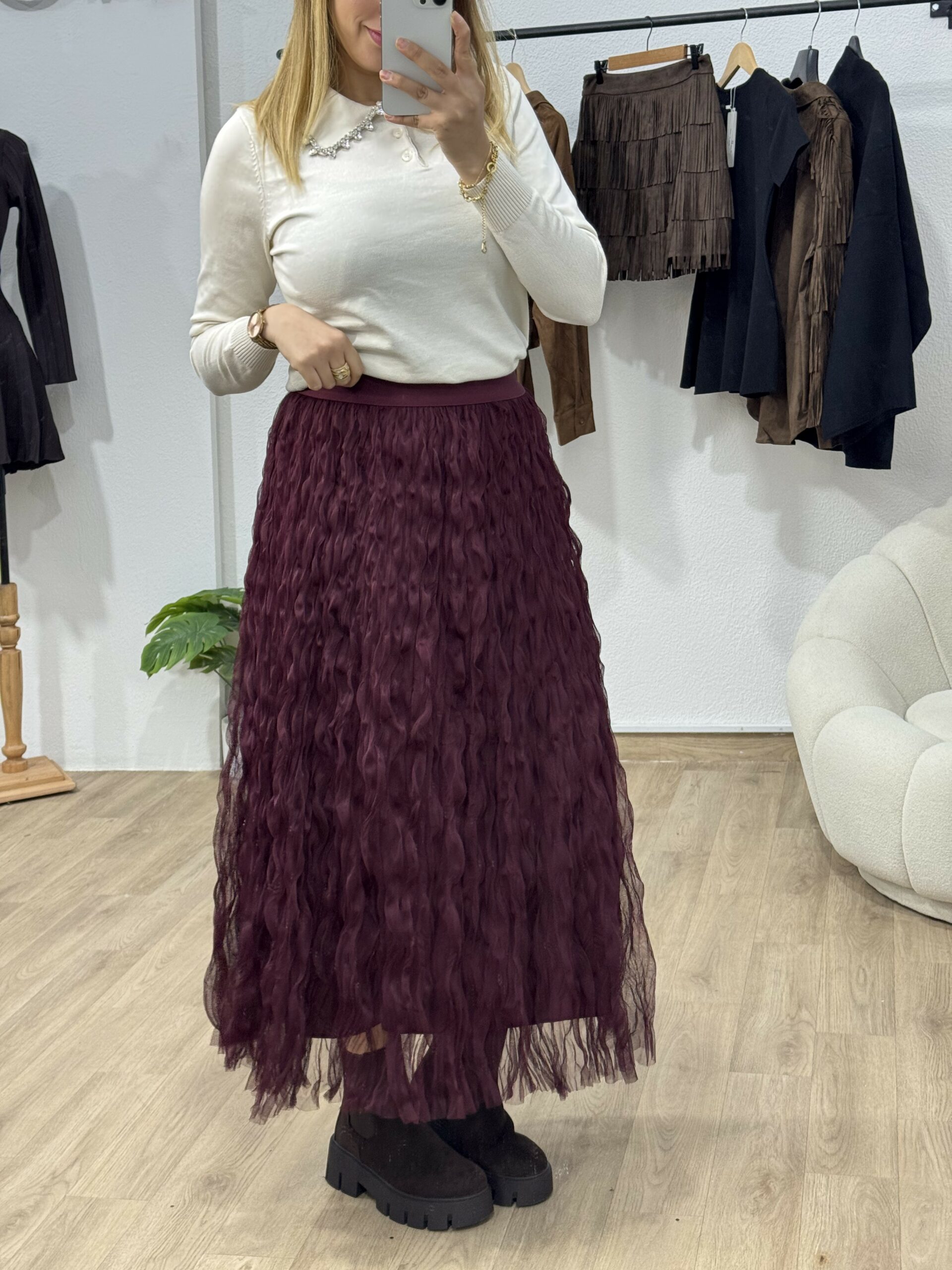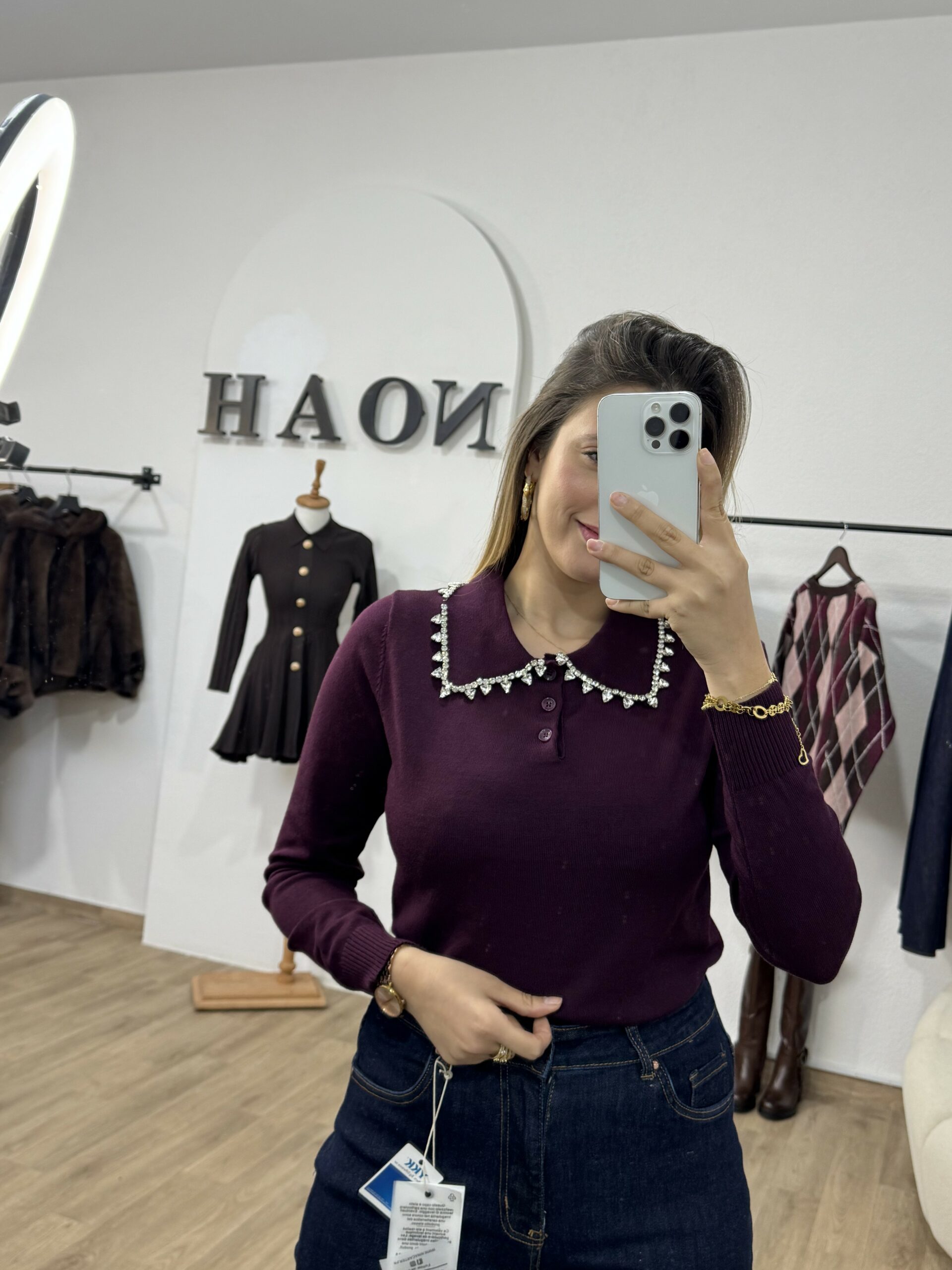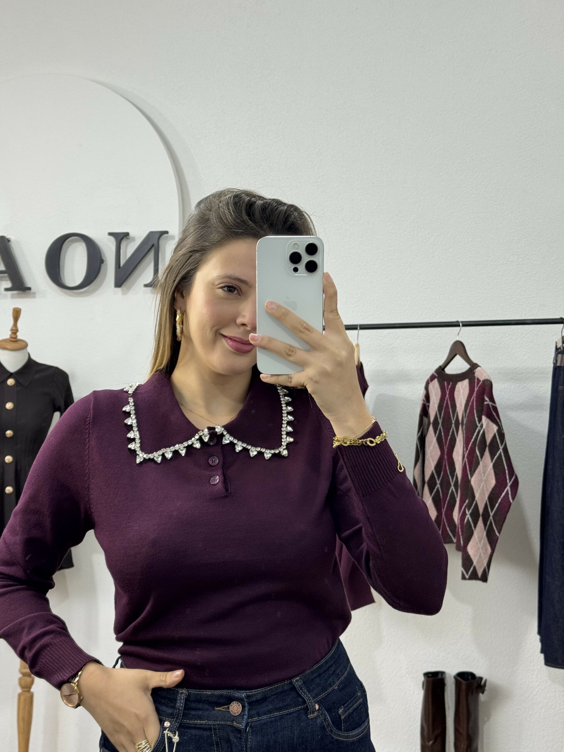 Élégant et raffiné, ce pull à col bijou est la pièce parfaite pour illuminer vos tenues d’automne-hiver. Confectionné dans une maille douce et confortable, il se distingue par son col orné de strass scintillants, apportant une touche de chic et de féminité à votre look. Facile à porter, il se marie aussi bien avec un pantalon habillé qu’une jupe fluide pour un style à la fois moderne et sophistiqué. Disponible en tons intemporels et profonds, ce pull sublime la silhouette tout en ajoutant une note d’éclat à votre garde-robe.