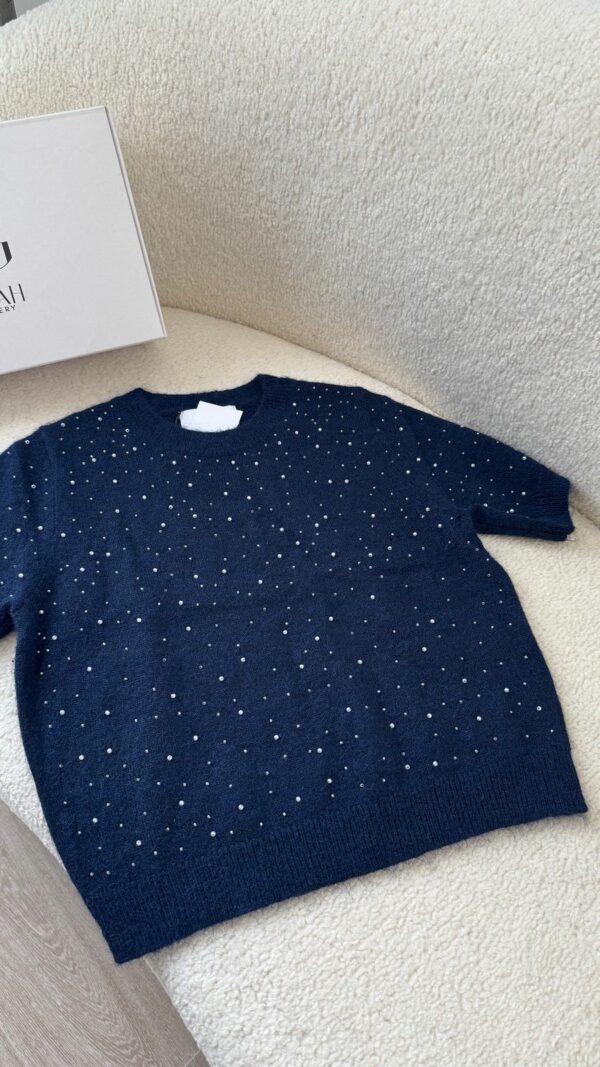 Plonge dans l’élégance discrète de ce pull bleu orné de petites perles scintillantes, une pièce qui allie douceur et raffinement. Son tissu confortable et légèrement extensible épouse la silhouette tout en offrant une agréable sensation de chaleur. Les perles délicatement disposées rappellent un ciel étoilé, apportant une touche de brillance à ton look du quotidien. Idéal pour un style chic et moderne, il se porte aussi bien avec un jean qu’une jupe élégante, pour un effet à la fois simple et sophistiqué.