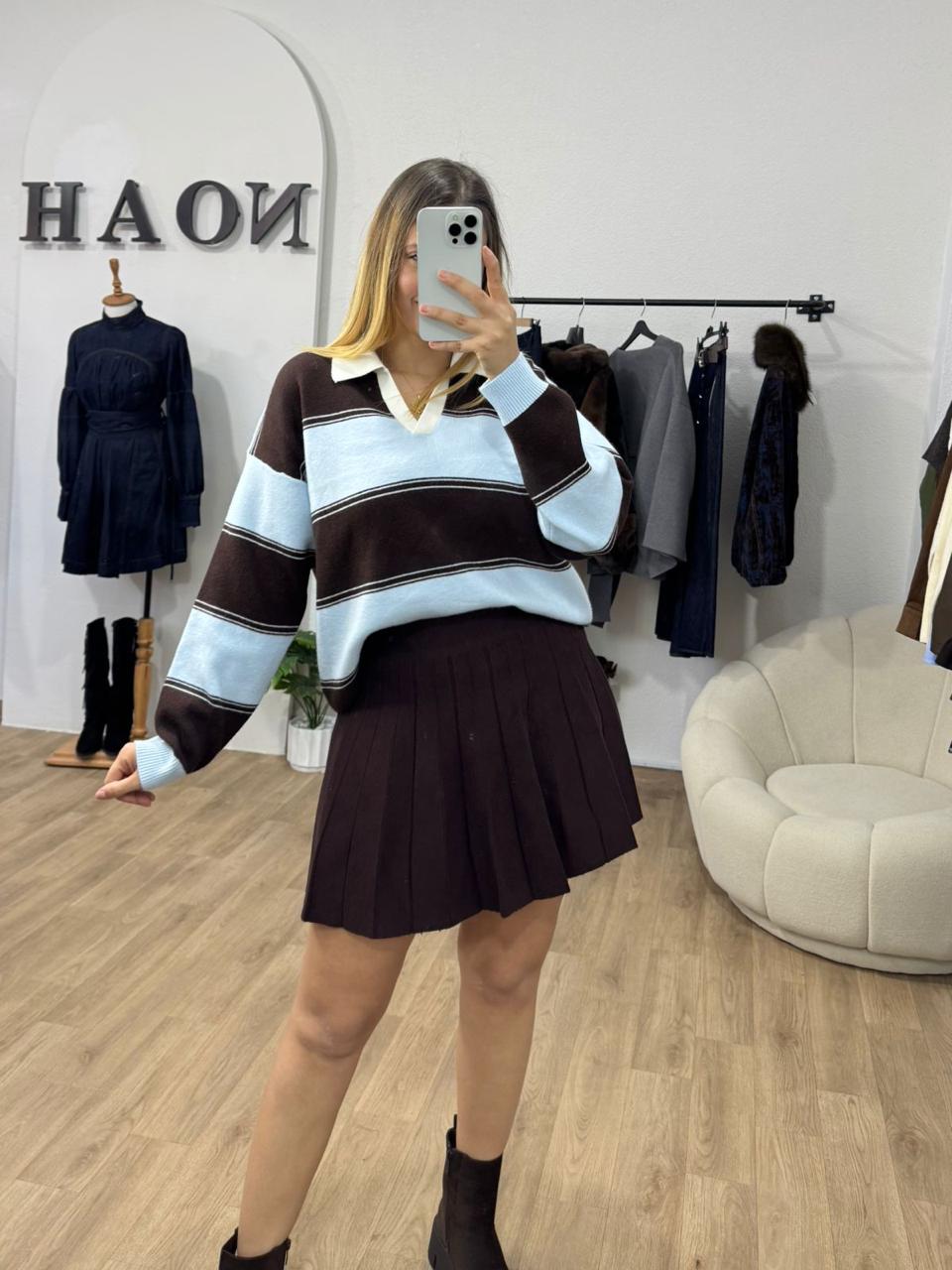 Ce pull à rayures apporte une touche à la fois chic et décontractée grâce à son mélange harmonieux de bleu ciel et de marron chocolat. Conçu dans une maille douce et confortable, il se distingue par son col chemise écru qui ajoute une note élégante et tendance. Facile à porter au quotidien, il offre une coupe ample qui convient à toutes les morphologies, parfait pour un look moderne et cosy à la fois.