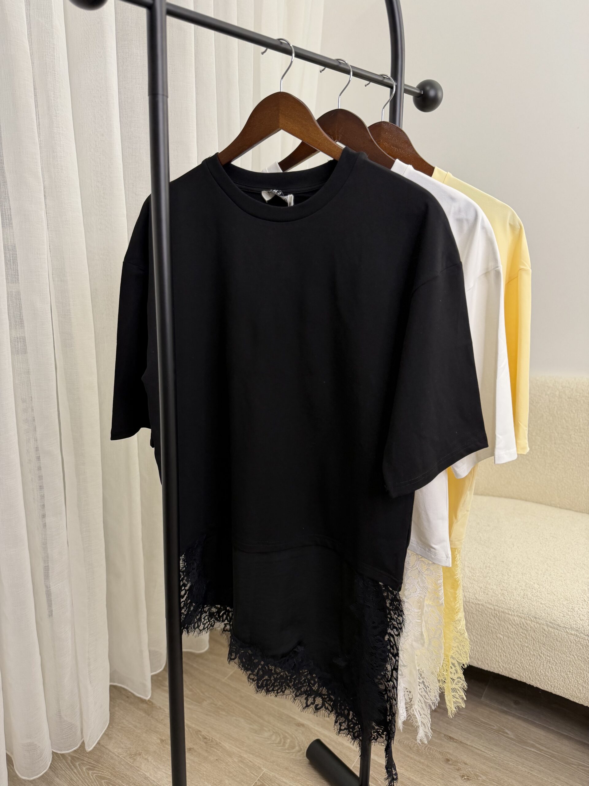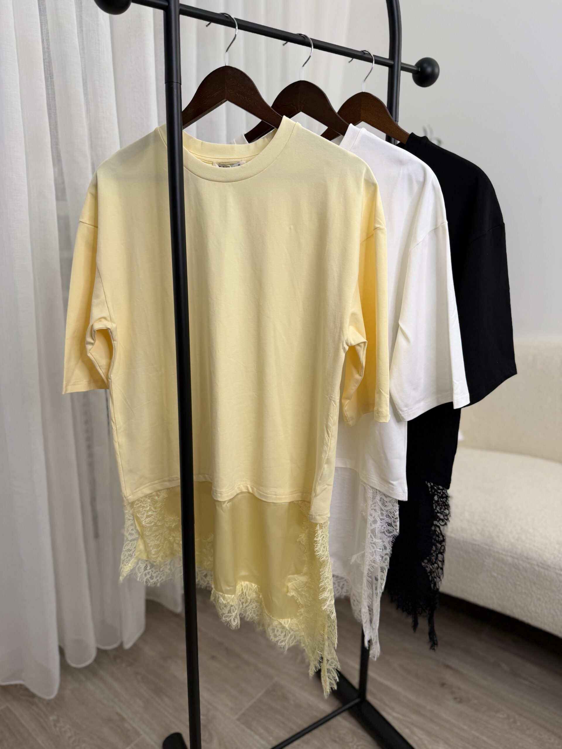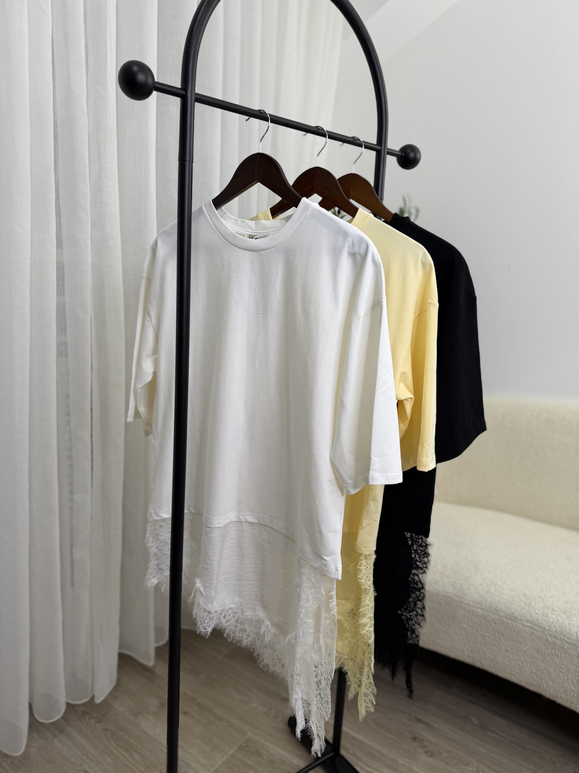 Pull léger style t-shirt à la coupe fluide, sublimé par une finition dentelle délicate sur le bas pour une touche féminine et élégante. Facile à associer, il se porte aussi bien avec un jean qu’un pantalon habillé.
