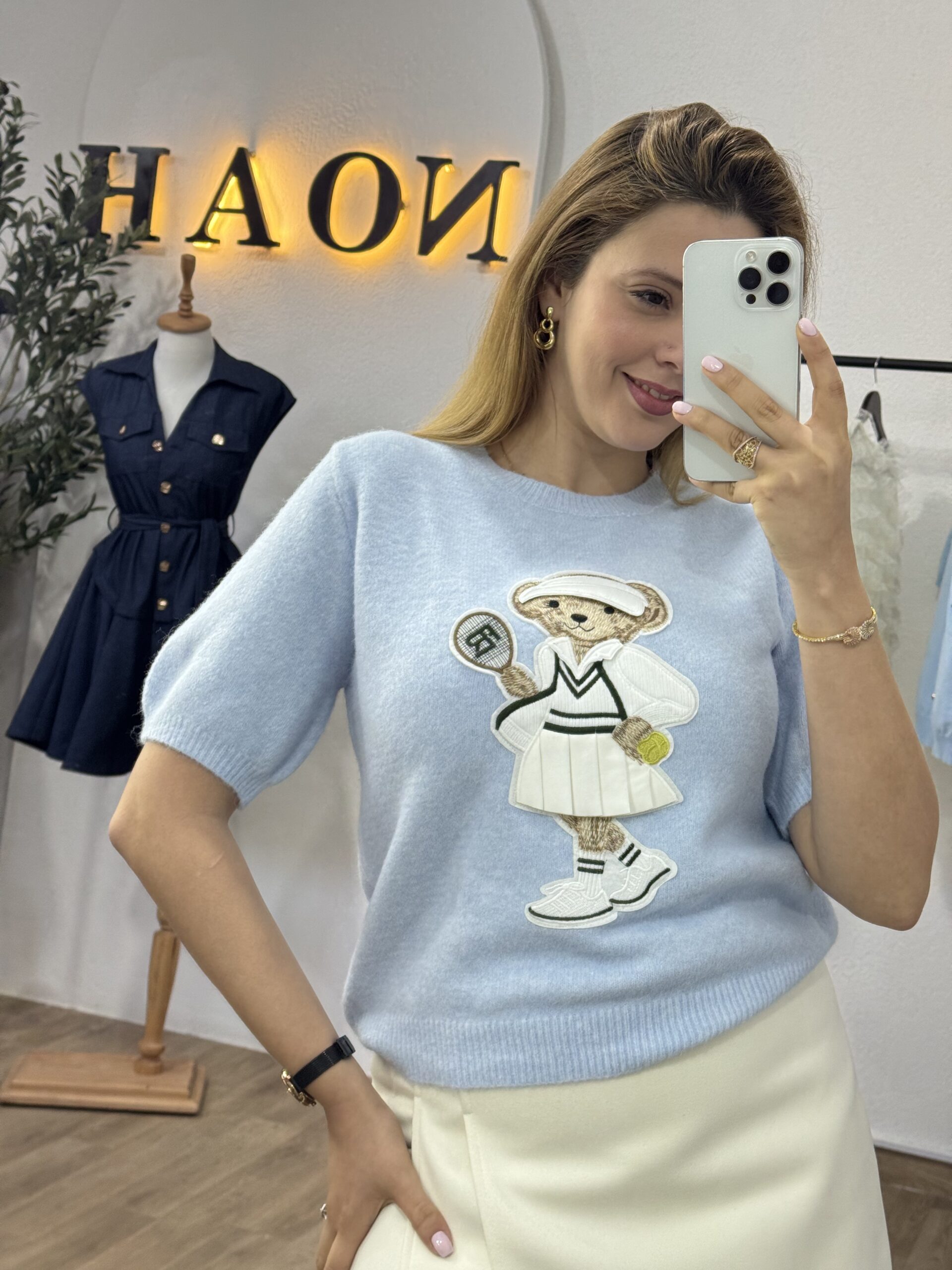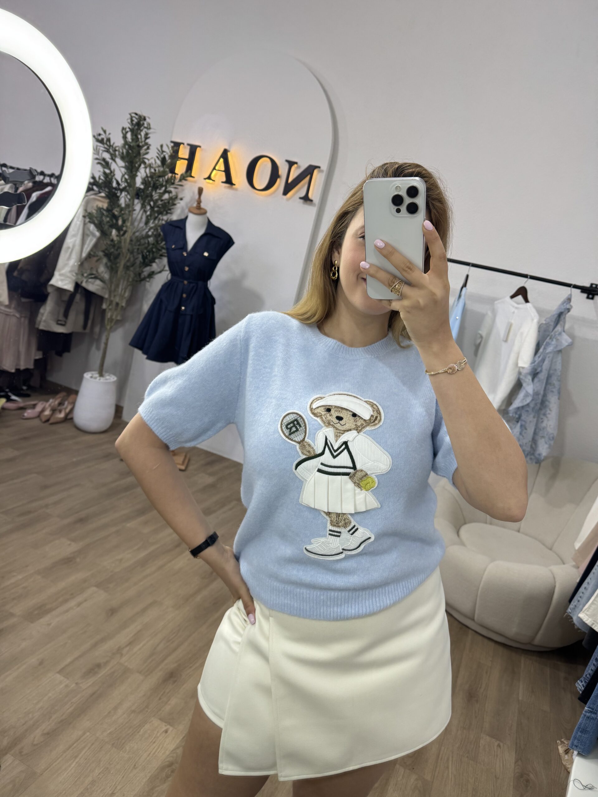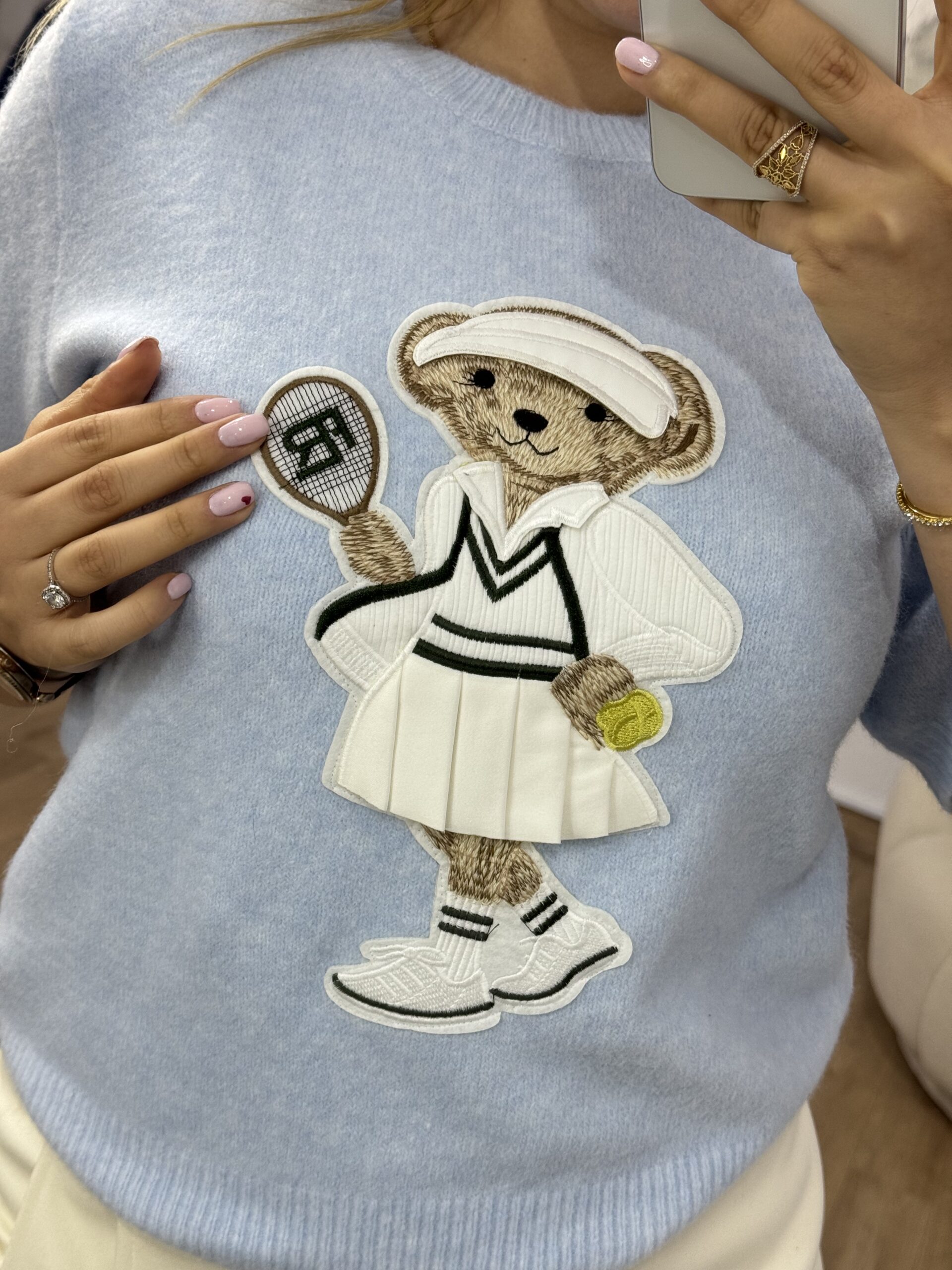 Pull doux et confortable au style casual chic, décoré d’un adorable motif teddy joueur de tennis pour une touche tendance et originale. Sa coupe féminine et ses manches courtes offrent une silhouette élégante et facile à porter au quotidien. Confectionné dans une maille agréable, il se marie aussi bien avec une jupe qu’un pantalon pour un look raffiné et décontracté.